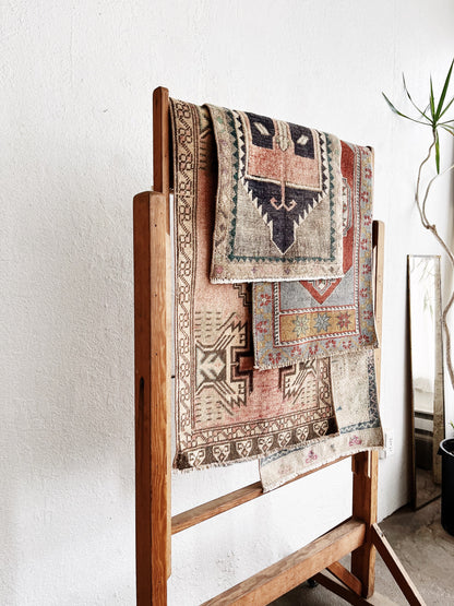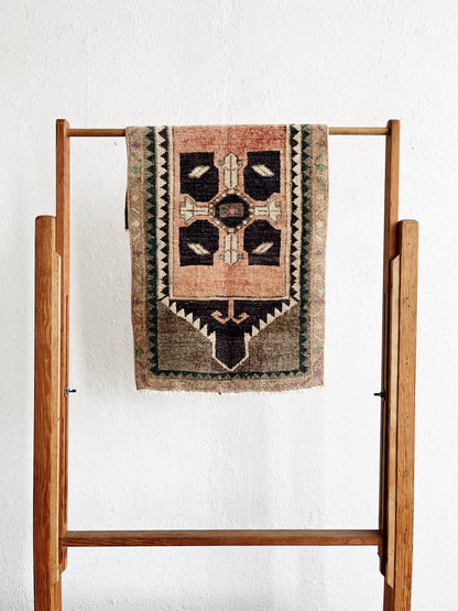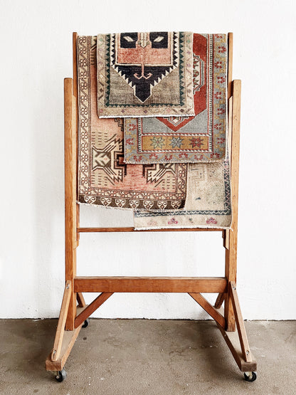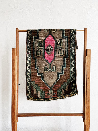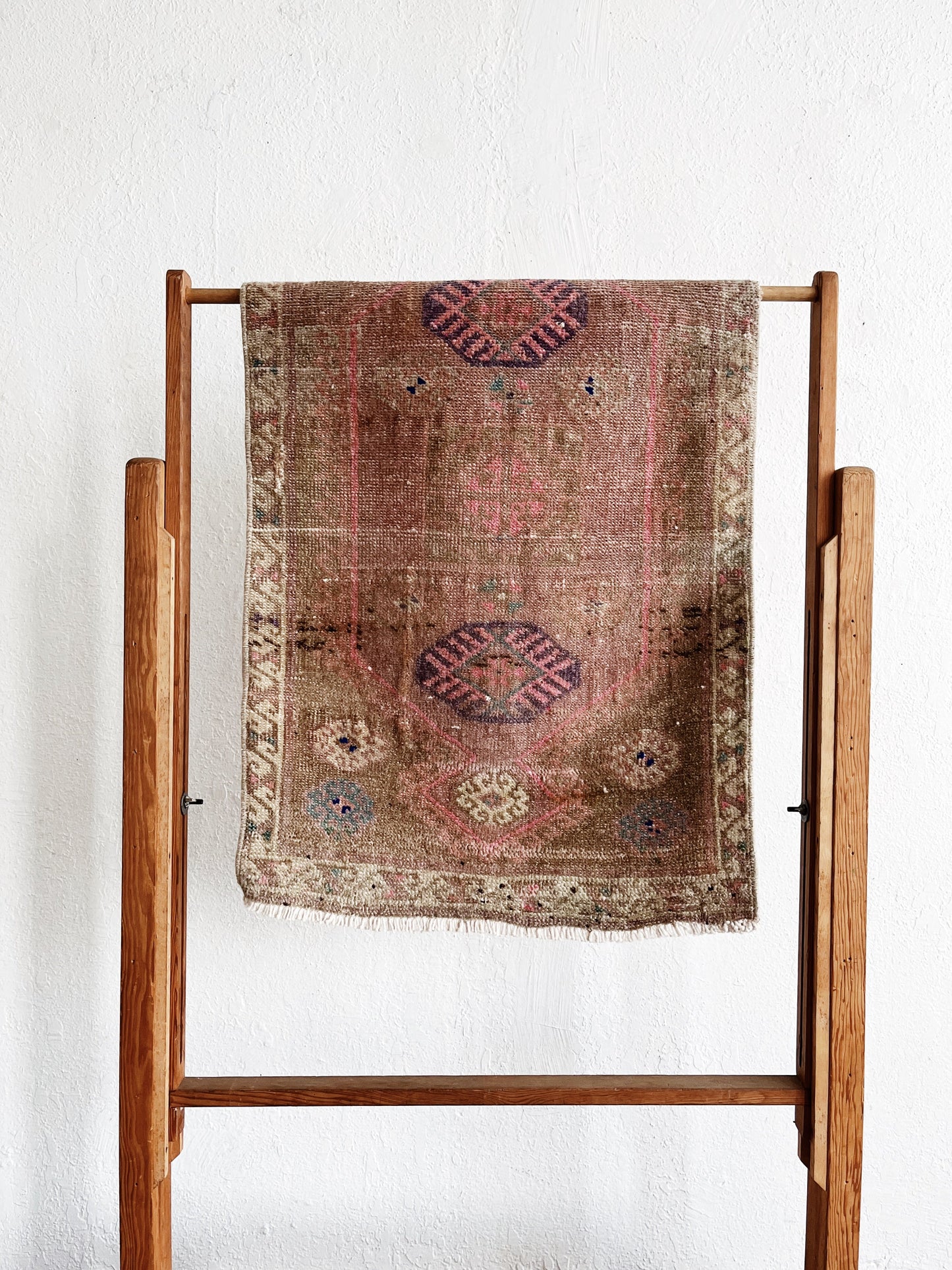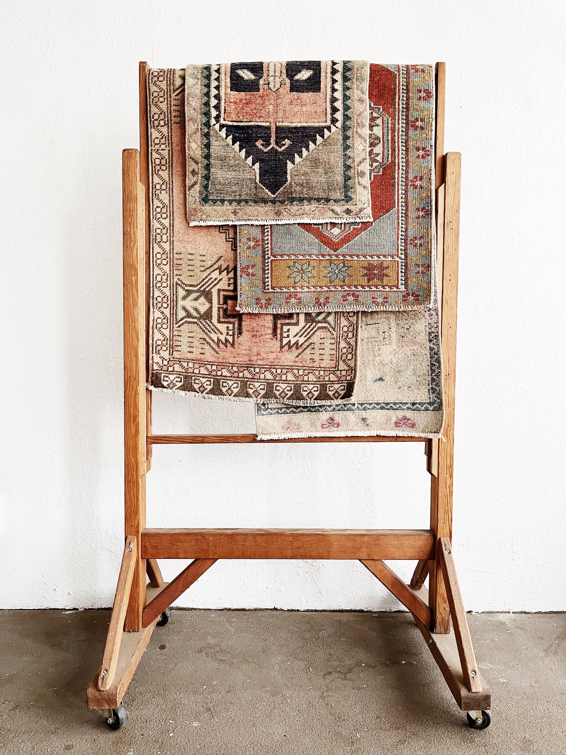 Vintage Turkish wool. Soft and thick underfoot with a medium flat pile. Reversible, with the opposite side being a little bit more dull in color but a nice choice for seasonal change ups. Perfectly sized for the bath or kitchen.