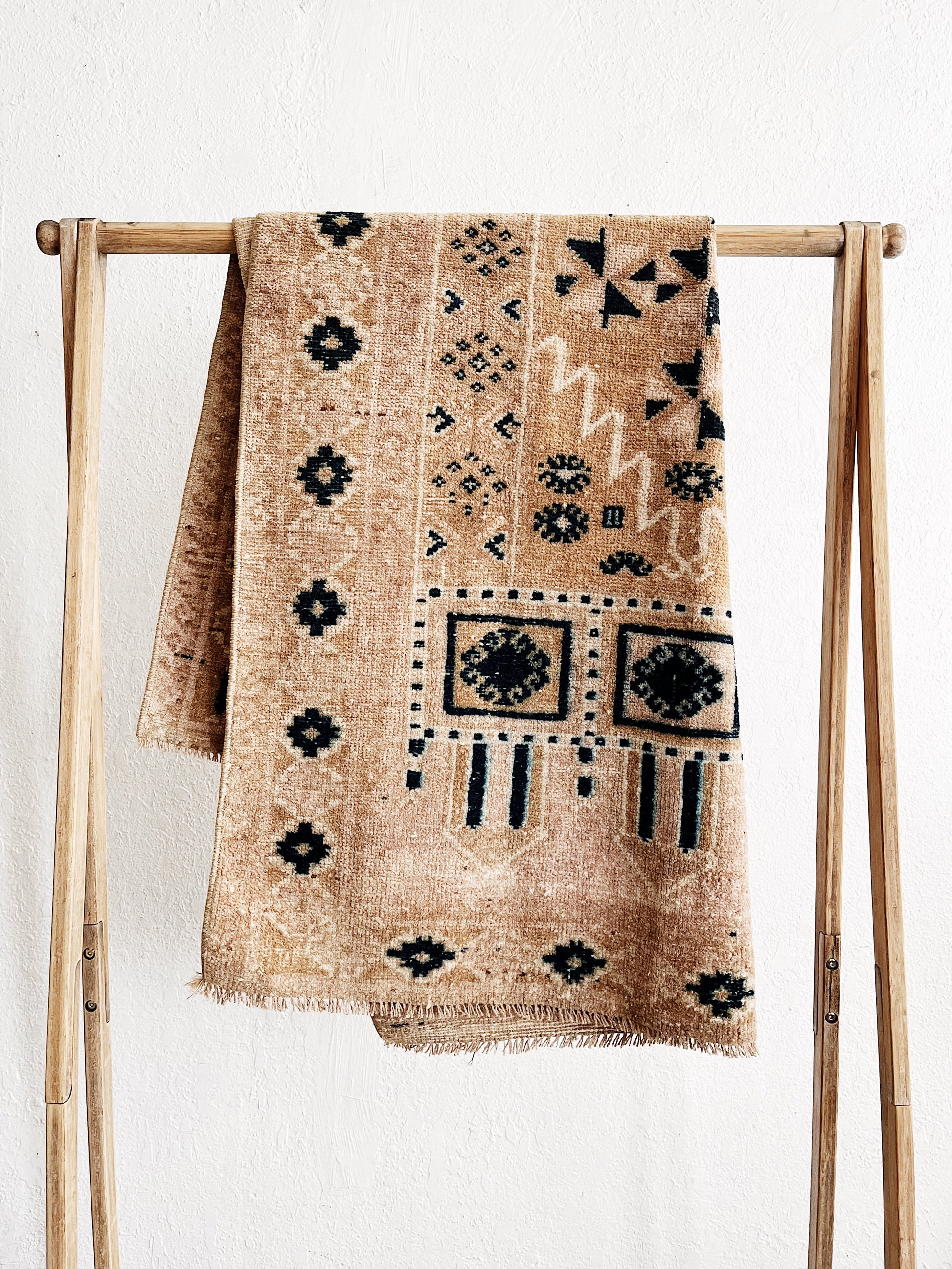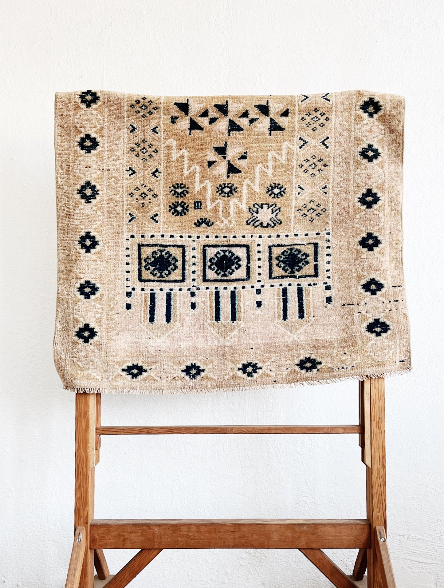 A really beautiful combination of grounded deep indigo blue and barely there pale lavender/pink all on a medium toned mushroom ground. Medium pile is very very soft underfoot. Immaculate condition on this one. Just a tad uneven on the hem but gives it the organic shape we love