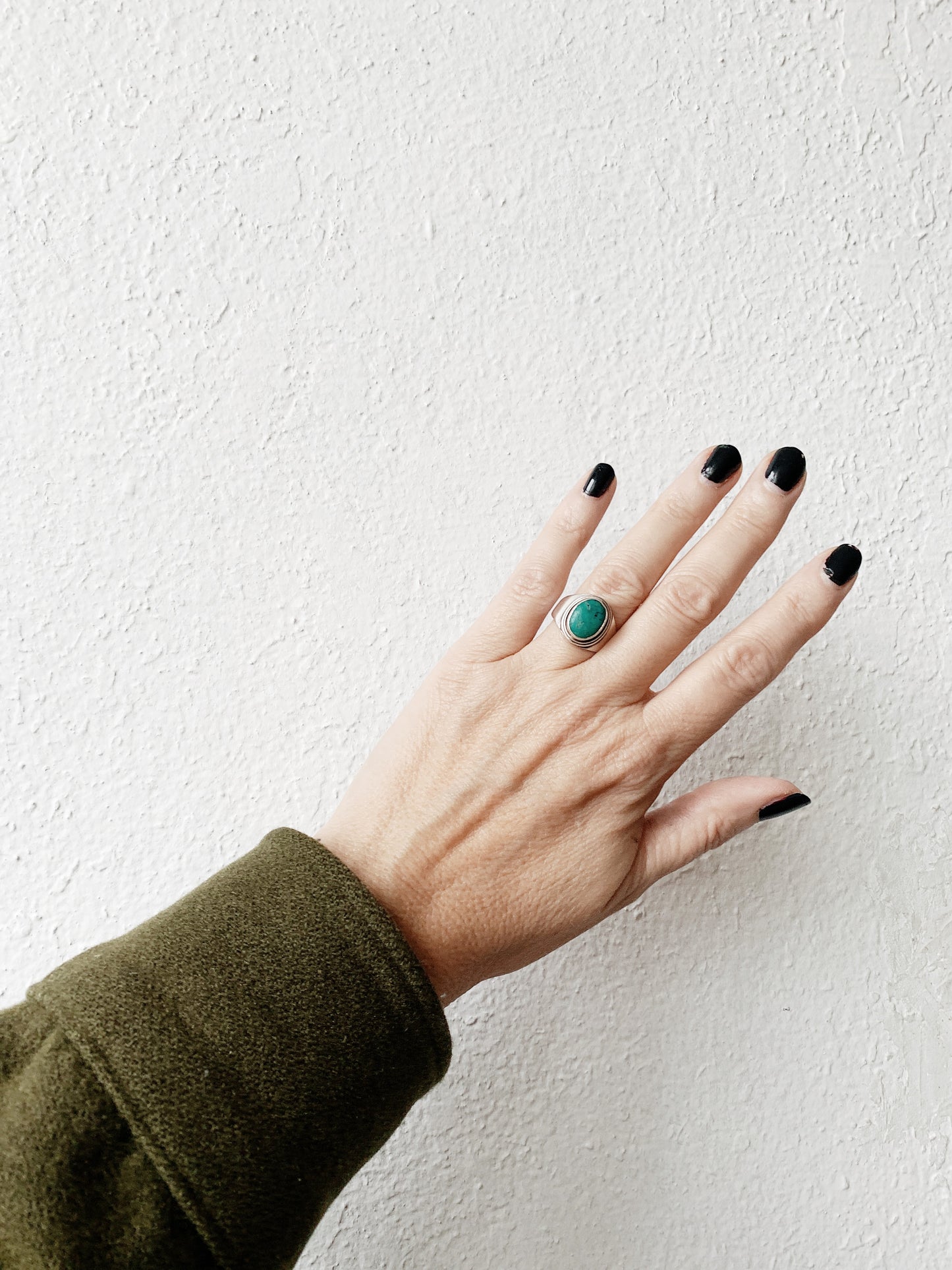 Vintage sterling silver with turquoise cabochon stone. A beauty. The perfect size for daily wear, not too big.