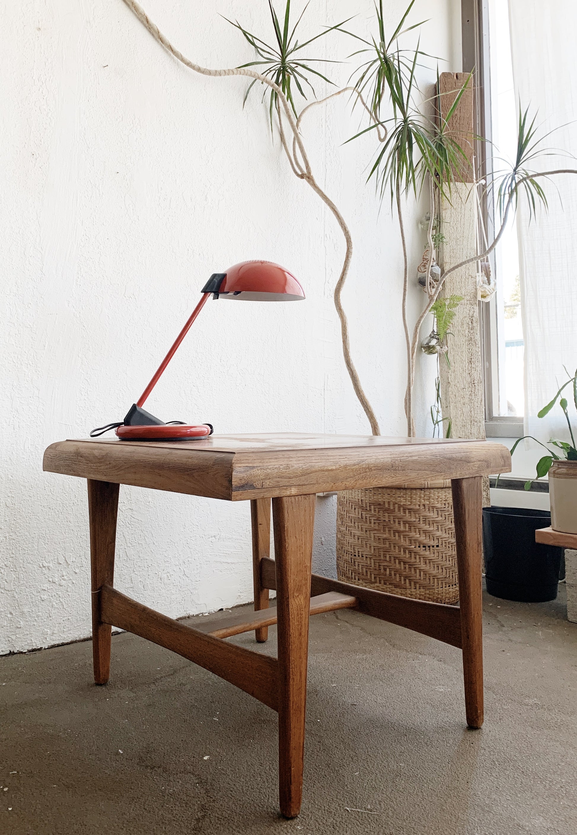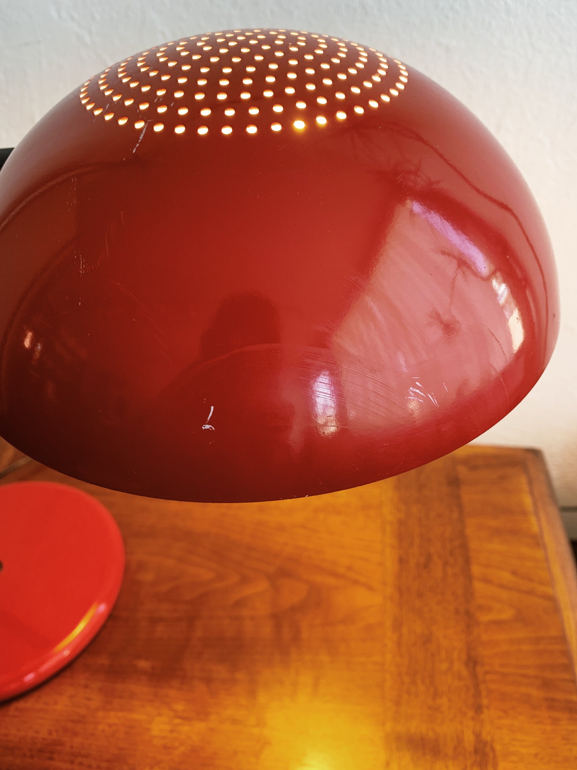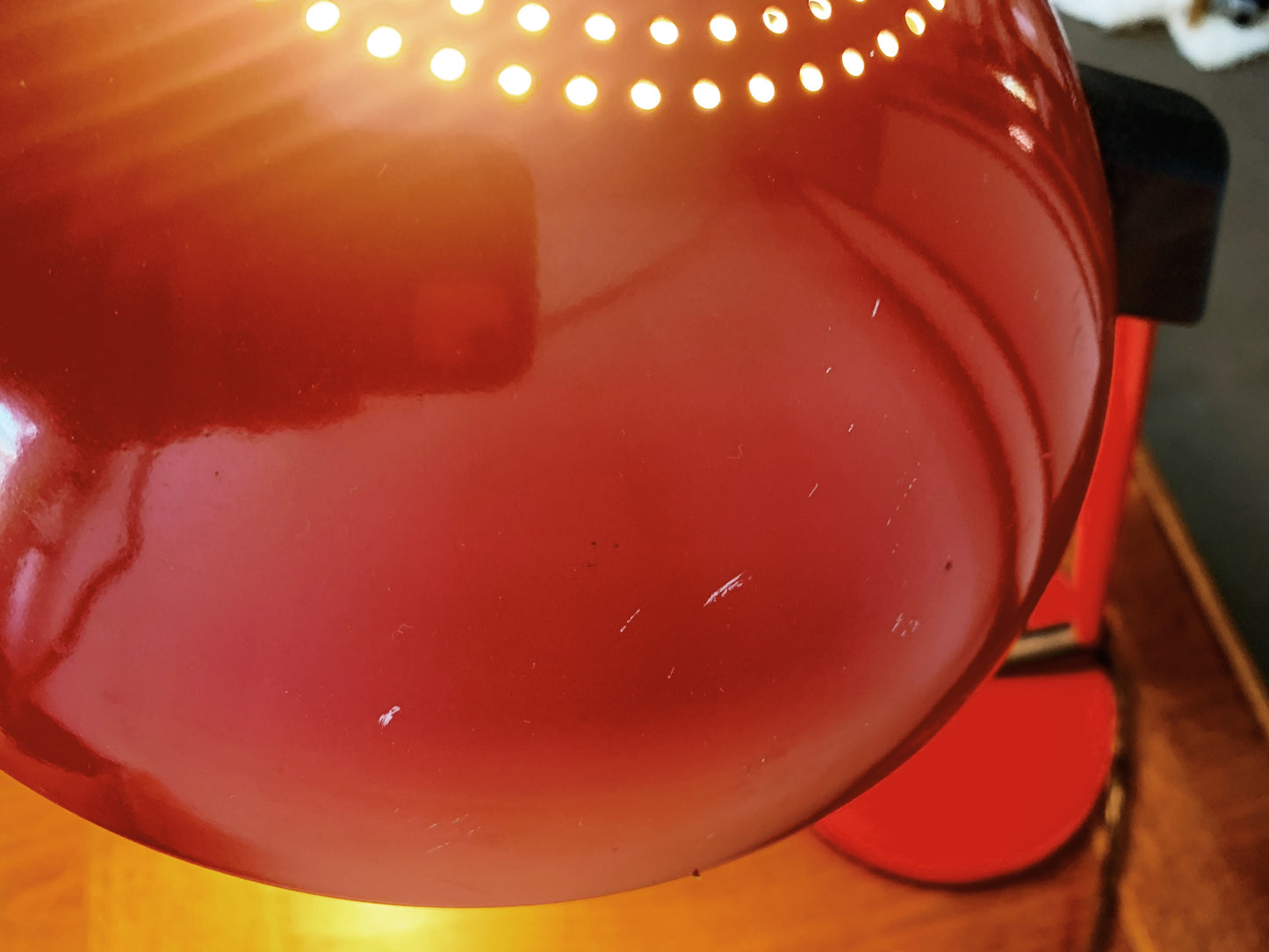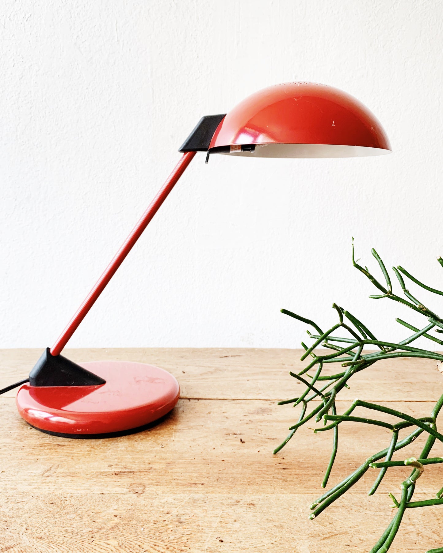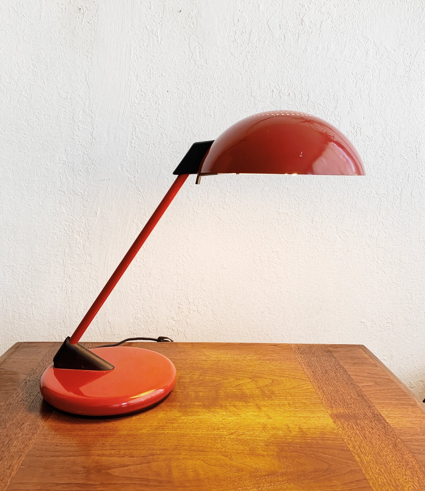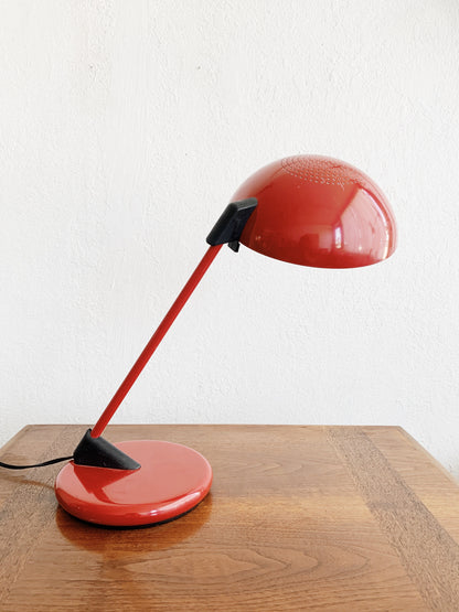 Great looking enamel task light by Underwriters Lab. Red with black, weighted base. Arm doesn’t move but the shade rotated. Takes a standard bulb. In great working order, a few marks to the paint. See photos