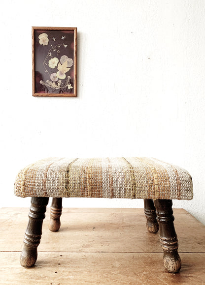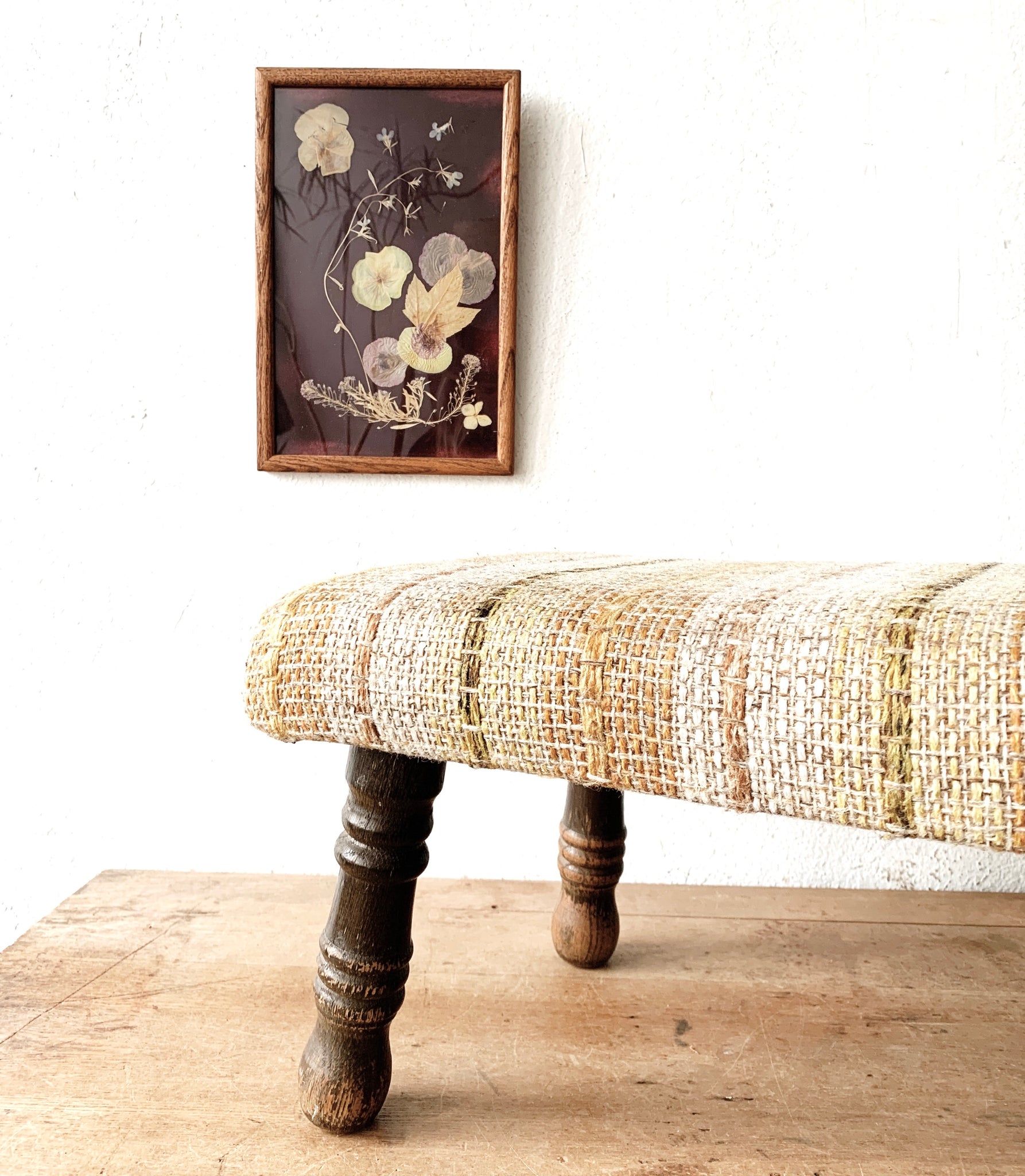 great little stool upholstered in tweedy 1970s’ fabric. Turned wood legs