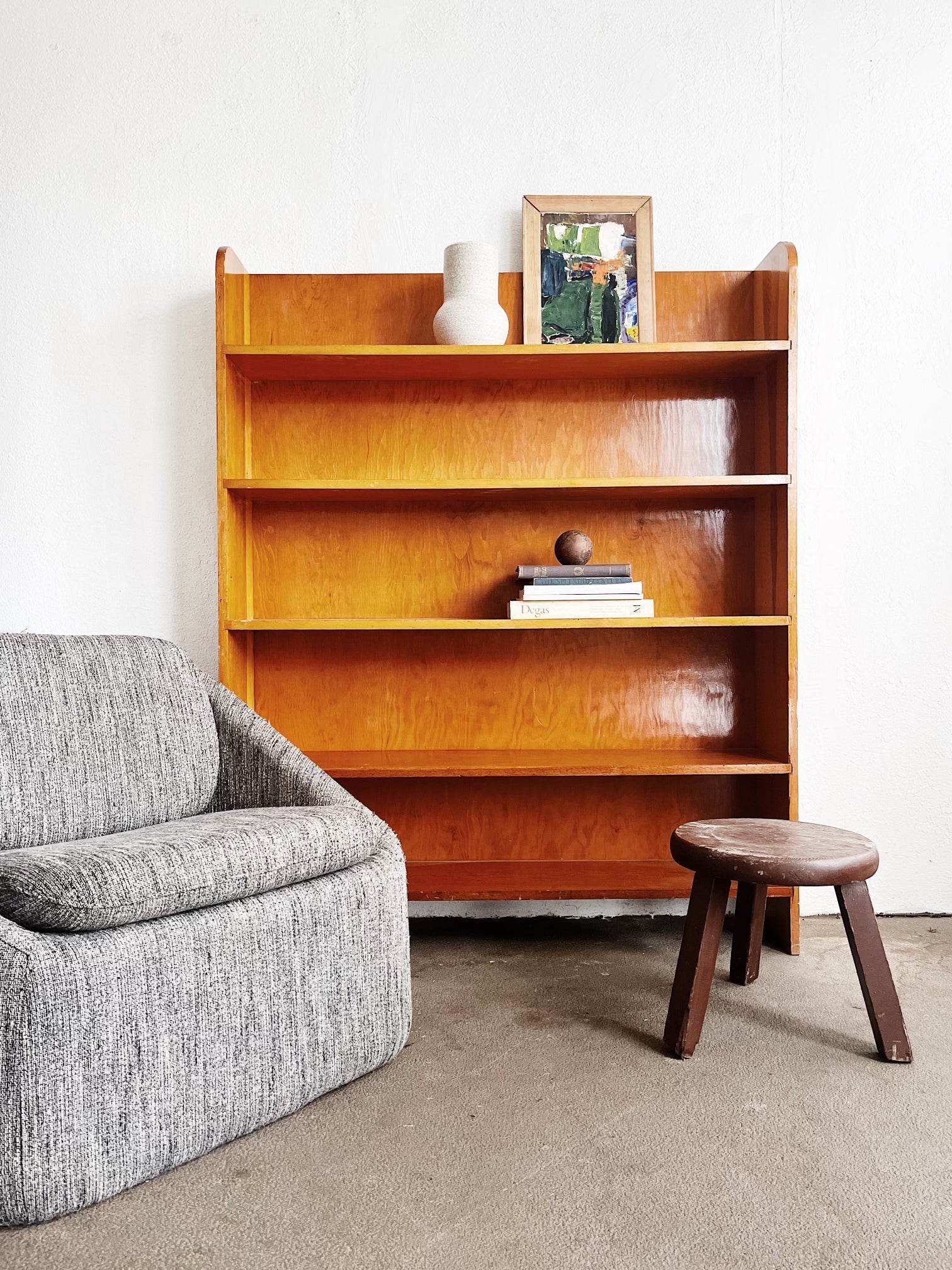 Such a great size! And overall look is excellent. Perfect for small spaces, low but not too narrow- it’s comfy to sit in. Overall in very nice shape, a few minor spots please see photo.