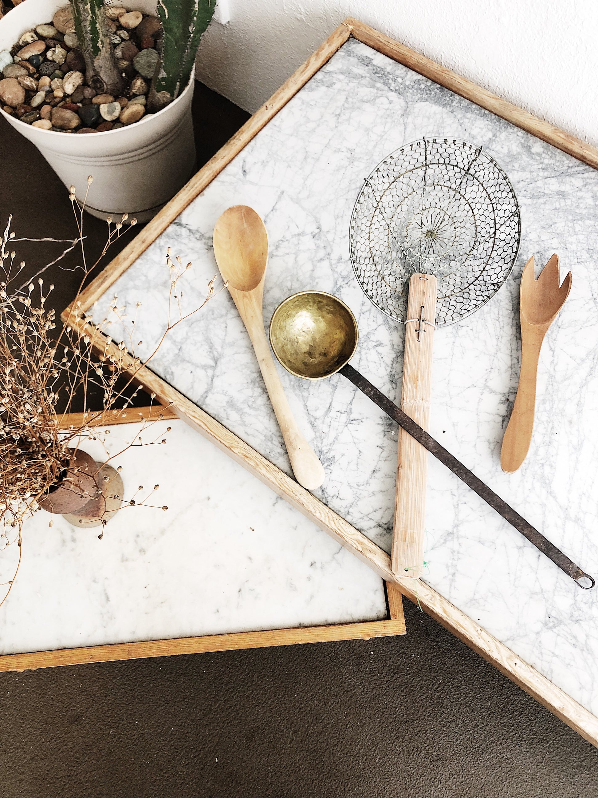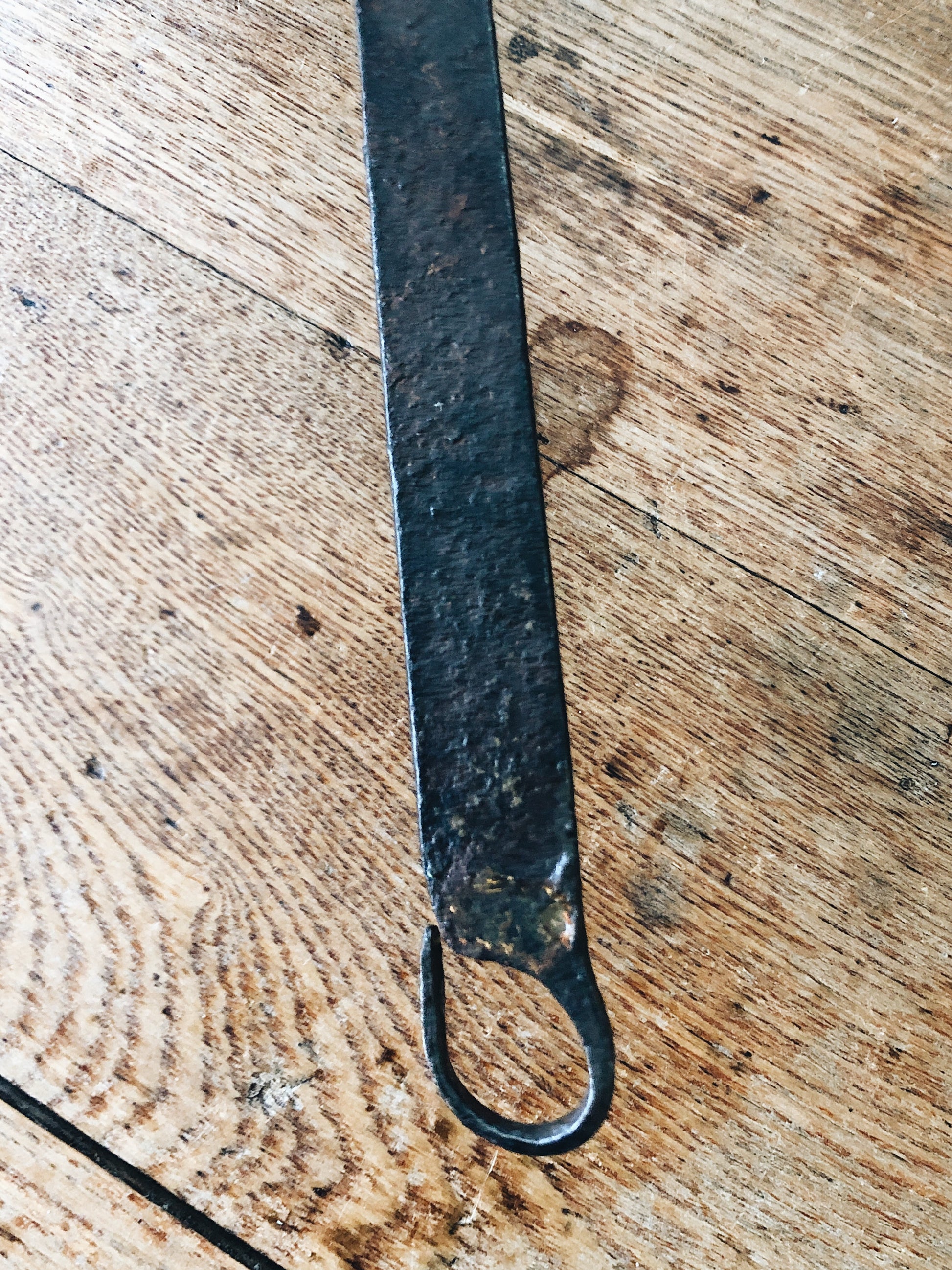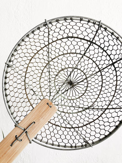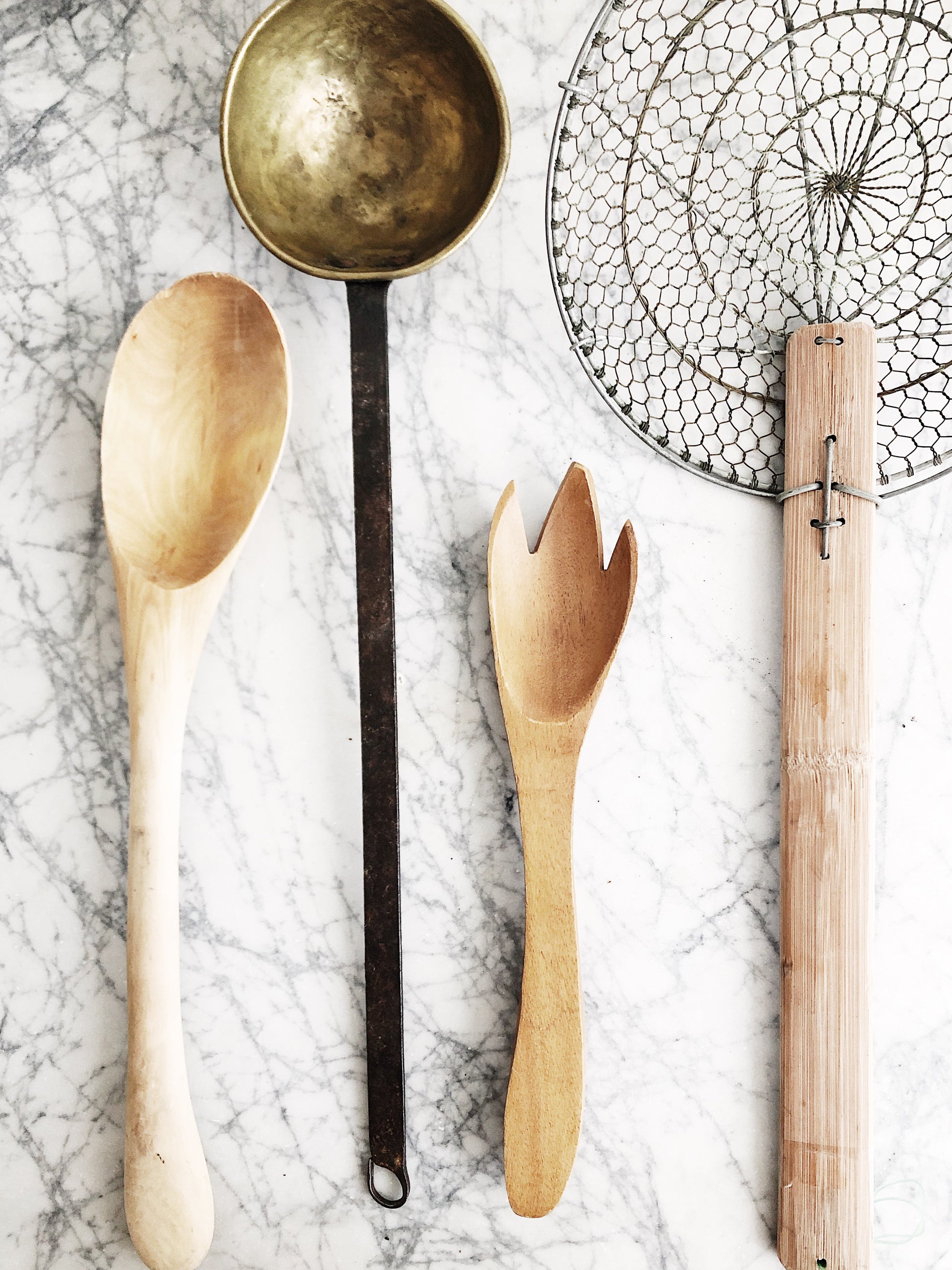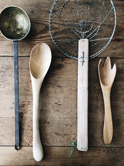 Love this collection of rustic kitchen utensils. Oversized wire strainer, forged copper ladle, oversized curved spoon and a quirky serving fork. Includes all four.