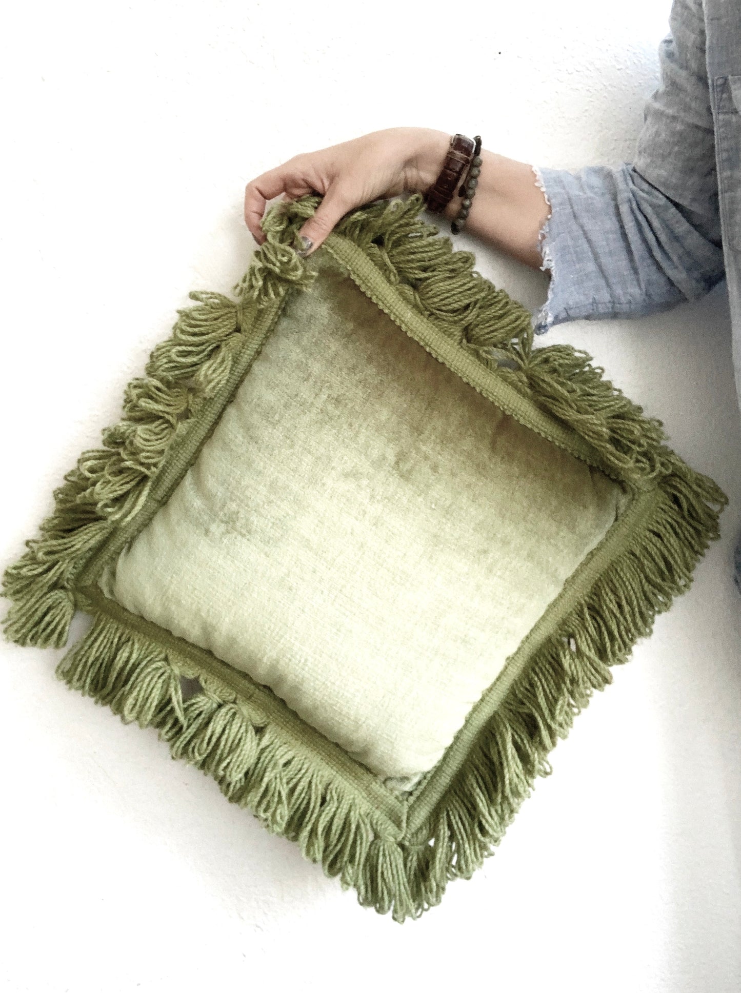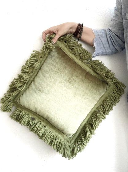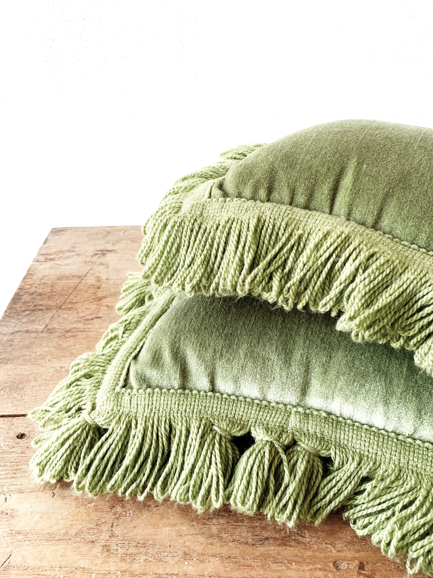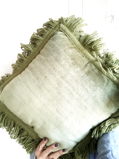 Vintage pea green velour toss pillow with fringe in excellent condition! Soft and fun :)