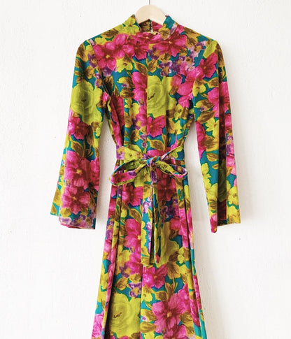 Amazing vintage floral velvet jumpsuit that appears to be professionally handmade. No label. In excellent condition! Zips up the back and comes with a matching belt. Chest cutout and green lace trim on the bottom of the legs. Super fun to wear!