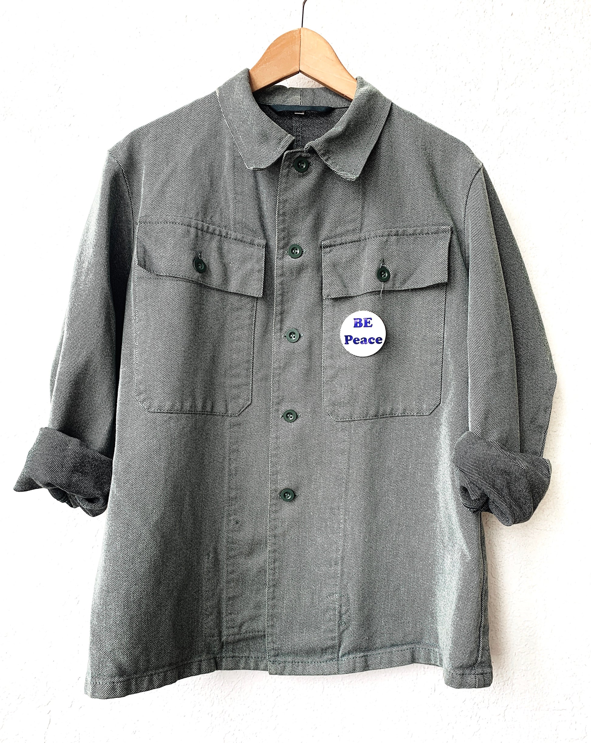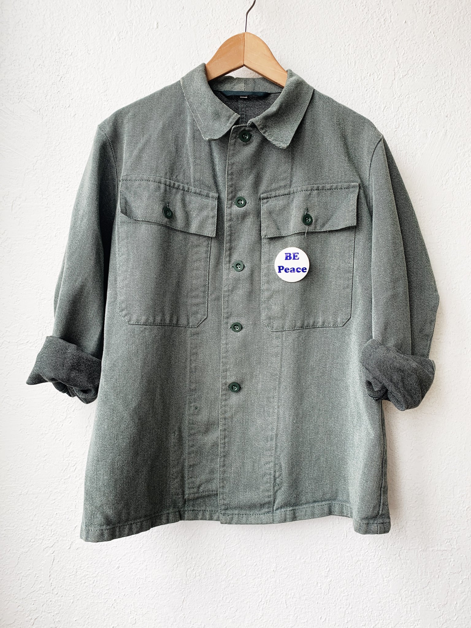 Vintage weighty military shirt jacket with pockets. Nice! Vintage military quality, in great shape, aside from a small mark under the peace pin.