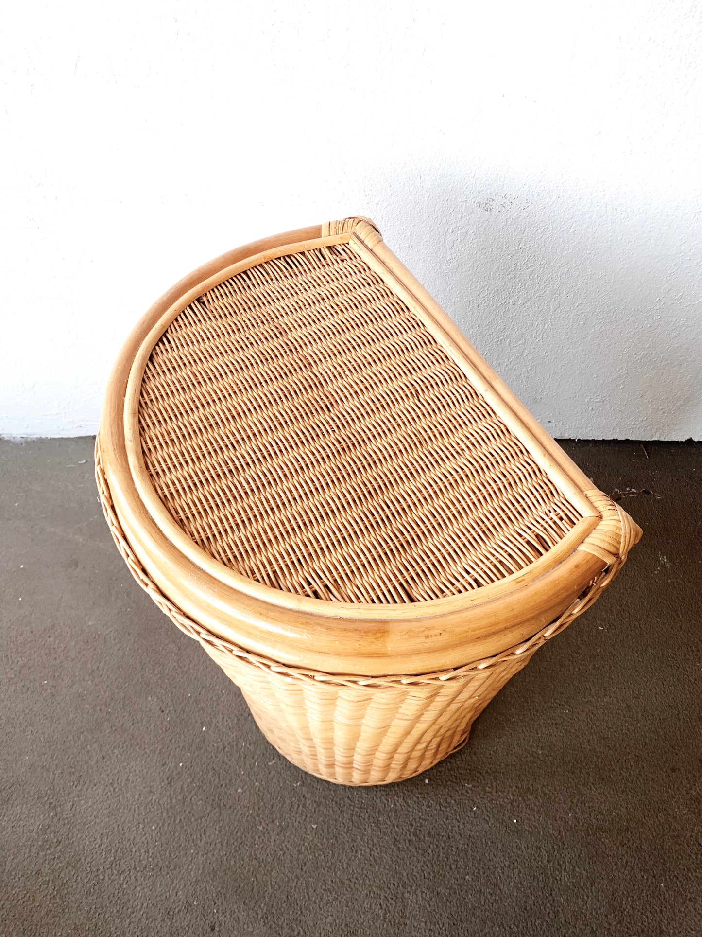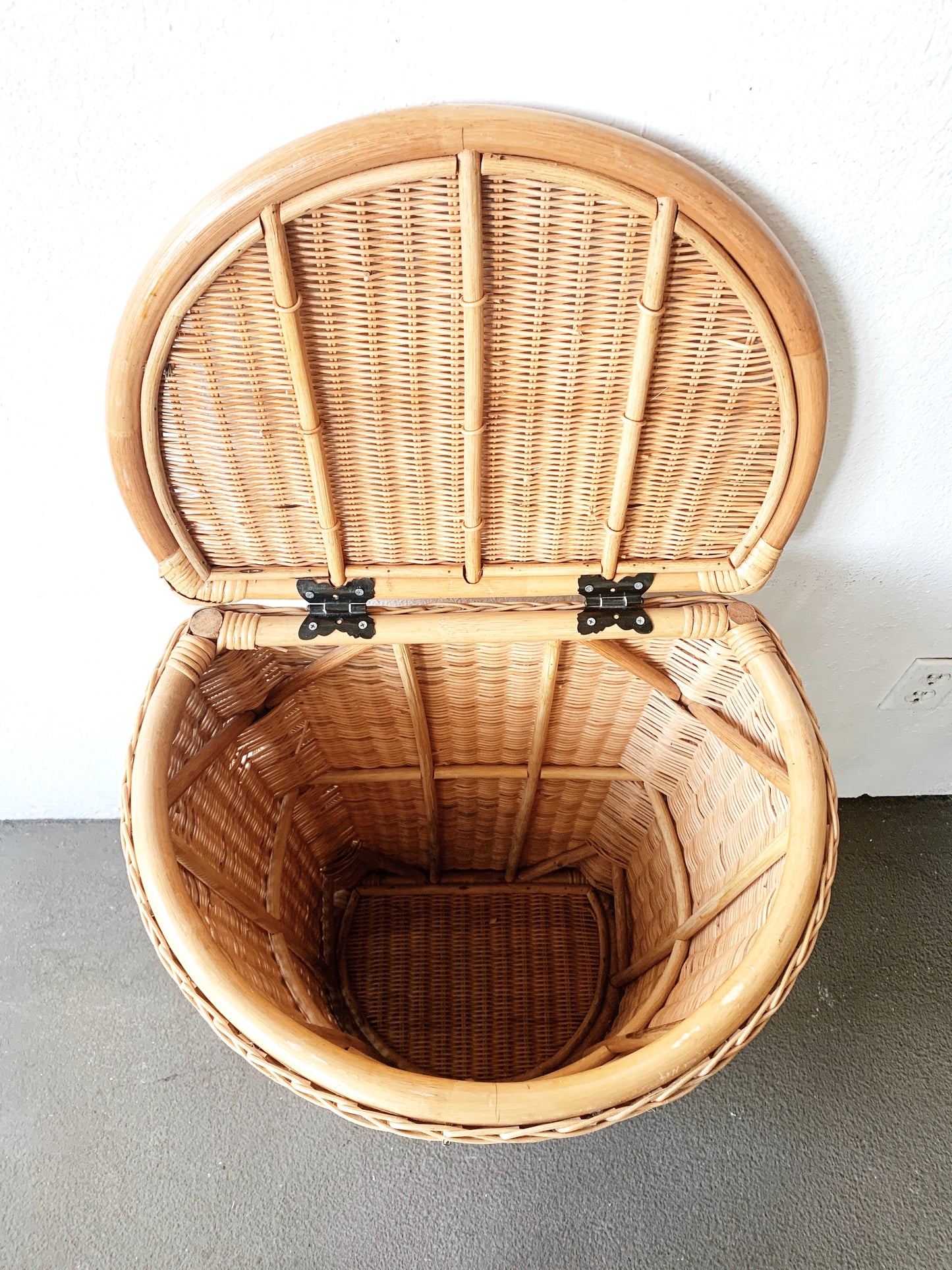 Large vintage bamboo framed wicker laundry basket. These thing is really nice looking! And super sturdy. Flat back for going flush against a wall.