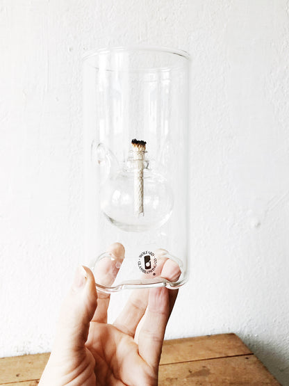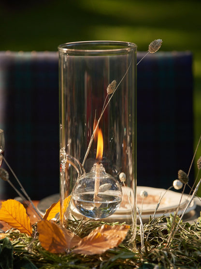 Mouth blown glass makes for a pretty lamp in this classic Wolfard oil lantern. Takes standard lamp oil in its circular cavity