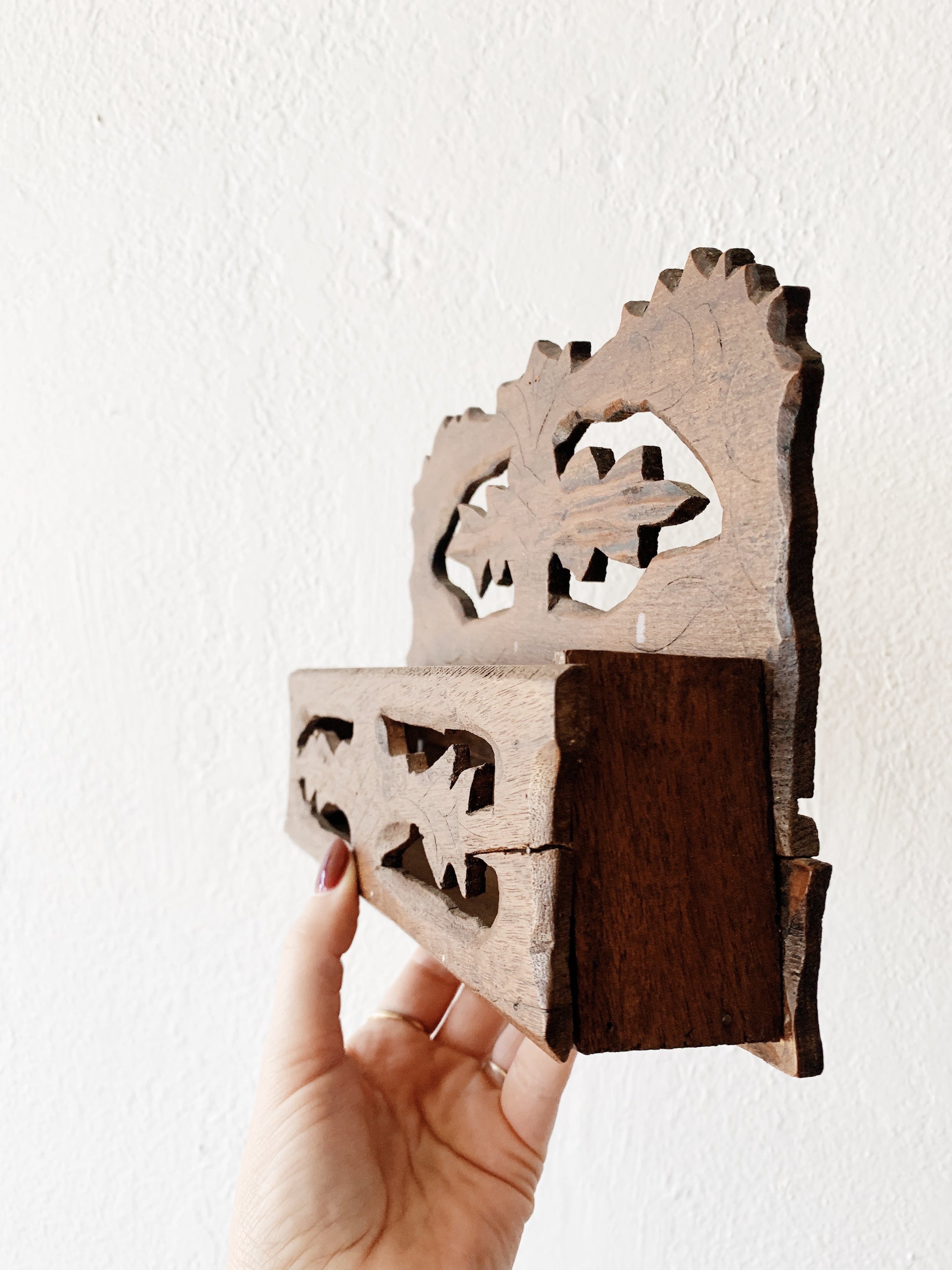 Wonderful old cutout wood holder of things. Can hang or sit.