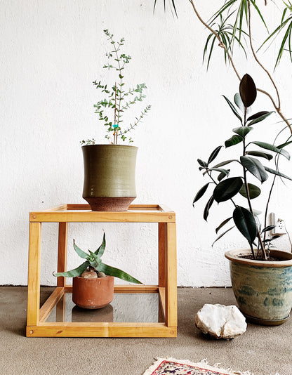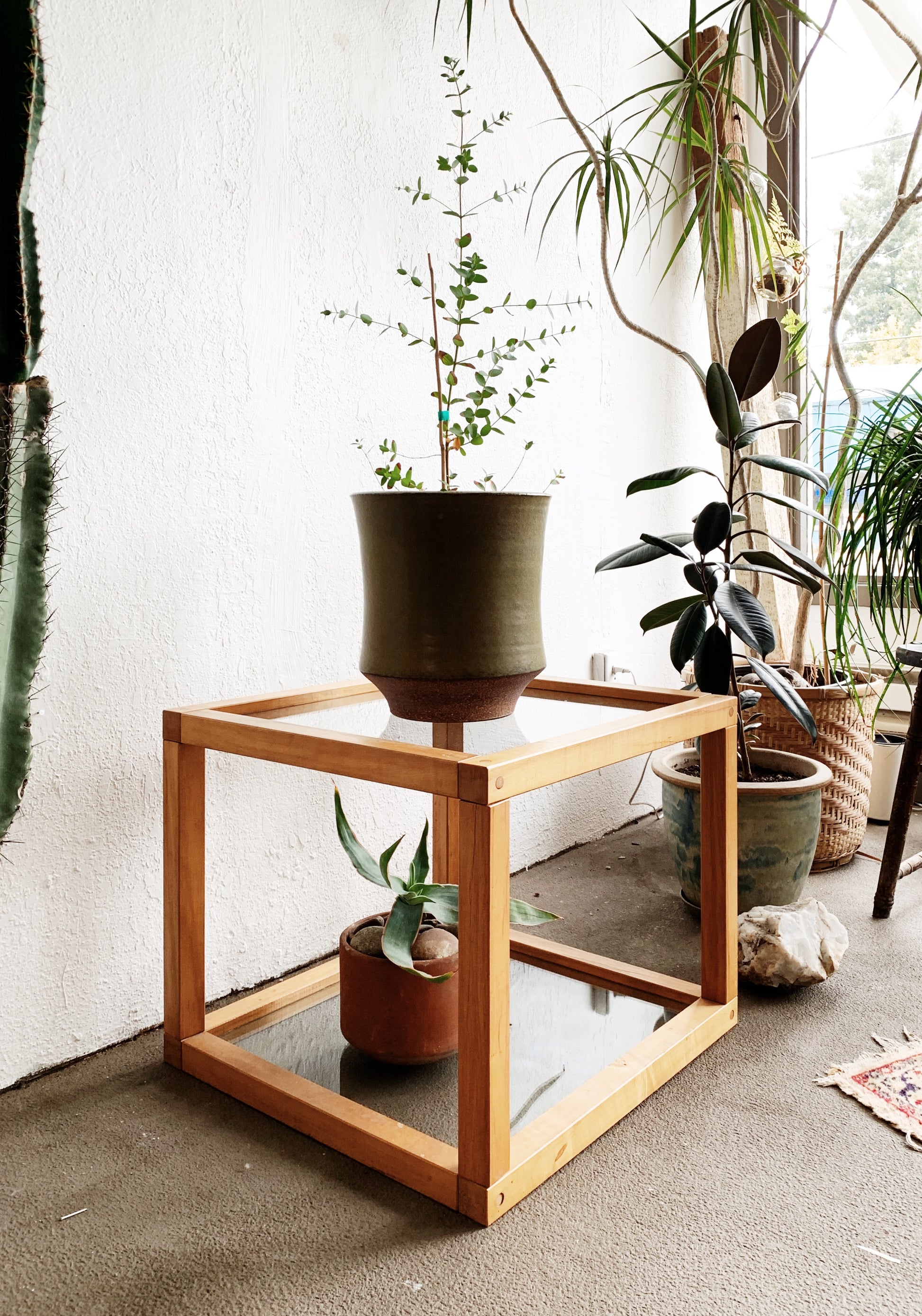 Vintage modern wood and glass cube table. Love this table! Simple and beautiful design with natural wood and double glass. Sturdy and beautiful. A few dings here and there, but overall in really good condition.