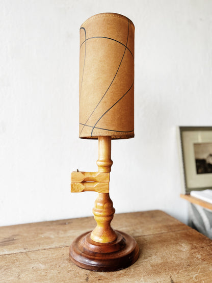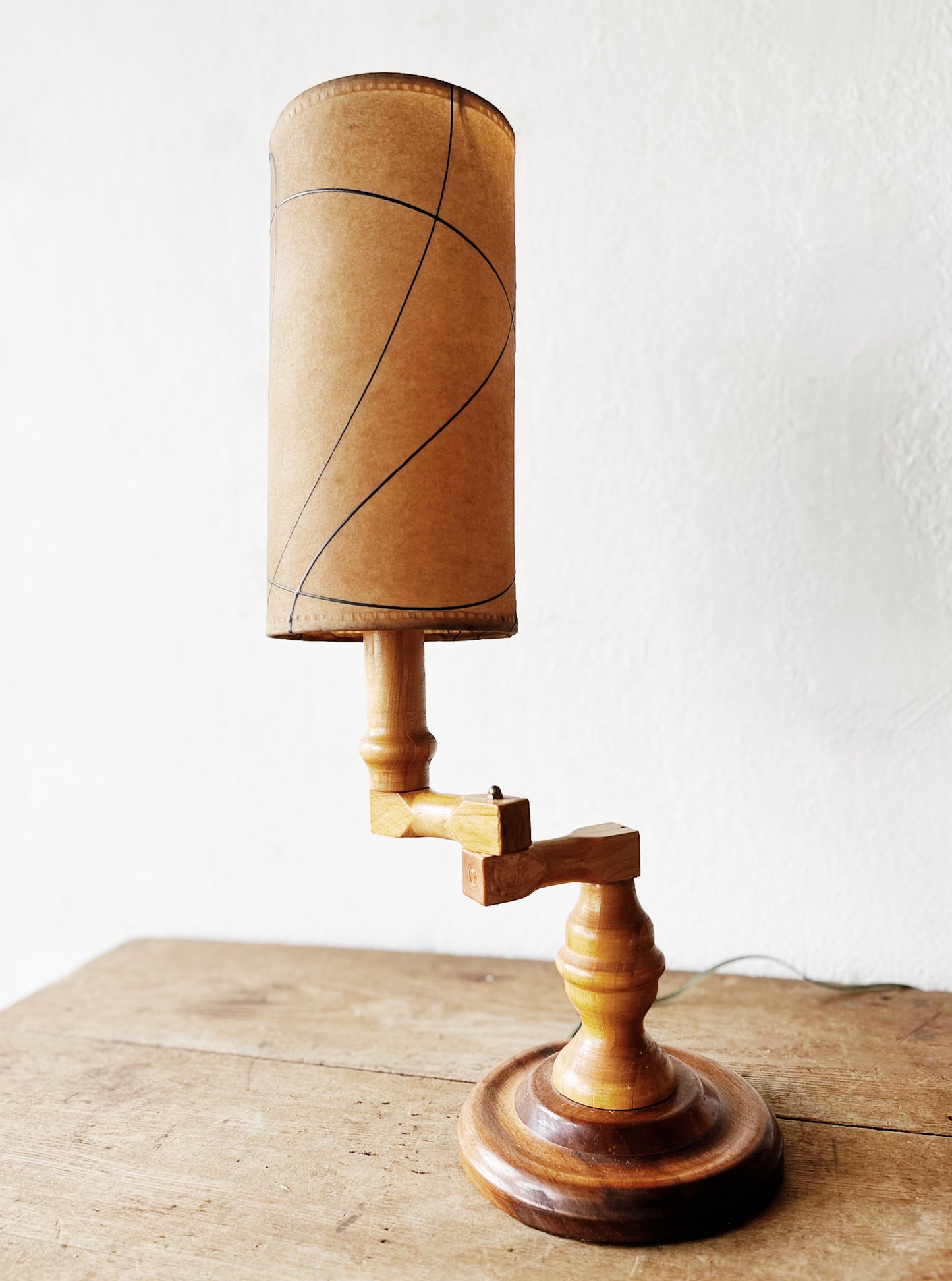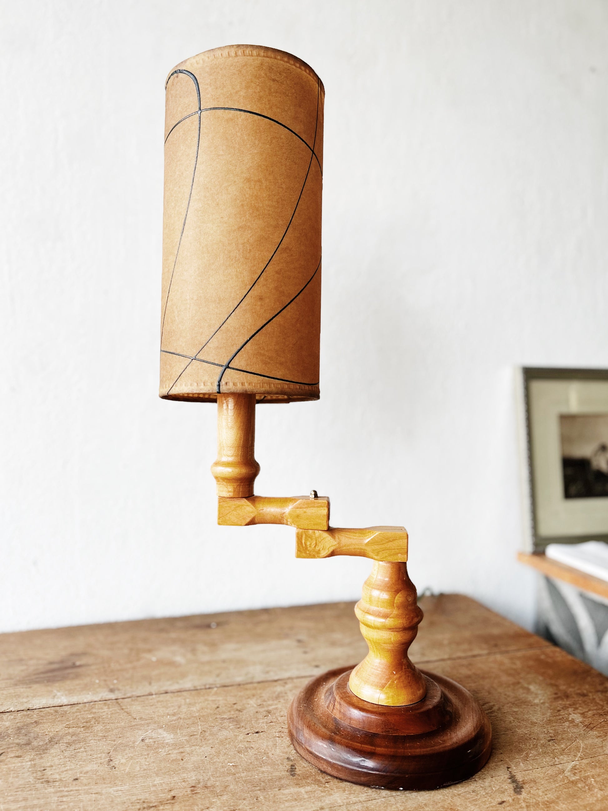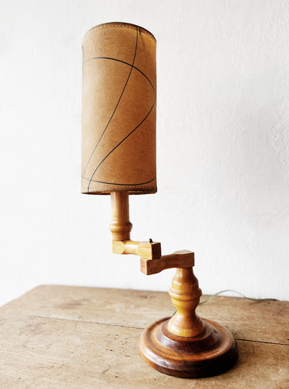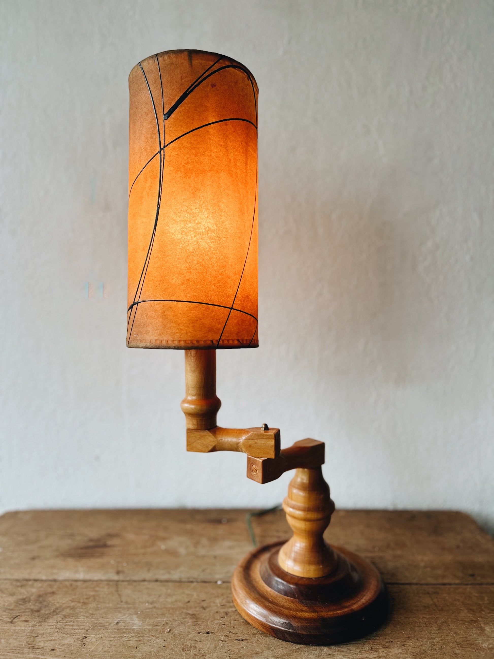 A nice old lamp made in the folk style. Articulating arm. Solid wood. Topped with a vintage spun fiber shade that is hand painted. Emits a lovely warm glow. In good working order with original green wiring in great shape.