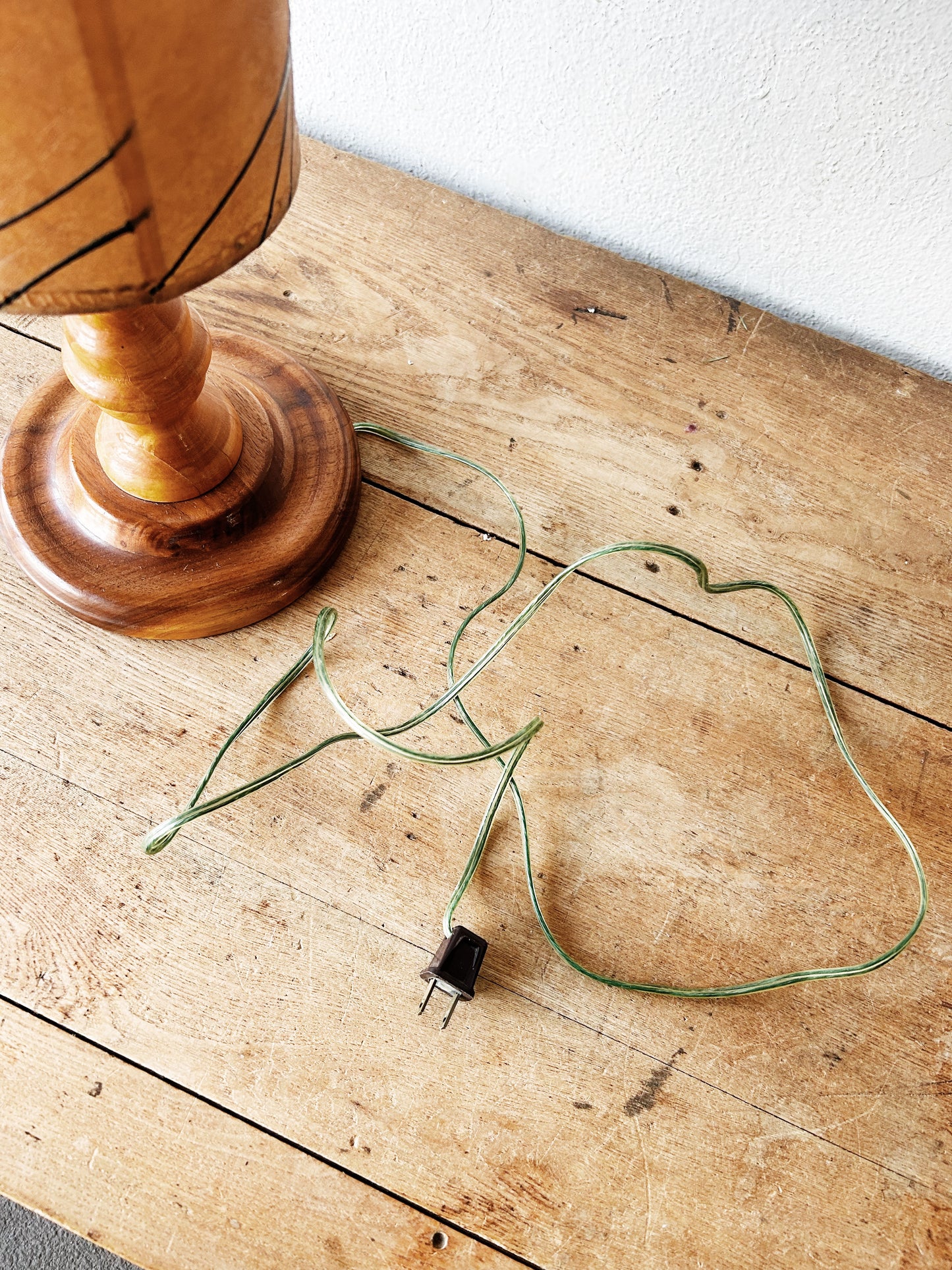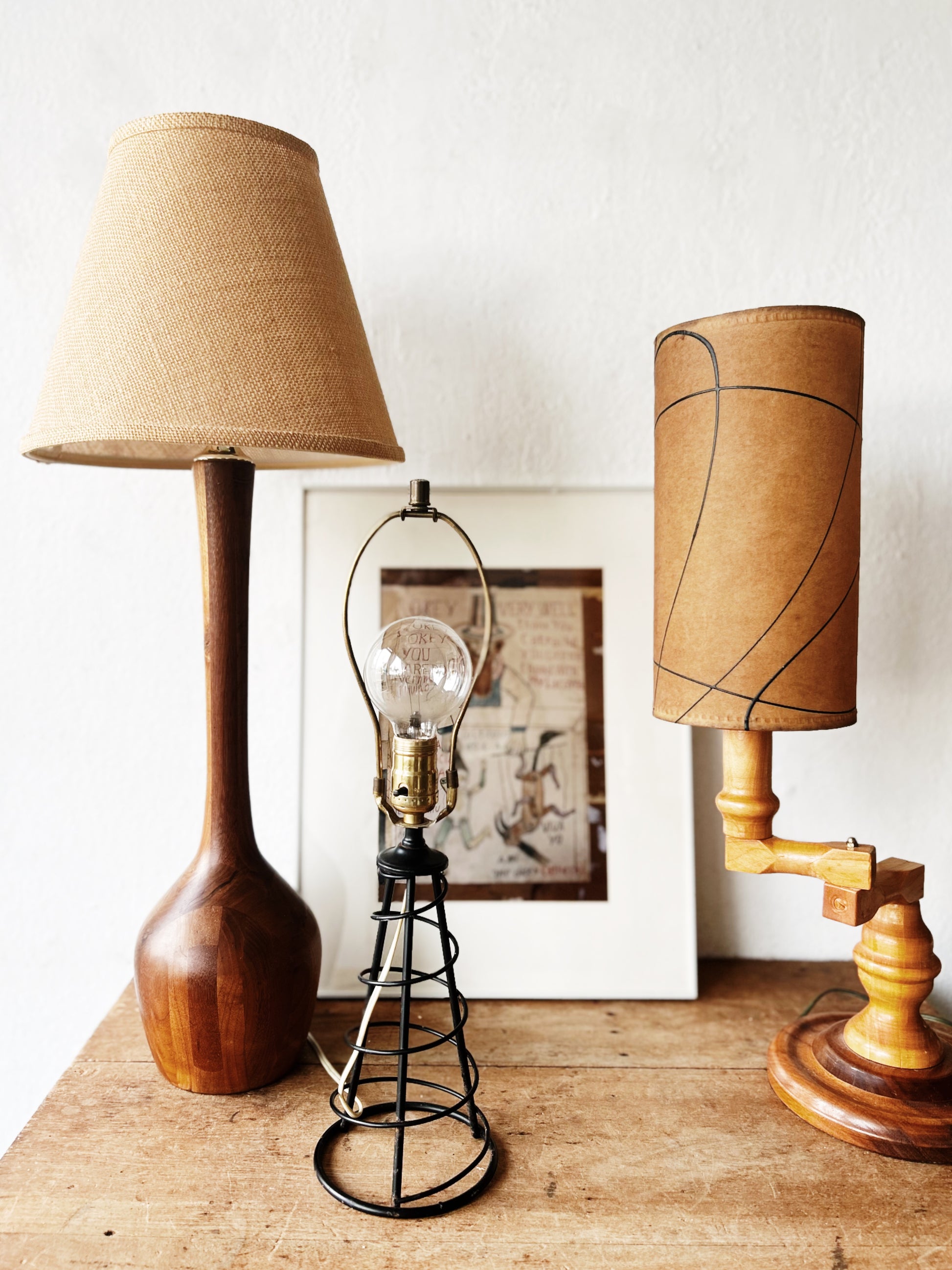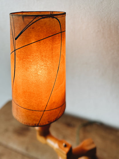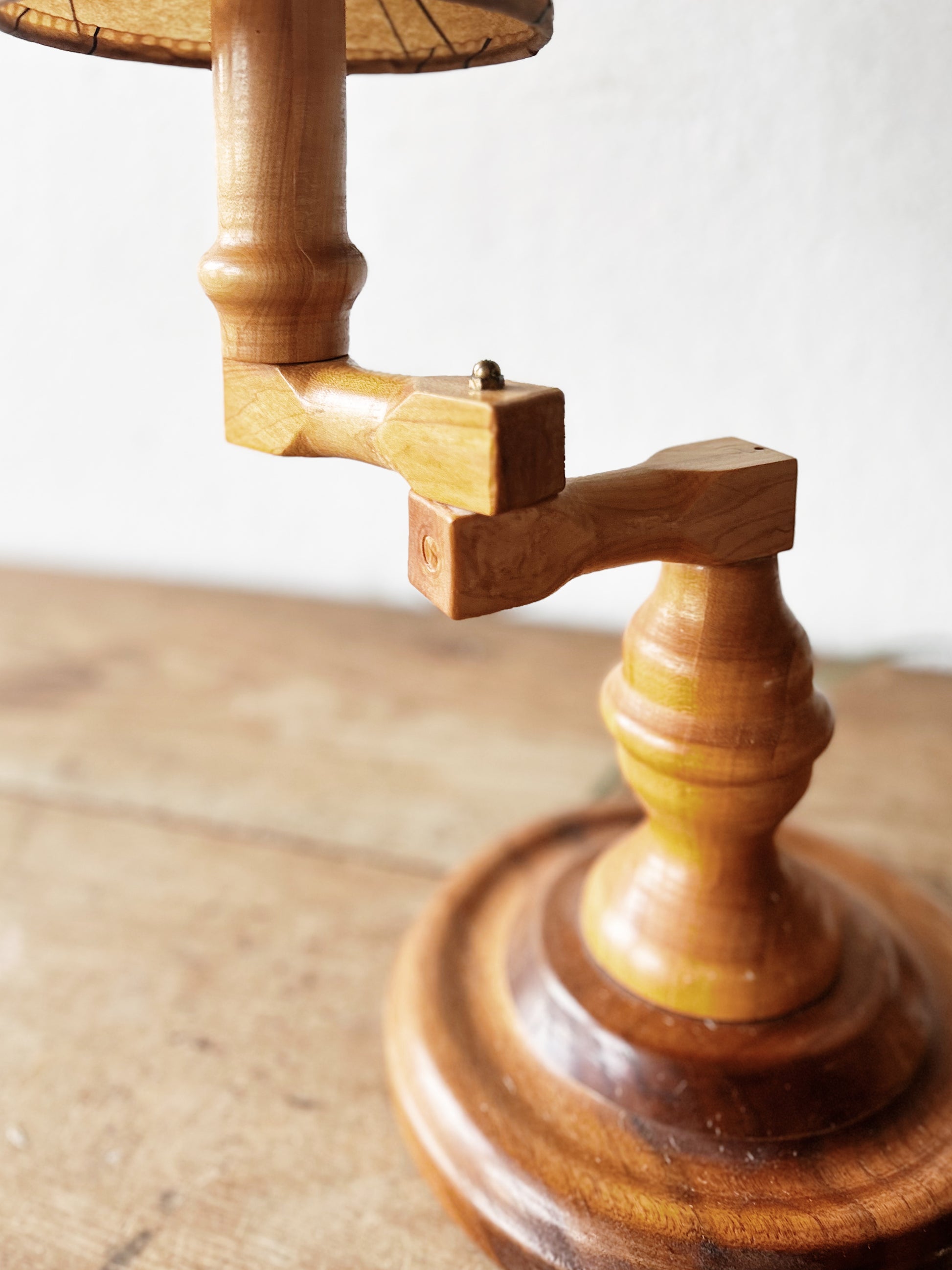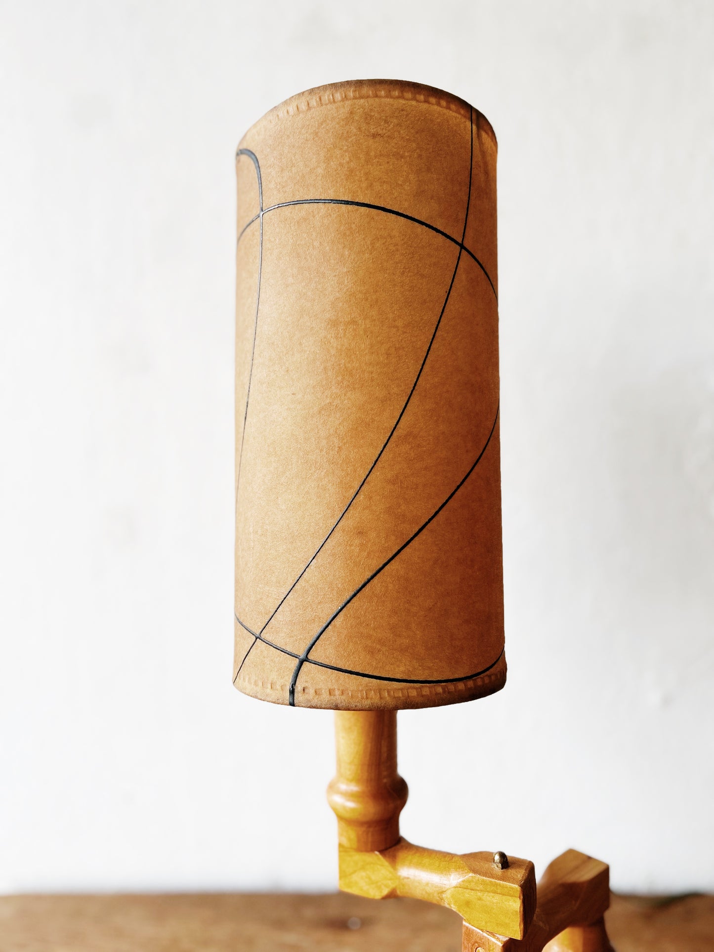 A nice old lamp made in the folk style. Articulating arm. Solid wood. Topped with a vintage spun fiber shade that is hand painted. Emits a lovely warm glow. In good working order with original green wiring in great shape.
