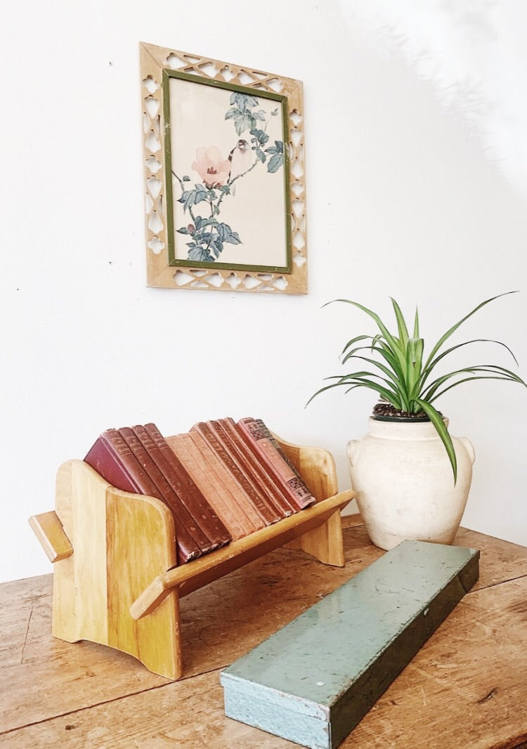 Vintage table top wood book rack that holds a good collection. Sturdy, honey stained wood.
