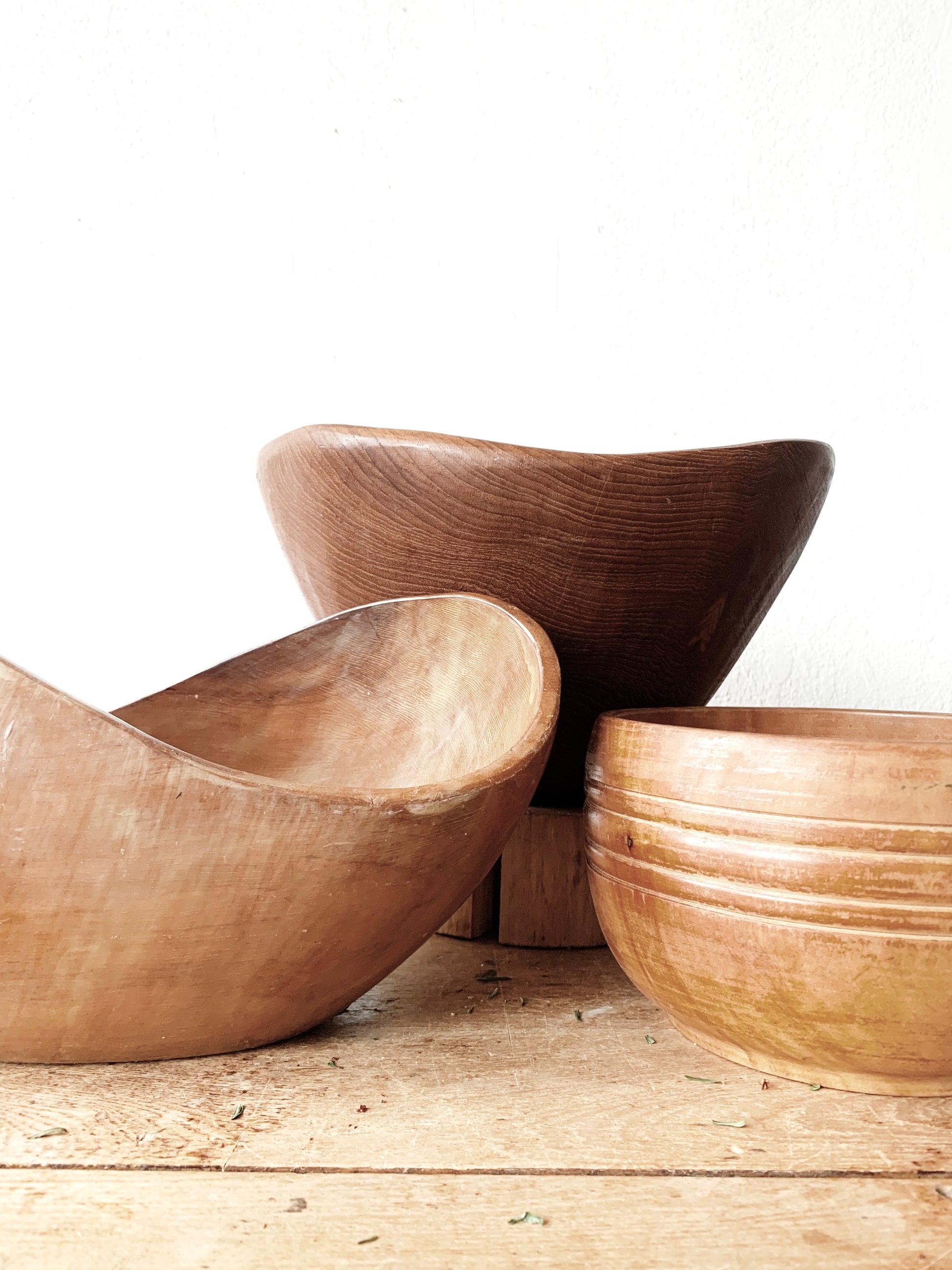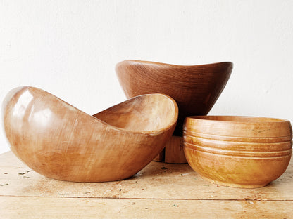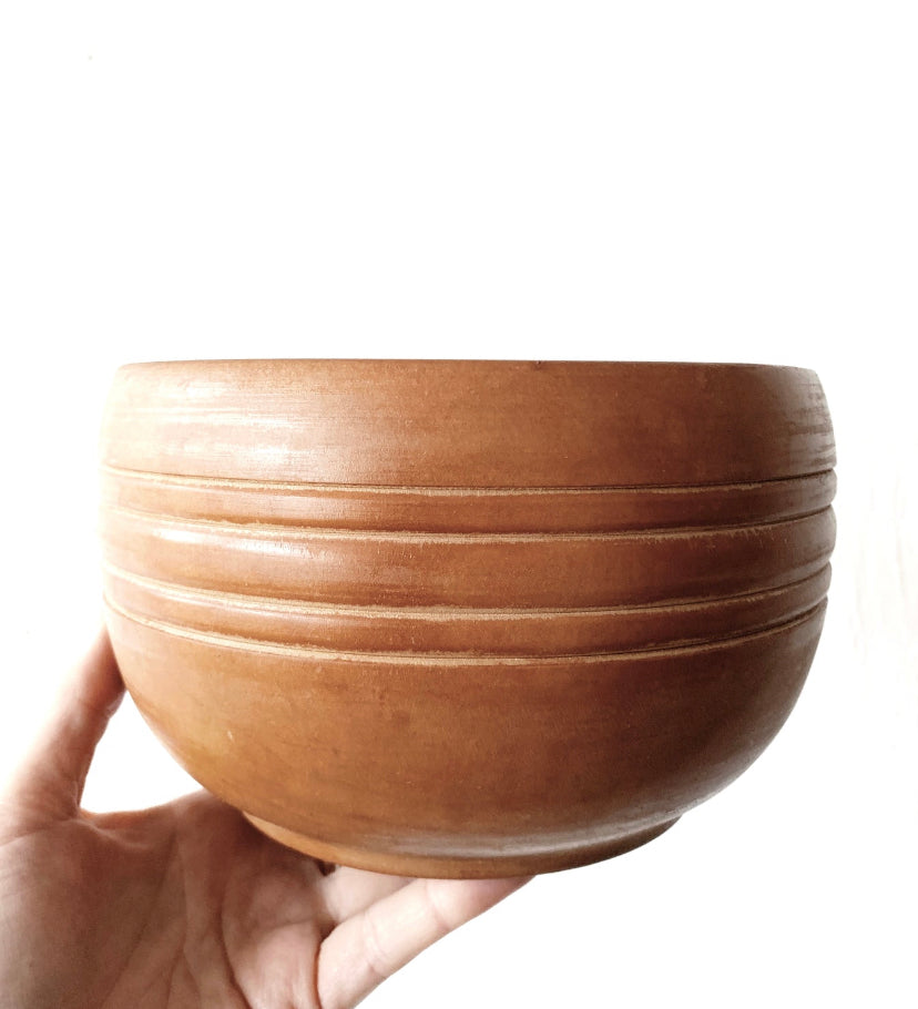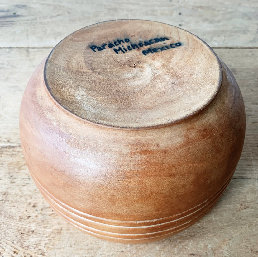 Perfectly round turned wood bowl made in Mexico. Nice aged wood, in very good vintage conditions a few darkened areas. 7x4.5”