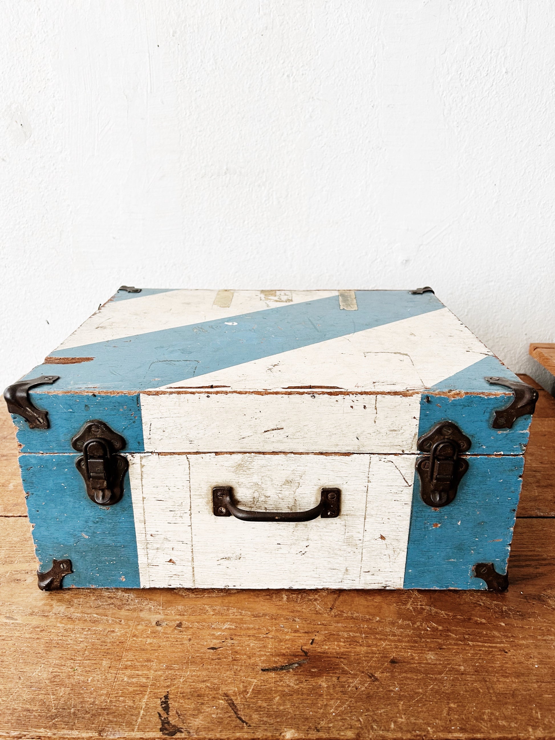 Awesome old wood case with sturdy hardware and handle. Beat up but in the best way. Great size for storing all kinds of things. Approx 14x14”