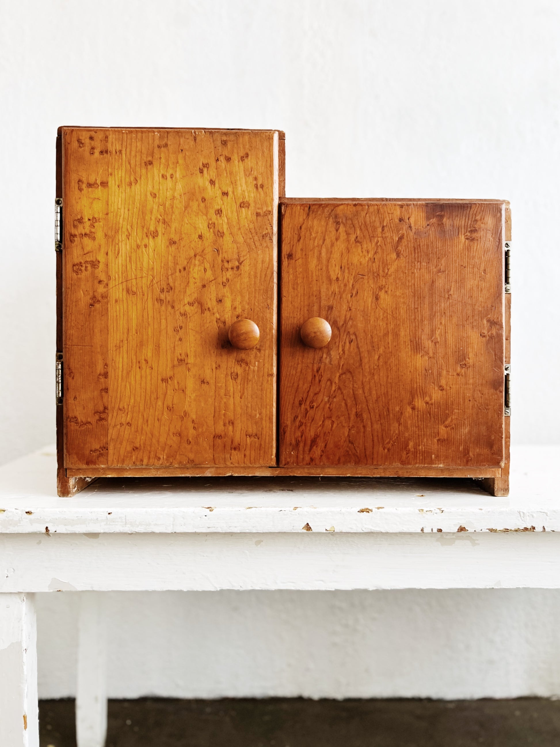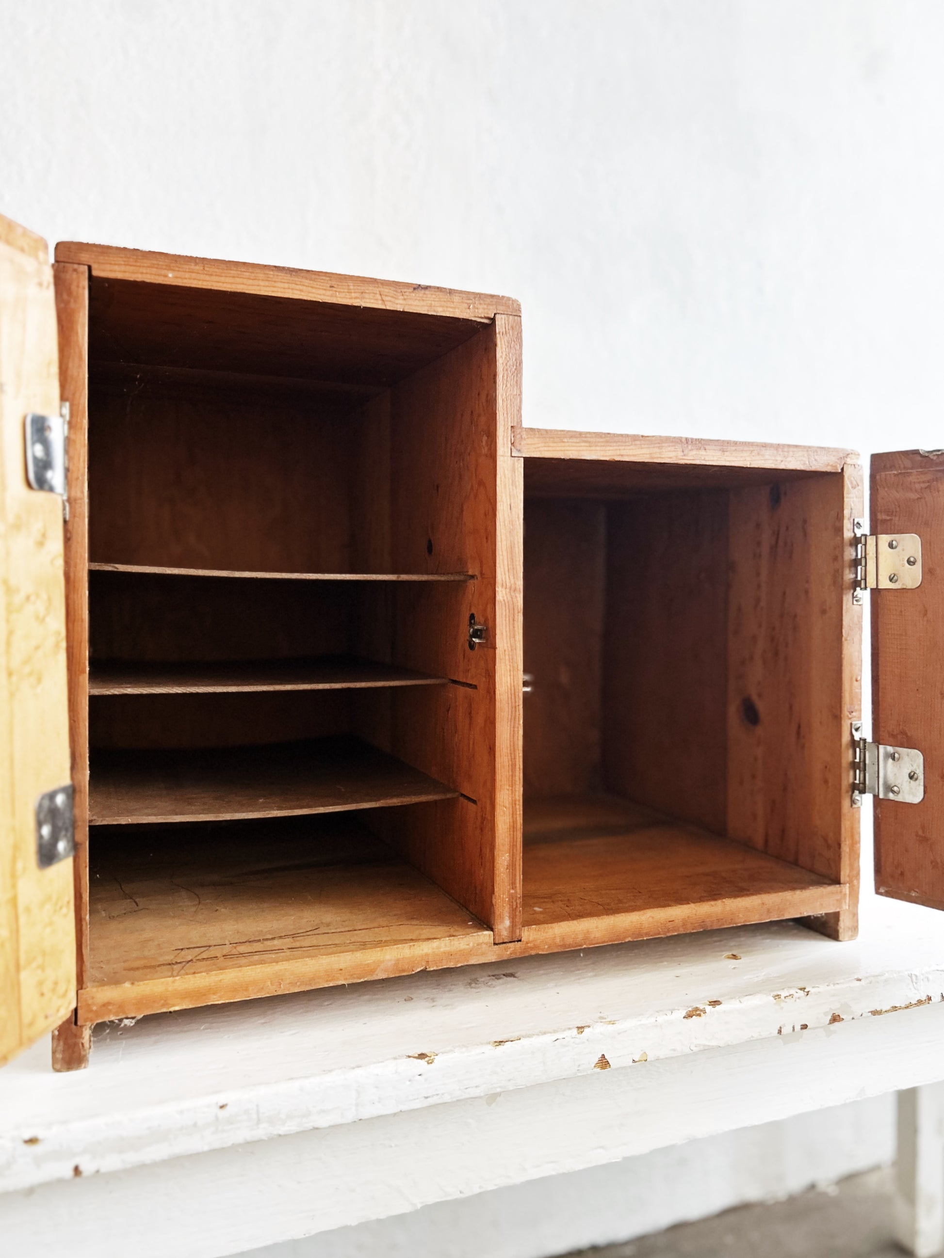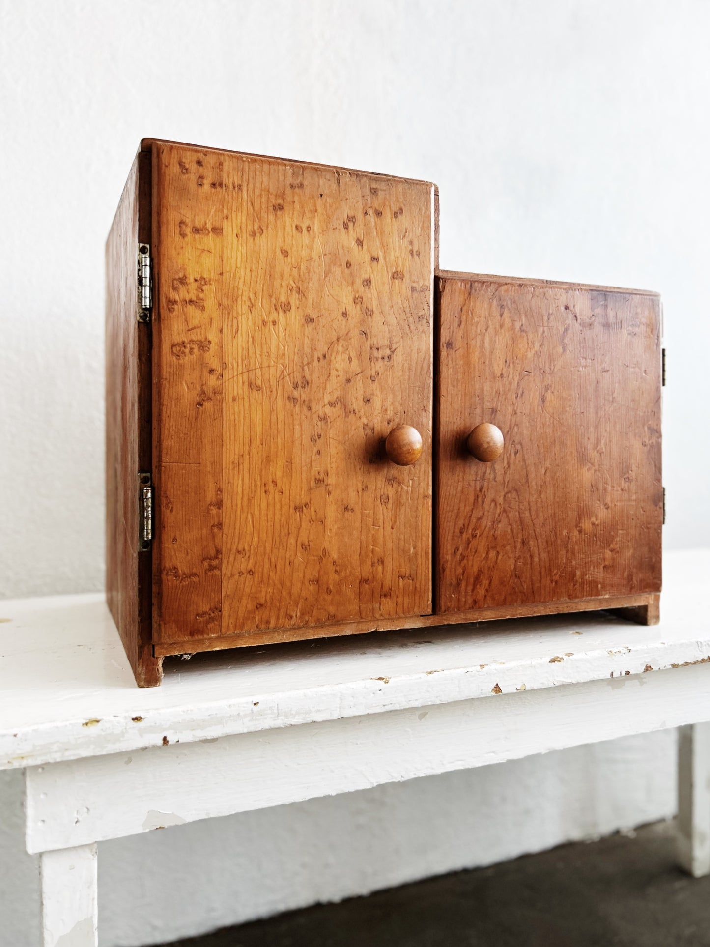In love with this old wood cabinet. So unusual. Warm honey toned aged wood. Stepped, just for fun it seems. This works on the ground or atop a table. Such a cool piece with nice age to it. The internal dividers are useful.