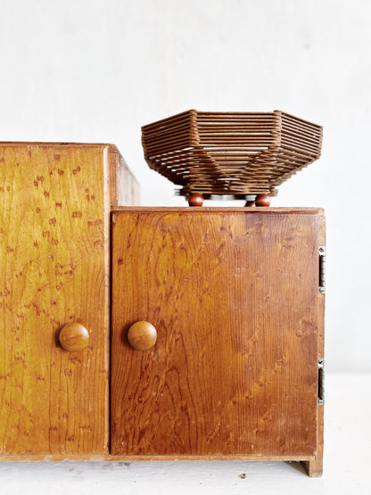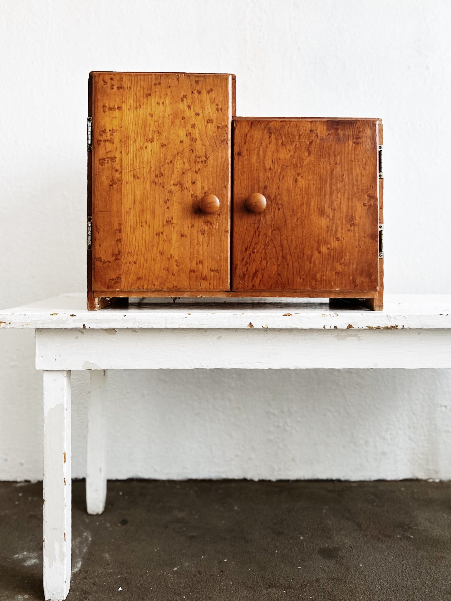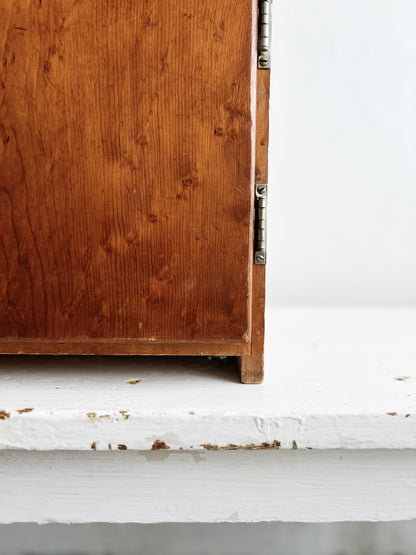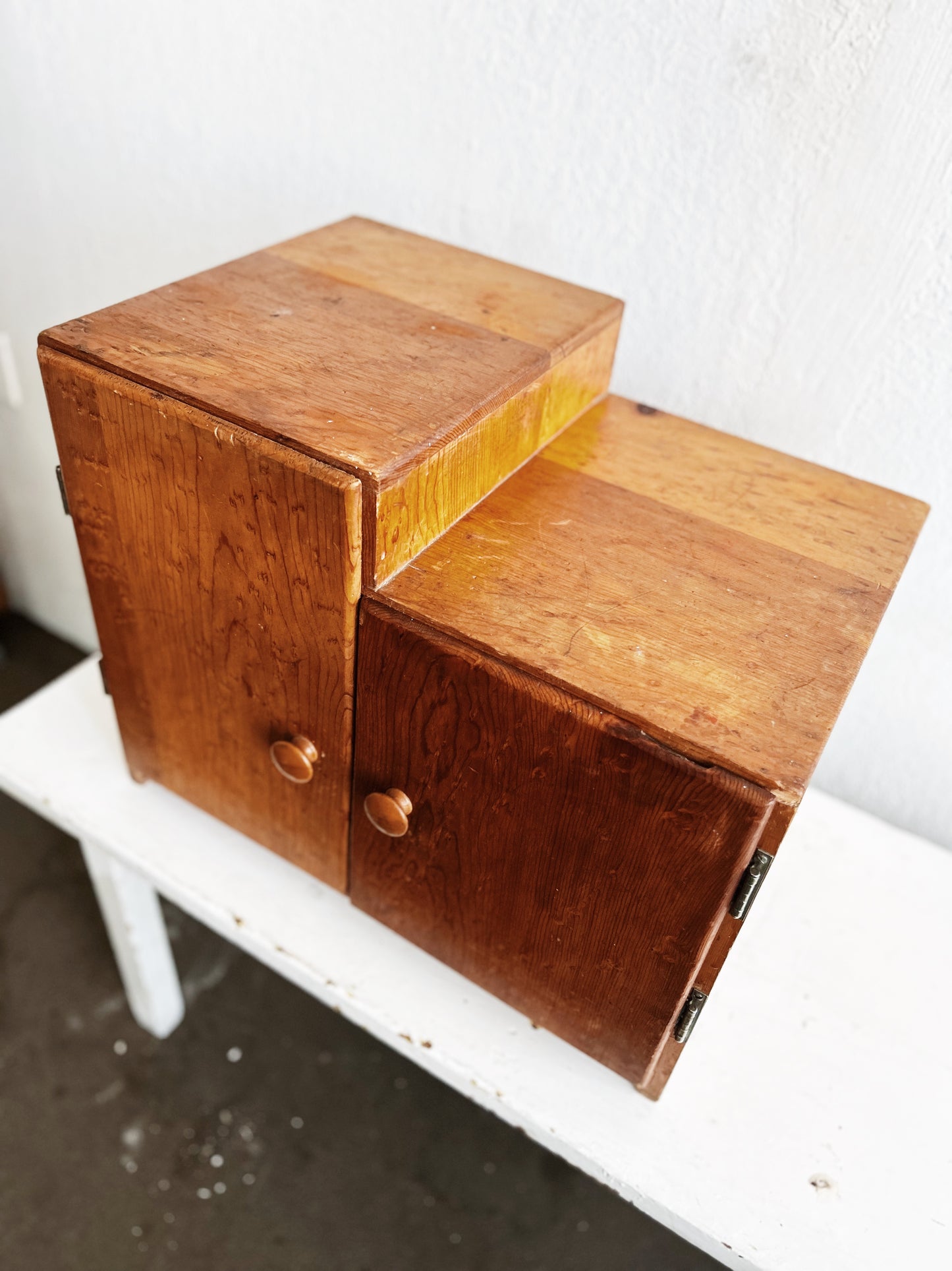 In love with this old wood cabinet. So unusual. Warm honey toned aged wood. Stepped, just for fun it seems. This works on the ground or atop a table. Such a cool piece with nice age to it. The internal dividers are useful.