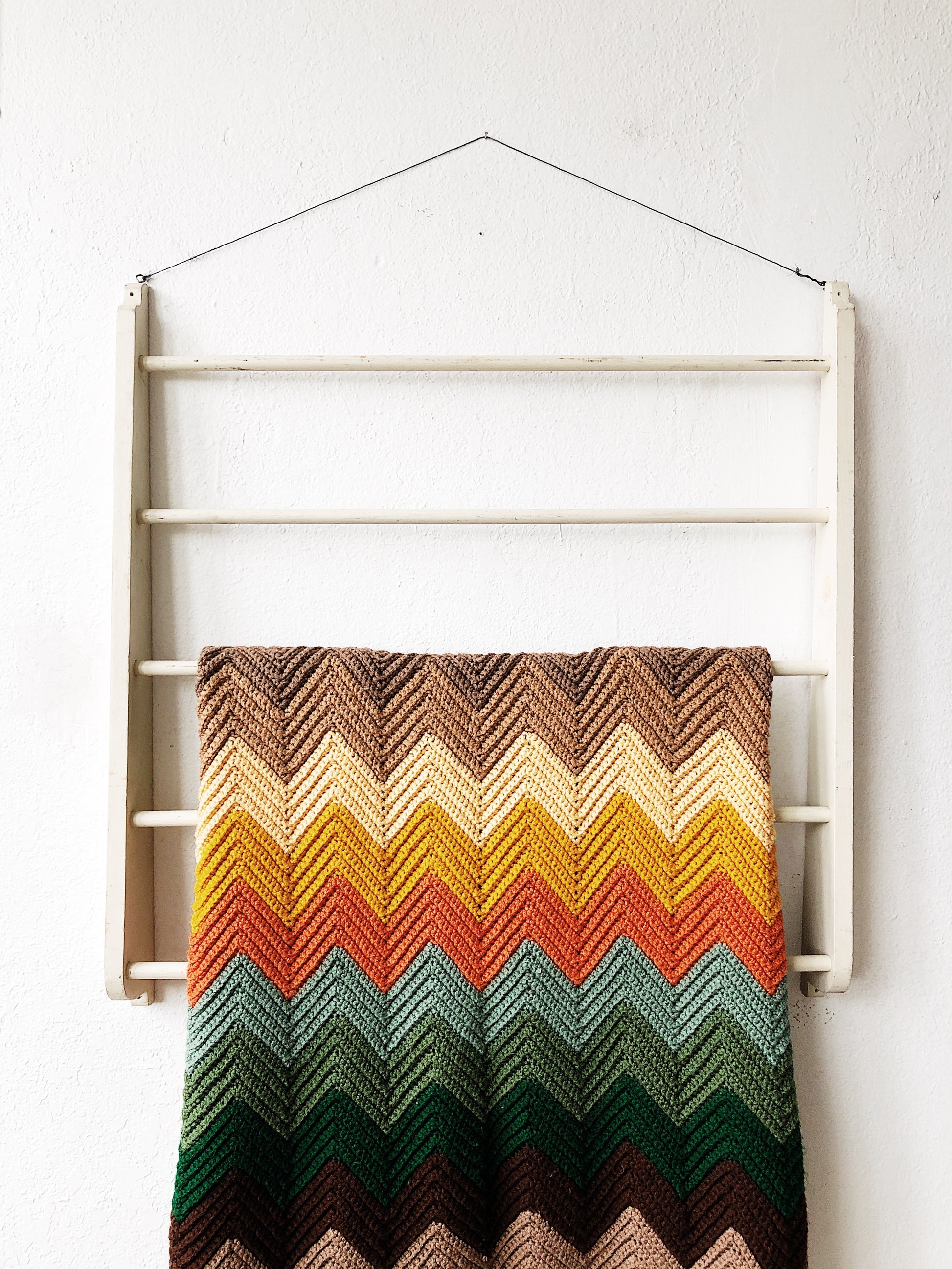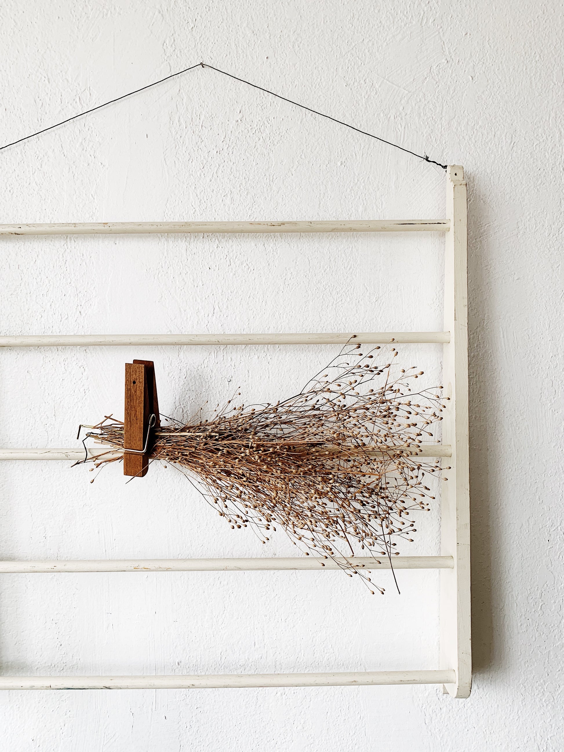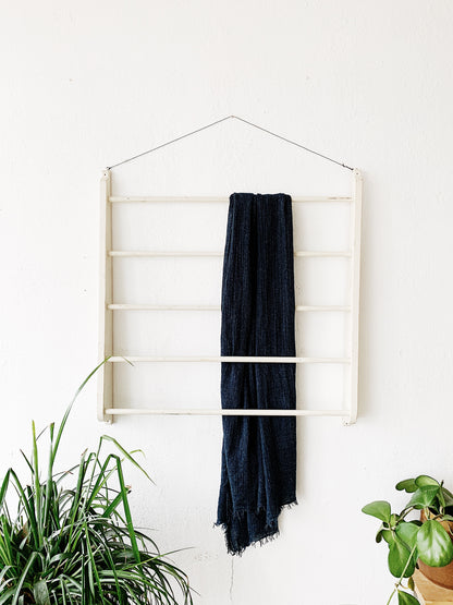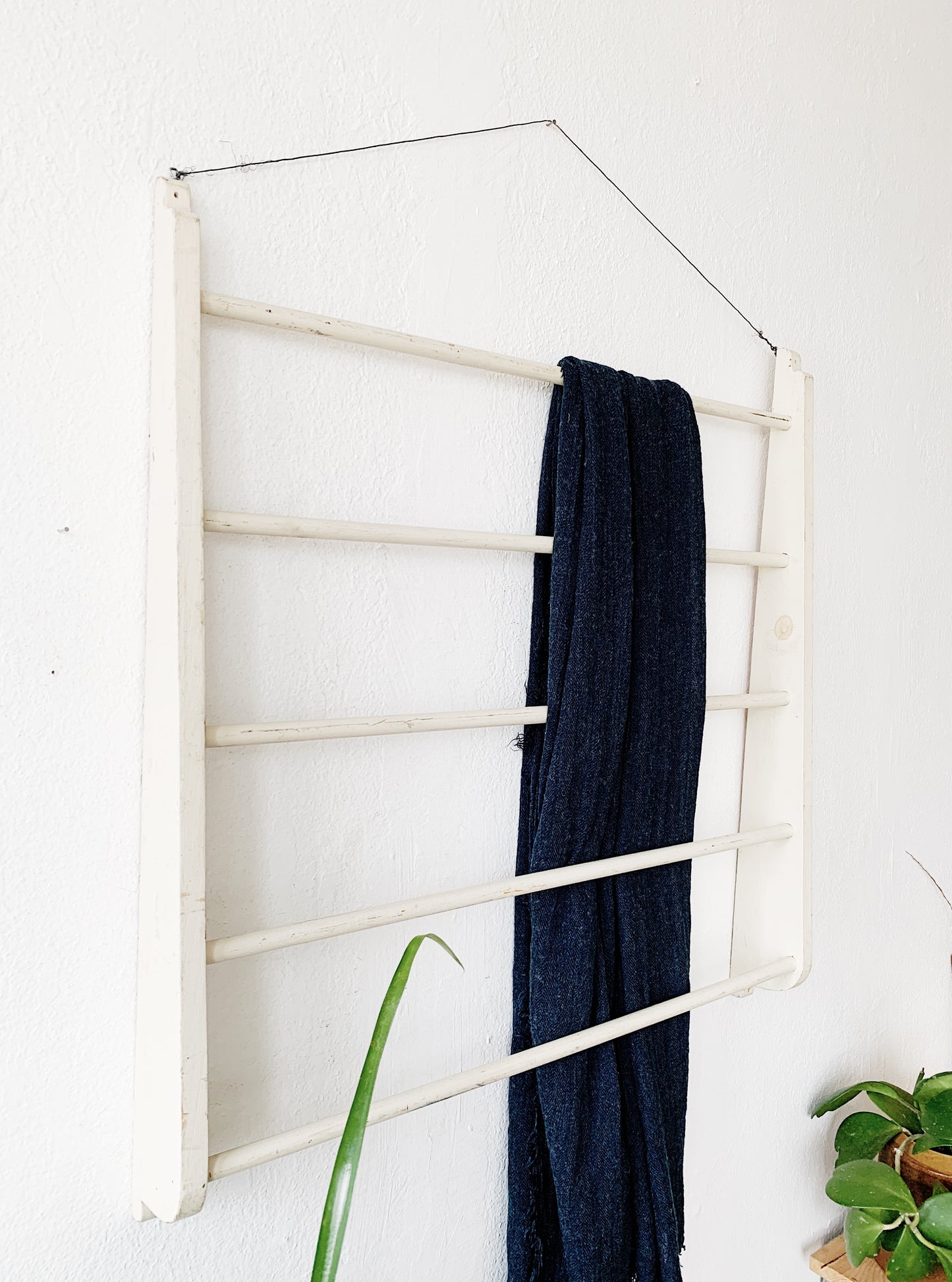 5 dowel rods that are fairly sturdy for hanging multiple textiles. This could even work for scarves, chunky jewelry, belts etc. Cool piece!