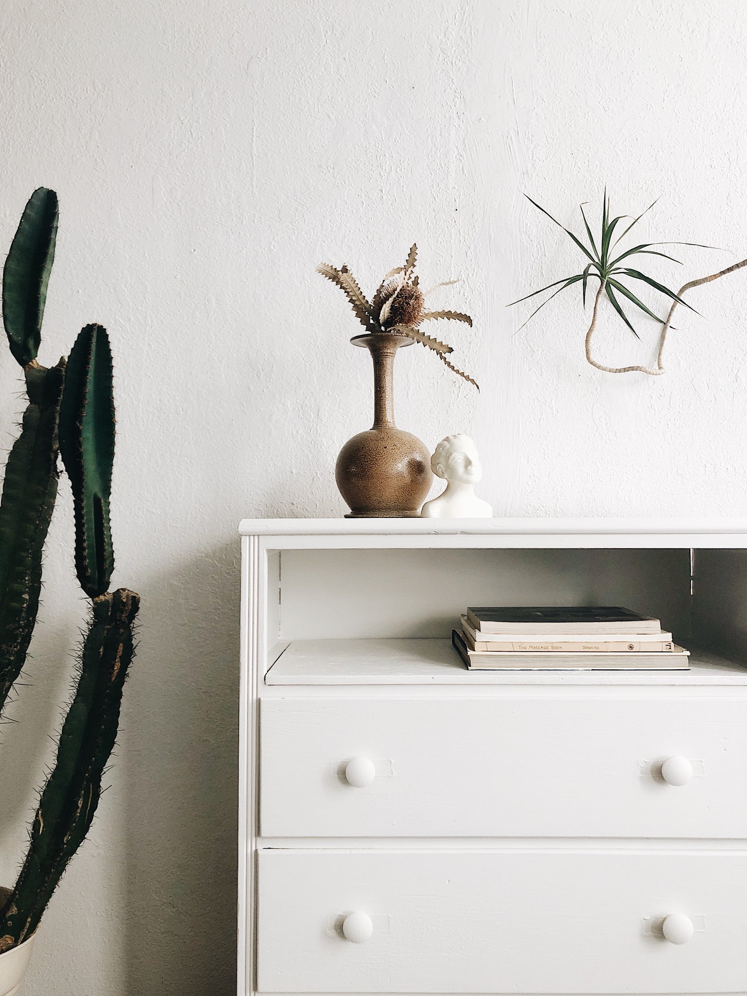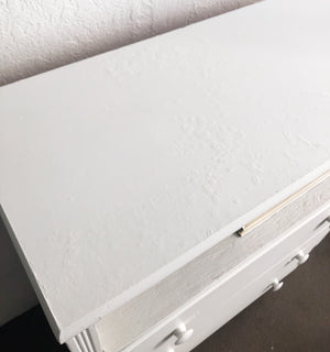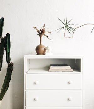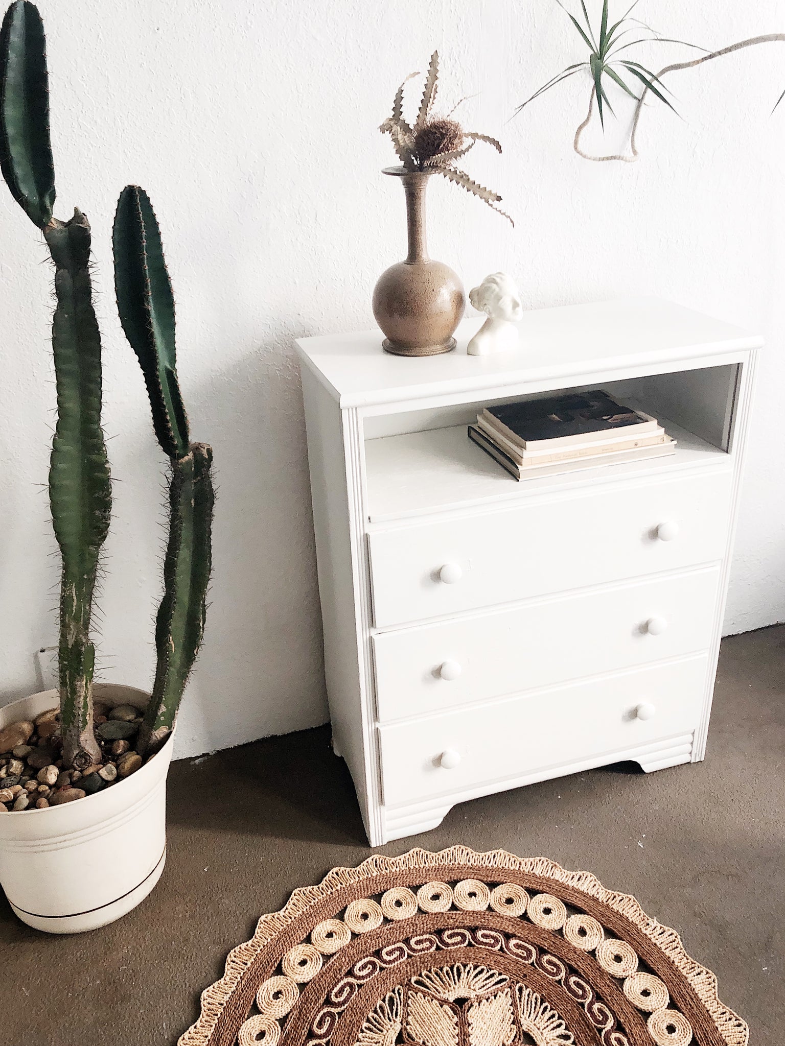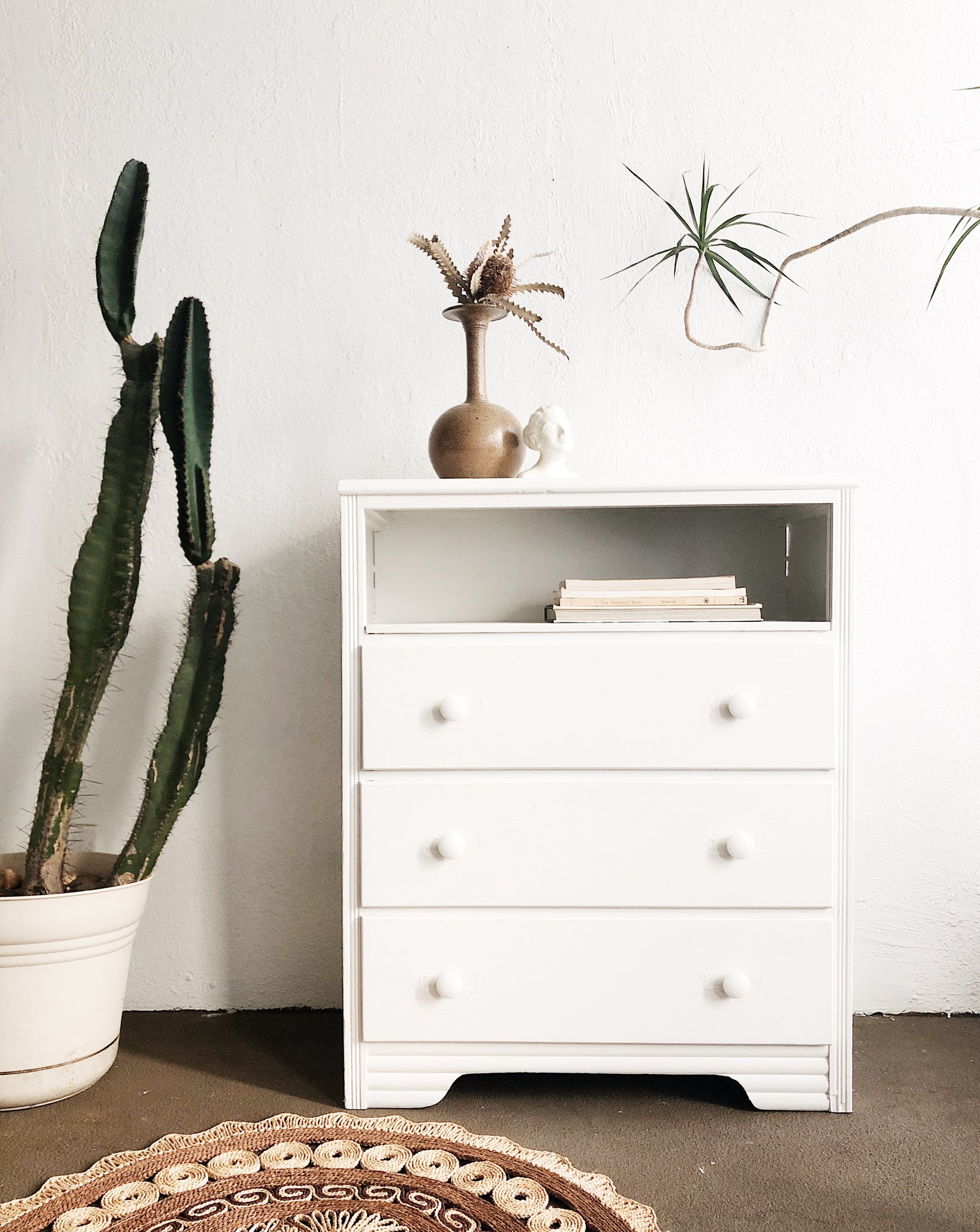 A sweet painted vintage wood dresser. The top drawer has been removed for using as a display shelf or cubby. We love using dressers in Unexpected places such as the living or bathroom. Anyway you look at it, it’s a pretty storage option.