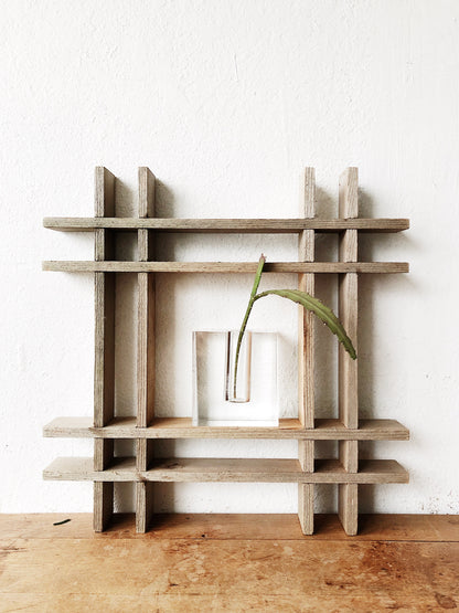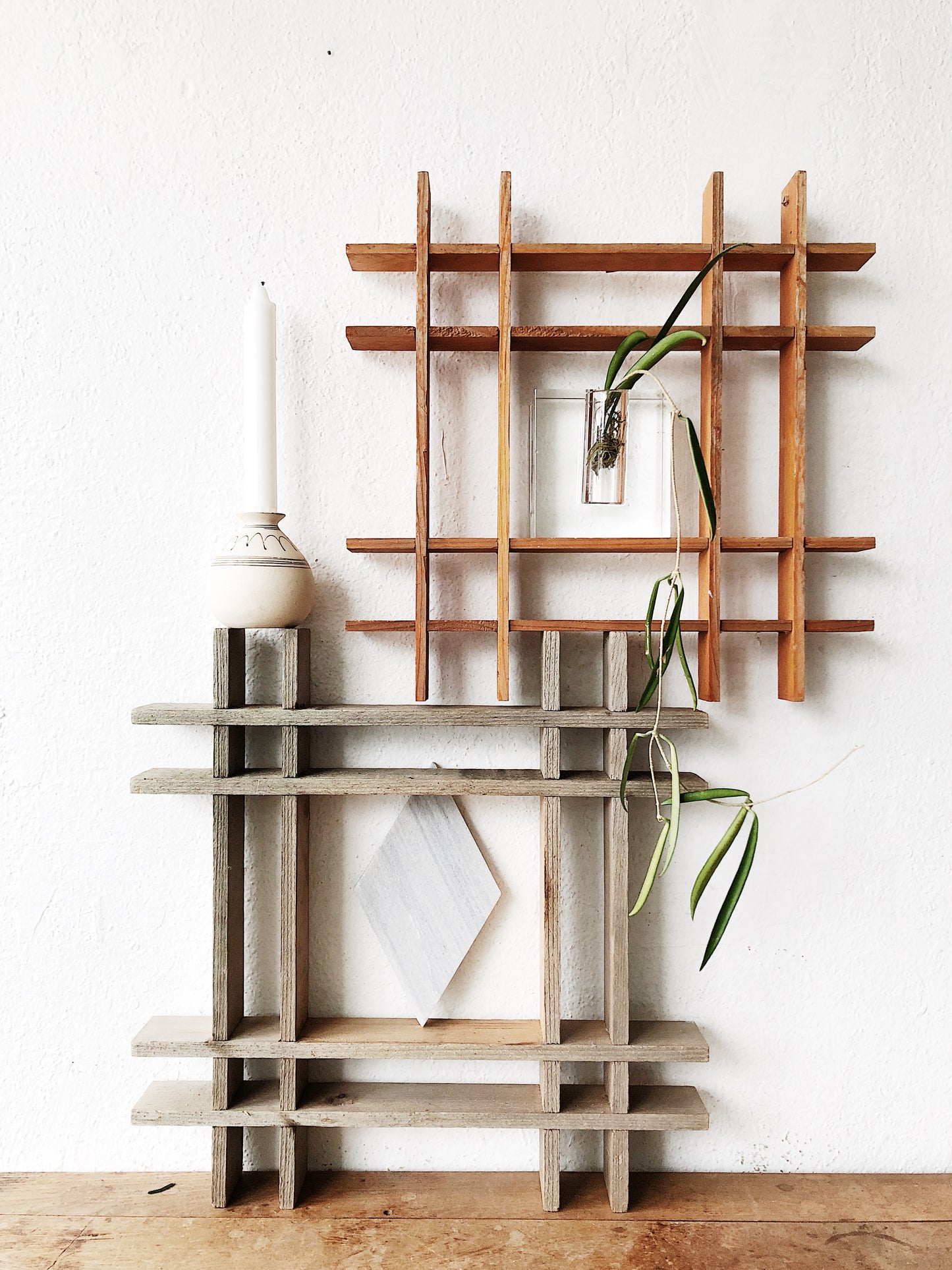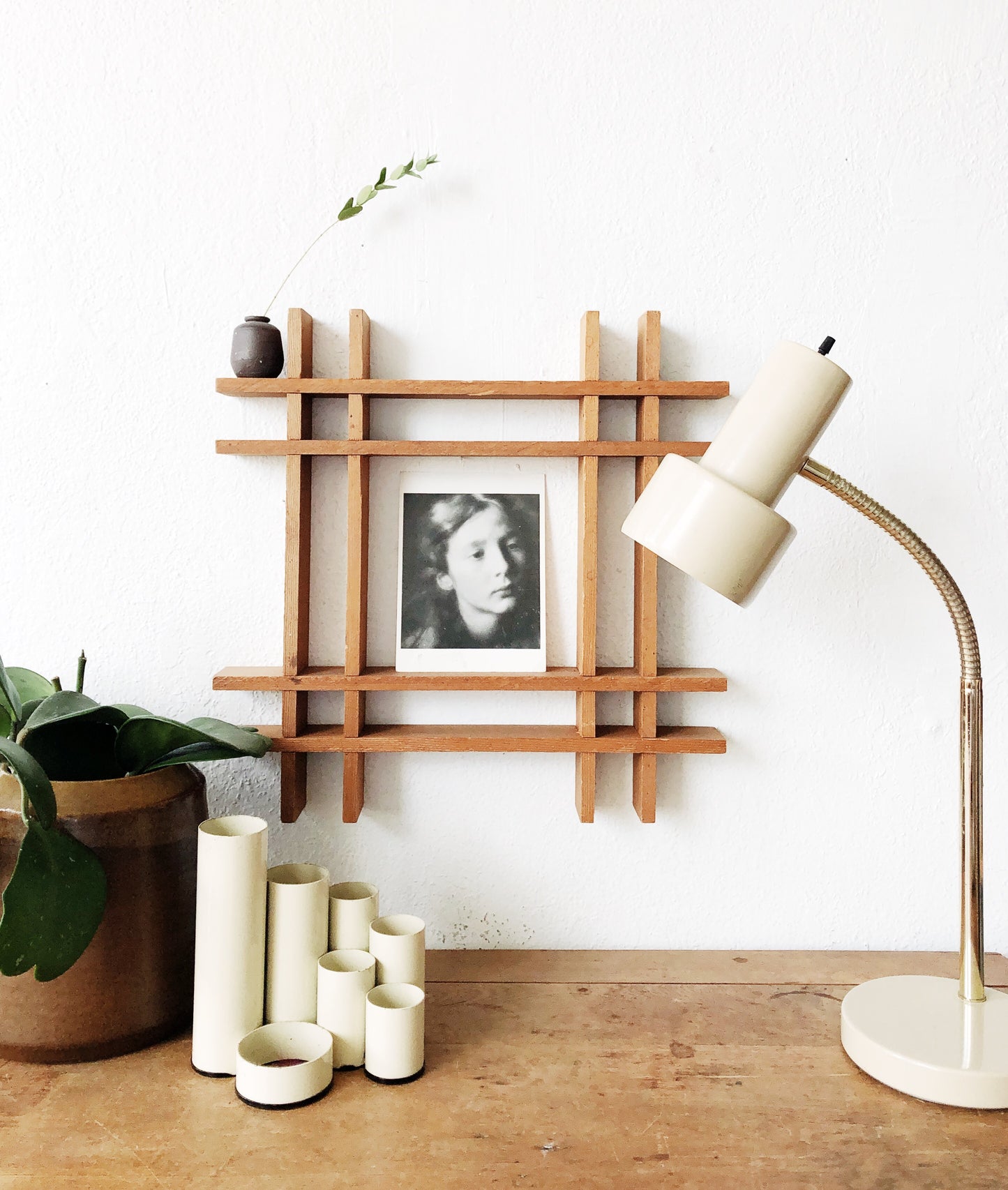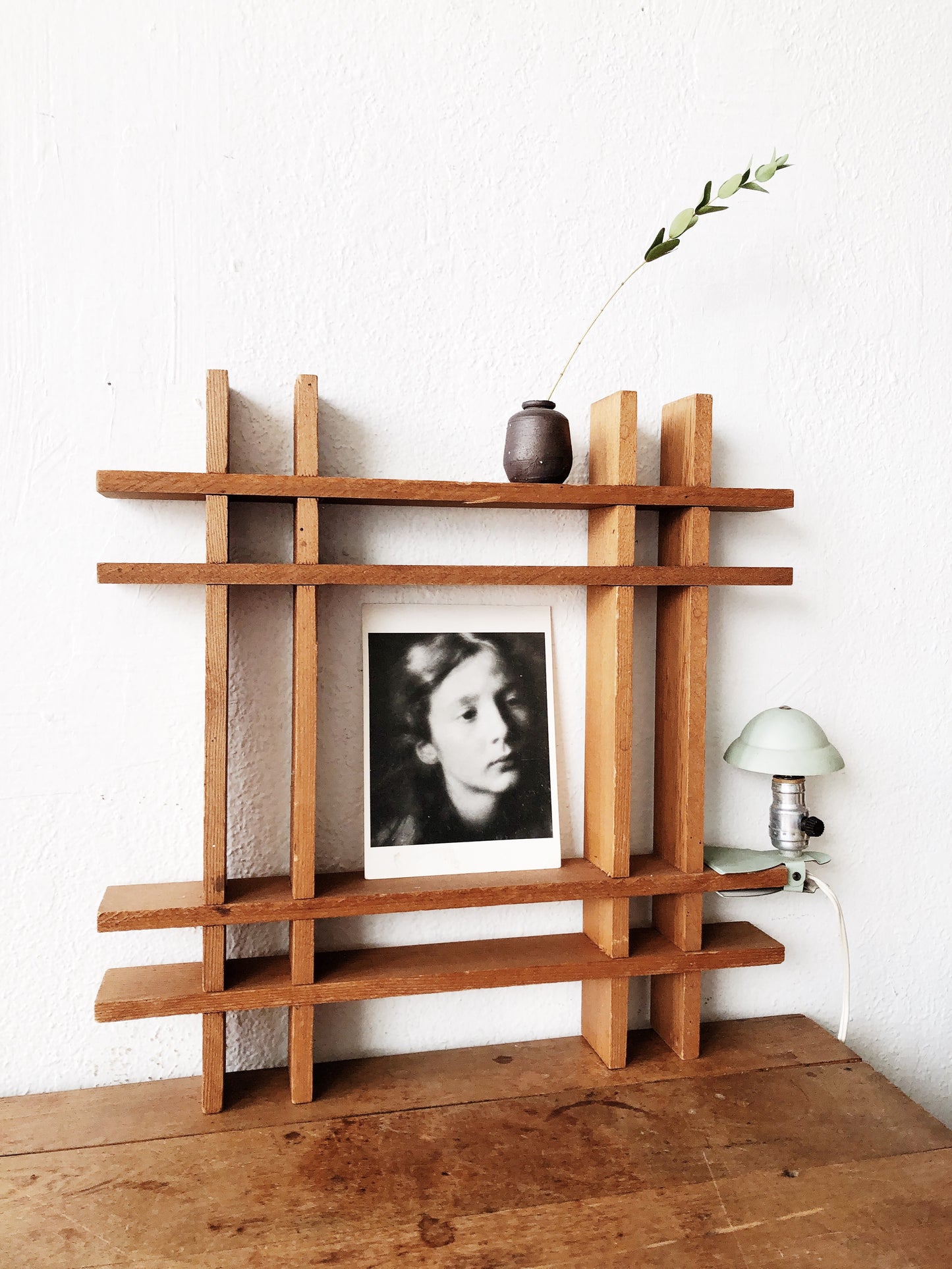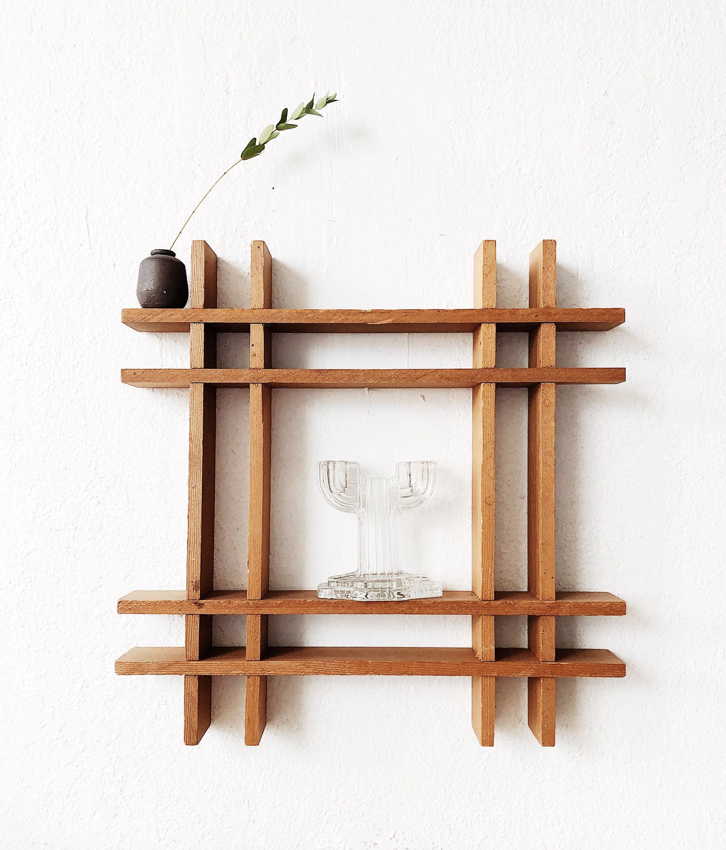 A simple yet effective vintage wood shelf, just the right size for tiny things. Great for spices! A couple of picture nails will hold it up just fine.