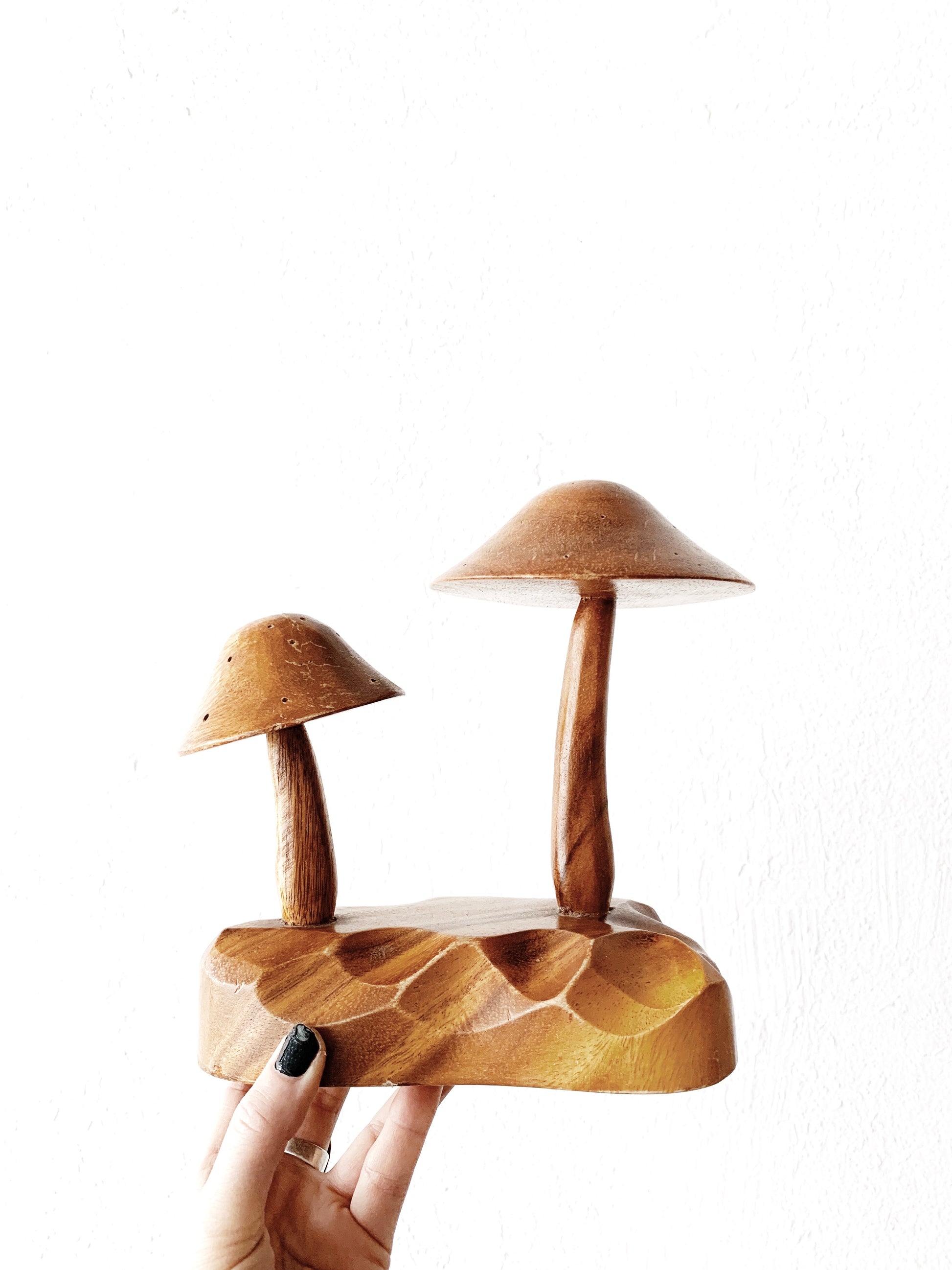 Vintage wood mushroom decor. The two mushrooms have tiny holes on top where you could add little feathers is you want 🤷🏼♀️ Great as is! Made in the Philippines.