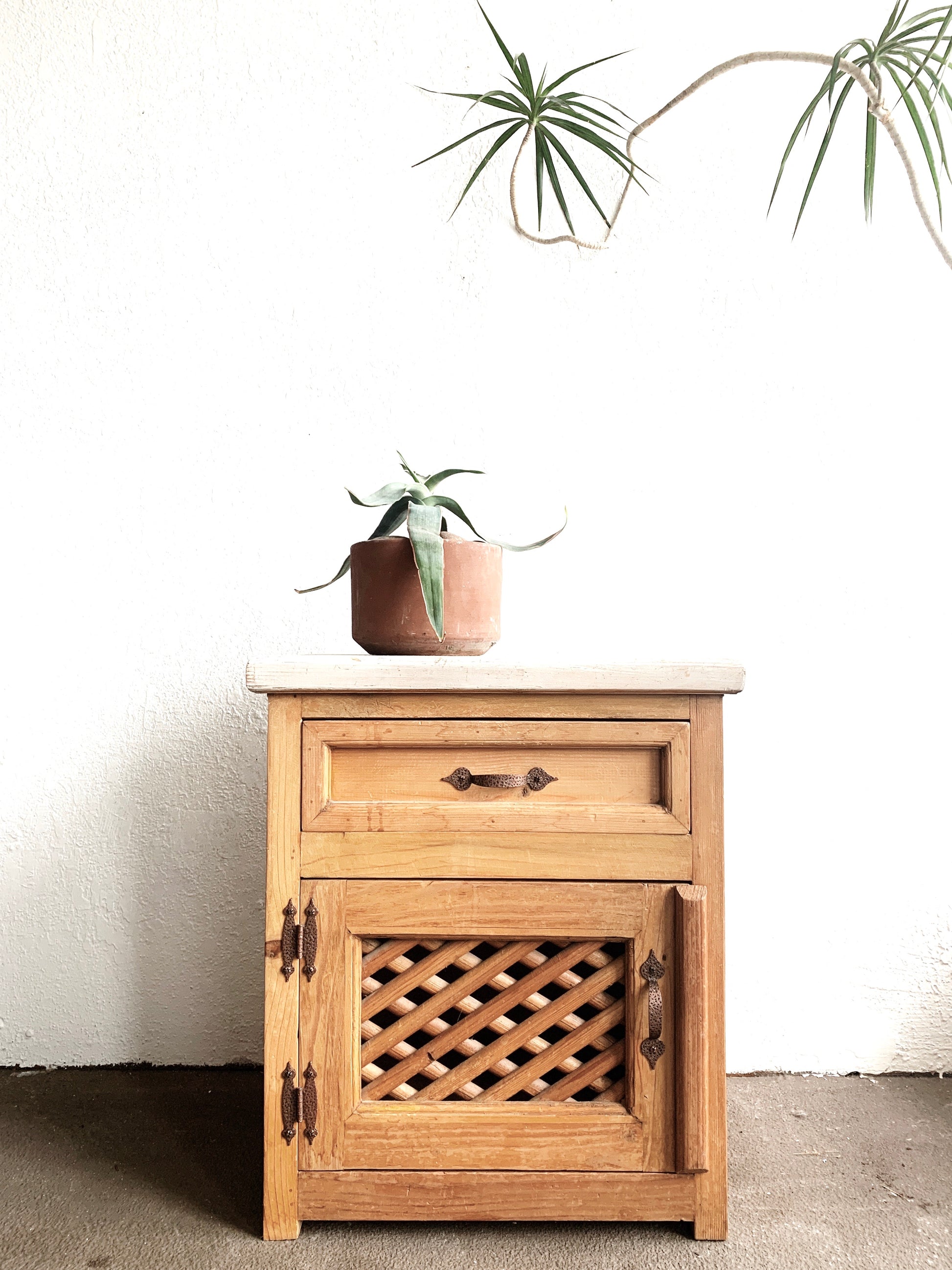 Nice vintage wood nightstand or end table. The top has been painted but could easily be sanded. Chunky Southwest style with hammered iron hardware. Love the enclosed storage area with door.
