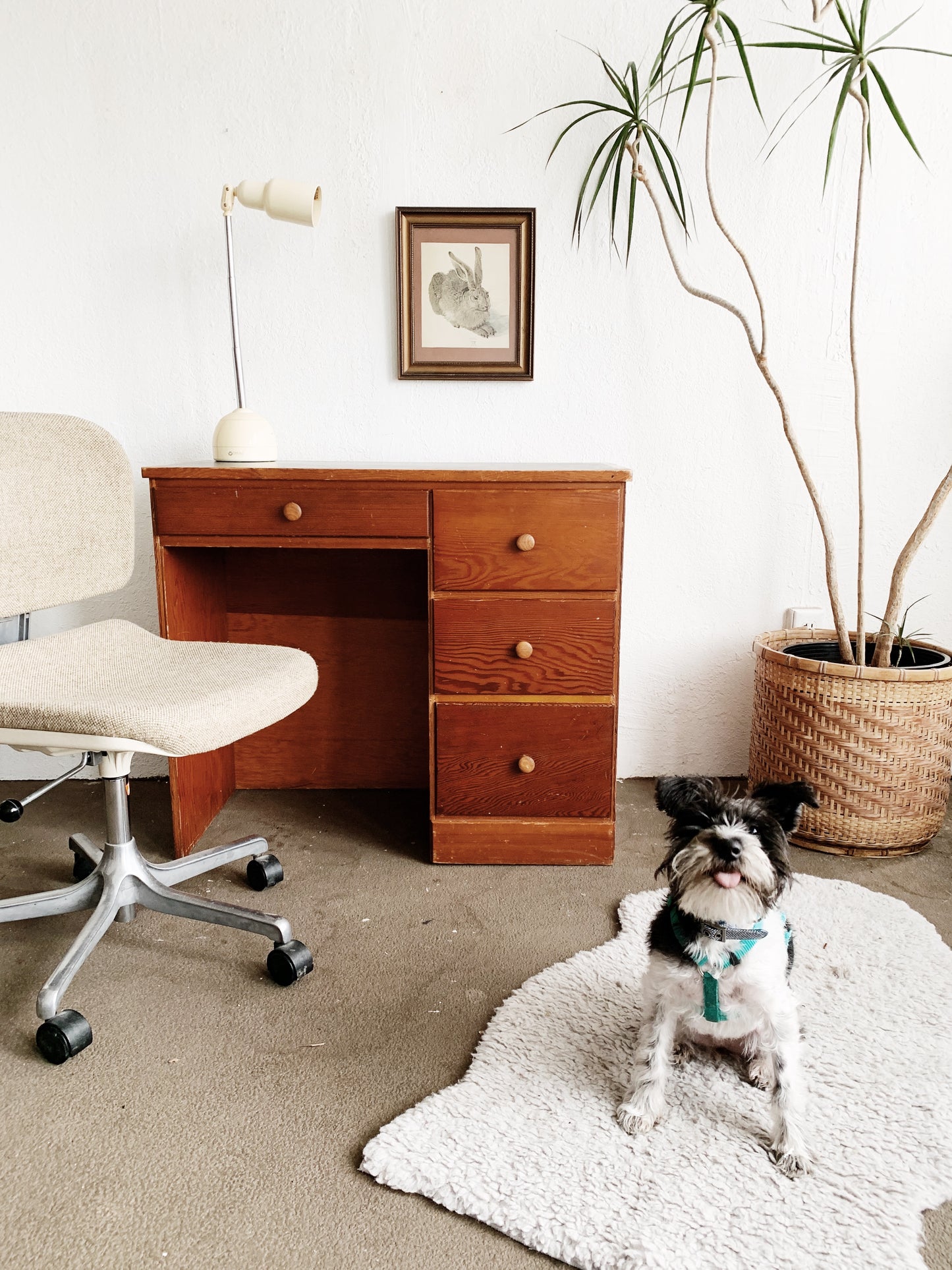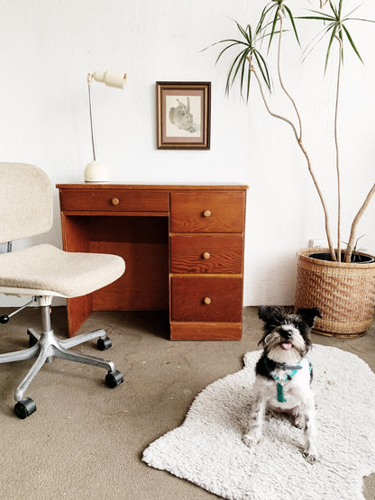 A nice old solid wood desk with four drawers. Painted top in high quality ben Moore scuffix paint. This makes a great student desk or adult bill paying/writing desk as it is full size.