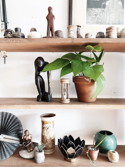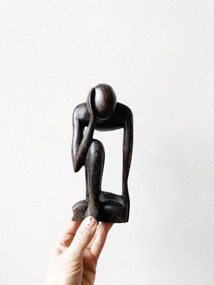 Vintage carved wood thinker statue. Most likely African and carved from one piece of wood