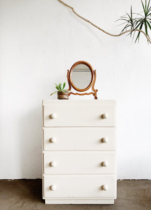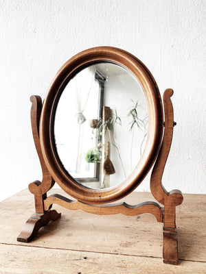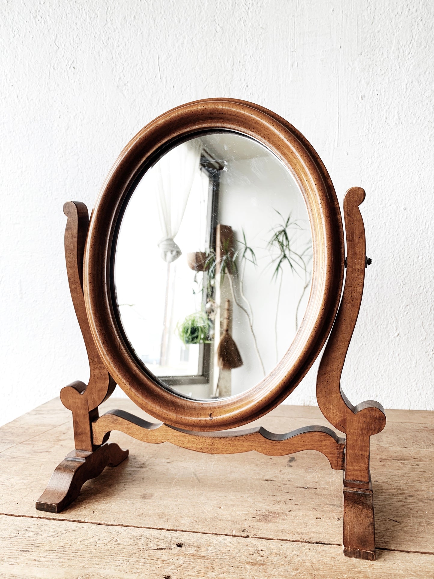 Lovely vintage wood vanity / dresser mirror in excellent shape. Love the curvy sides and bottom detail. Clear glass