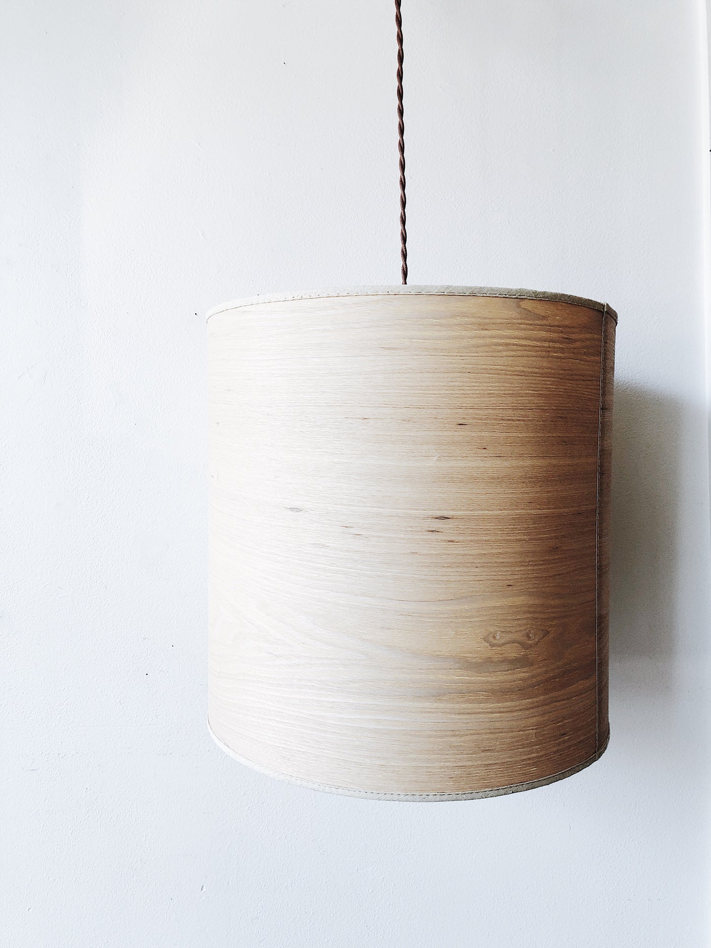 A giant woood veneer shade suspended from a pale cloth twisted cord. Zinc ceiling plate. Perfect over a dining table.