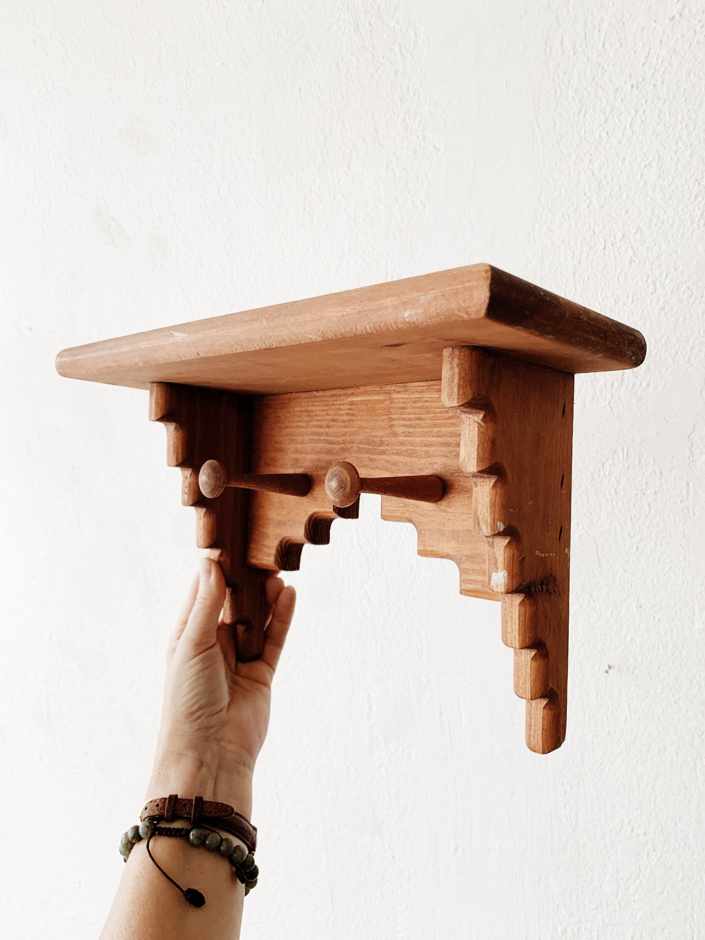 Great little wall shelf with peg hooks. Notched hangers on back. Great in the kitchen, bath or entry!