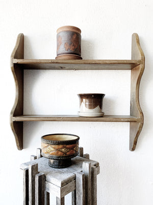 Larger sized vintage wood wall shelf with hangers on back. Sturdy construction and nice natural finish to the wood.