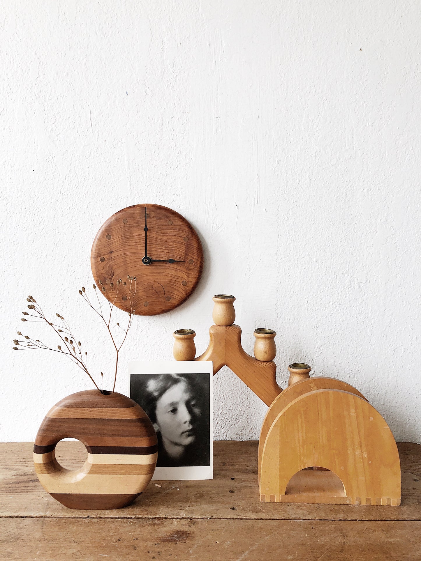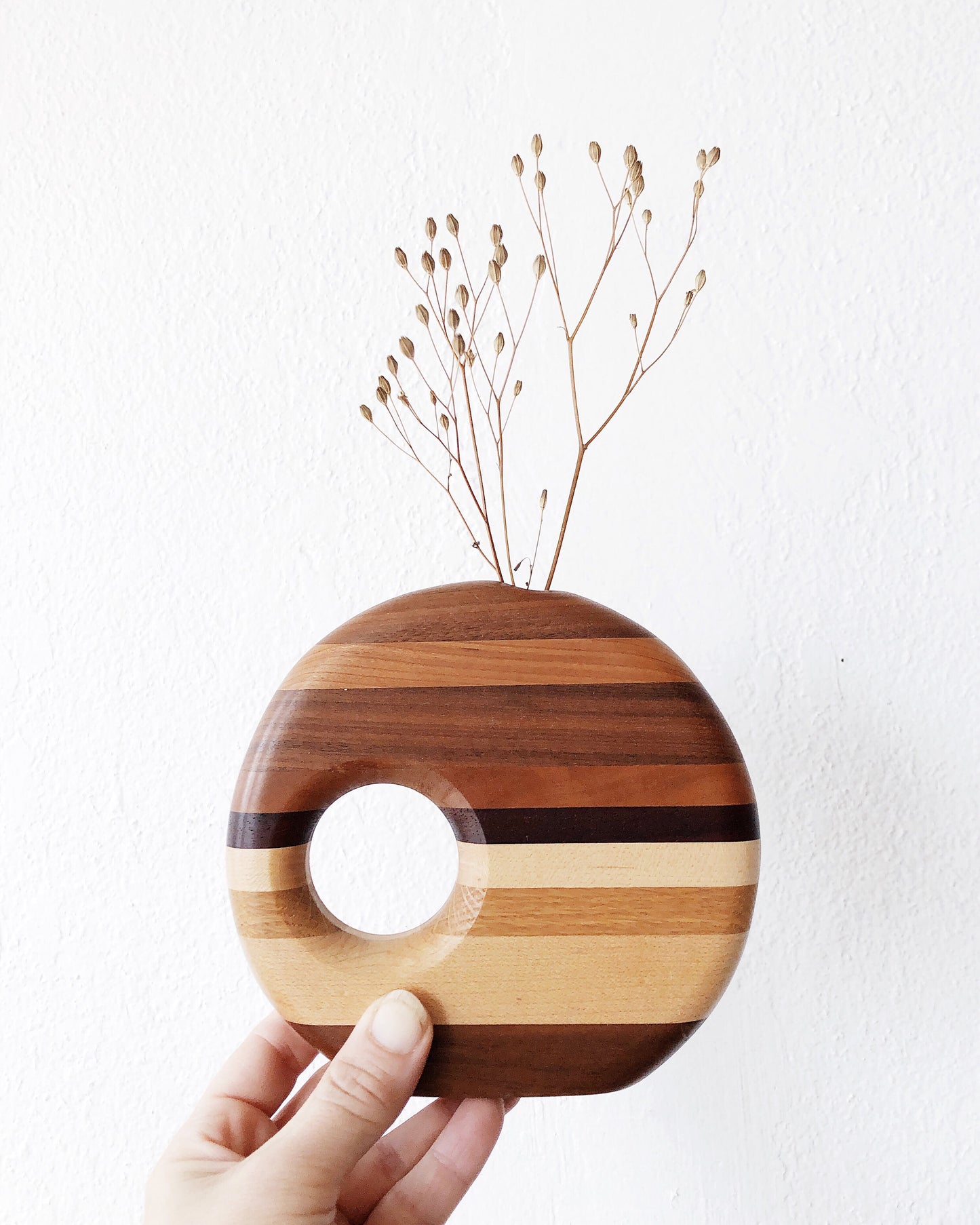 Pieced together multi wood weed vase. Love the asymmetrical shape.