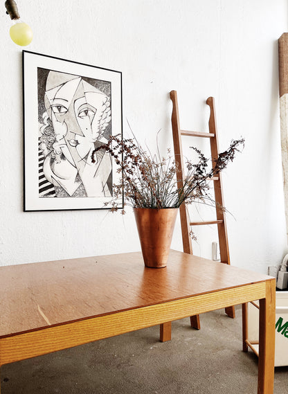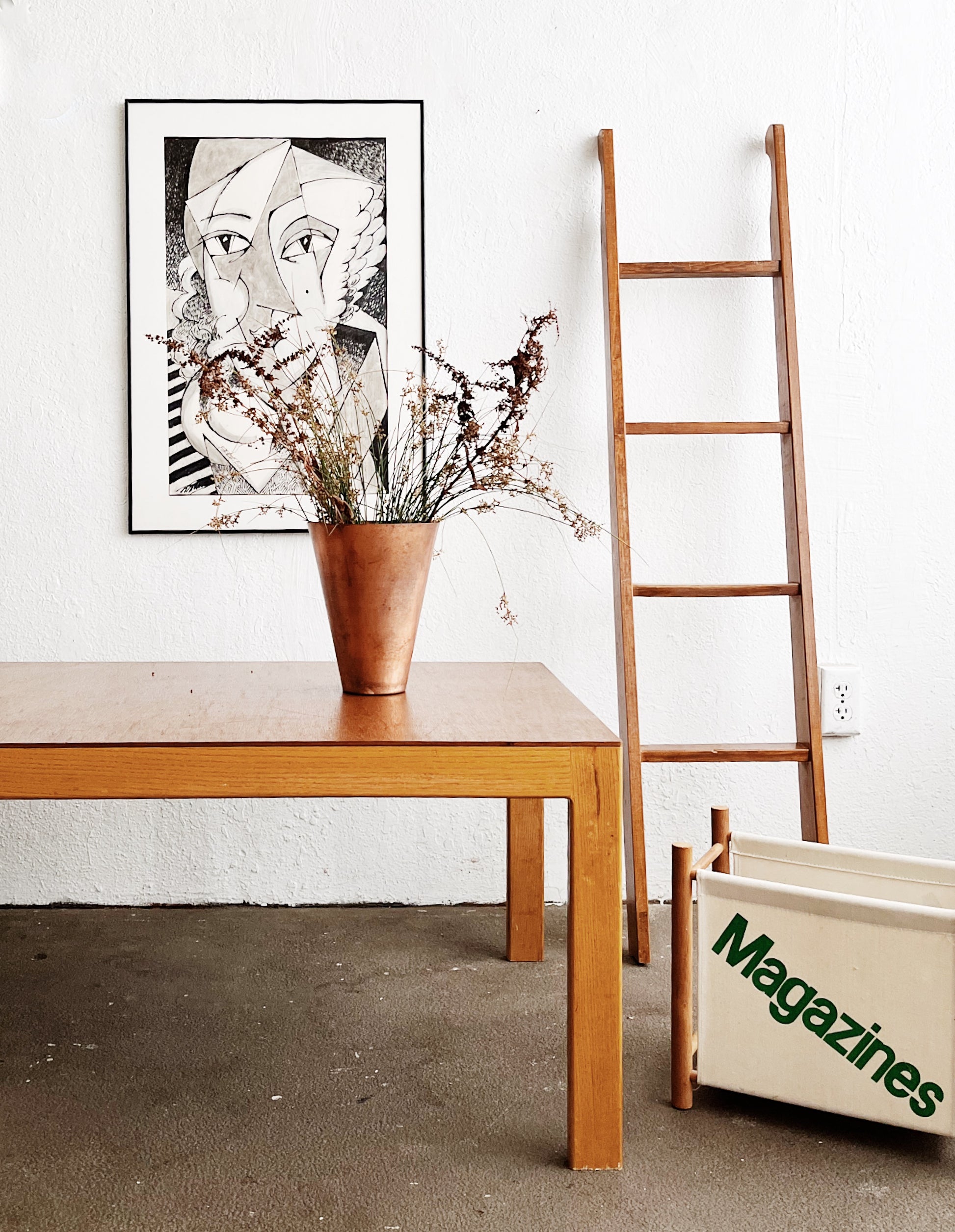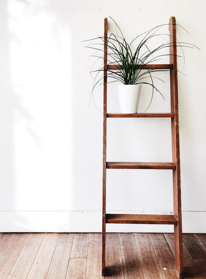 An old vintage ladder from a 1940s bunk bed set. These are great for displaying and storing textiles, plants, art, you name it. The ladder leans on its own against a wall…this one has a slight warp when leaning