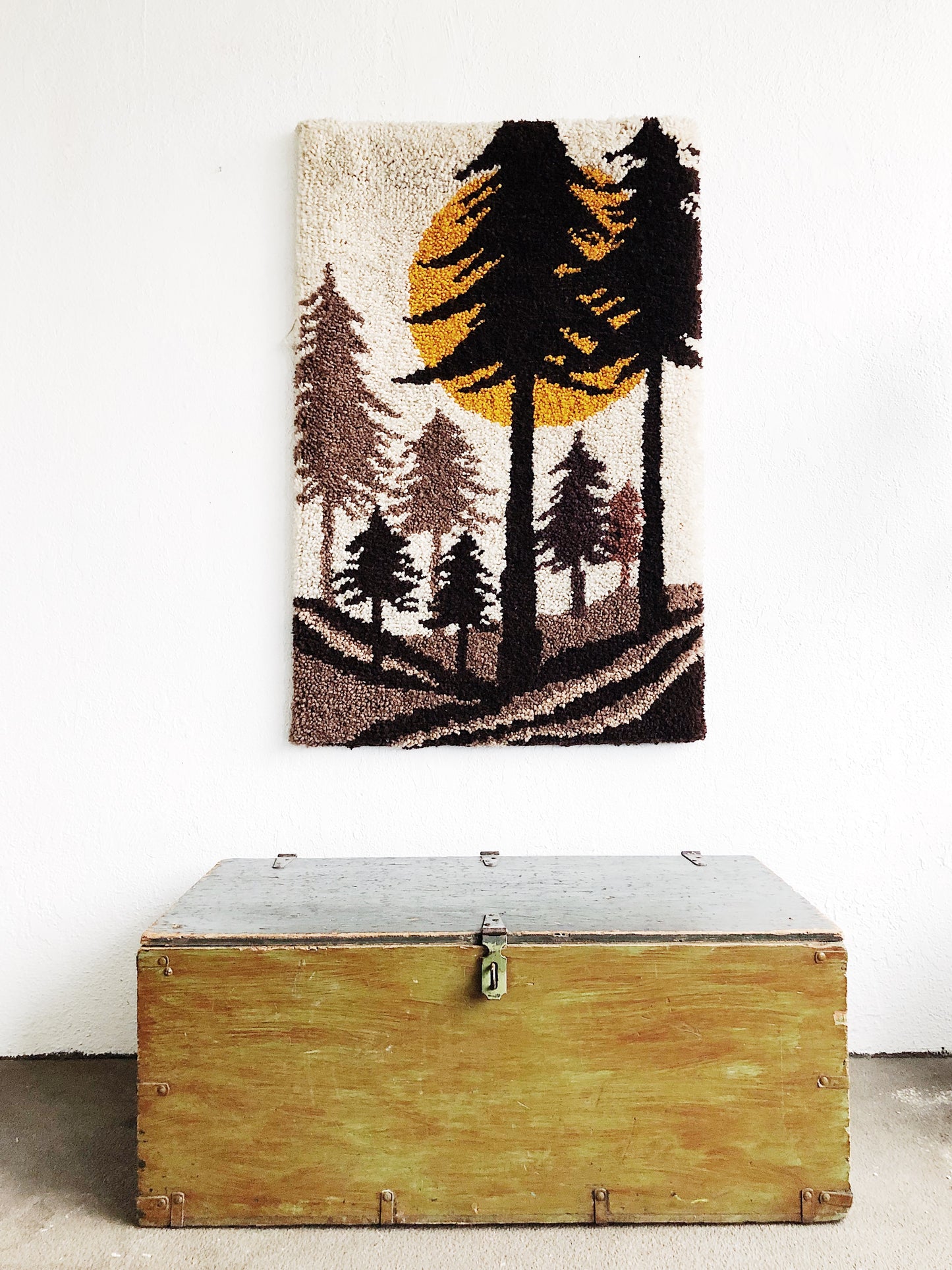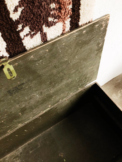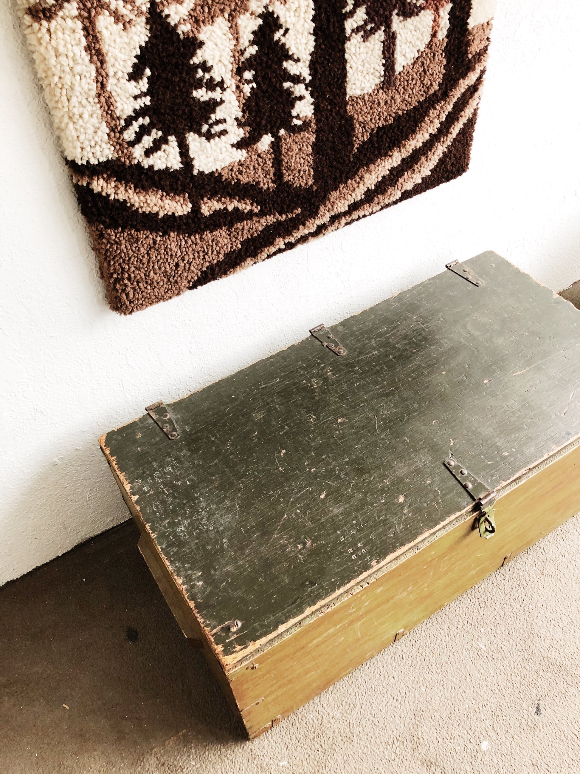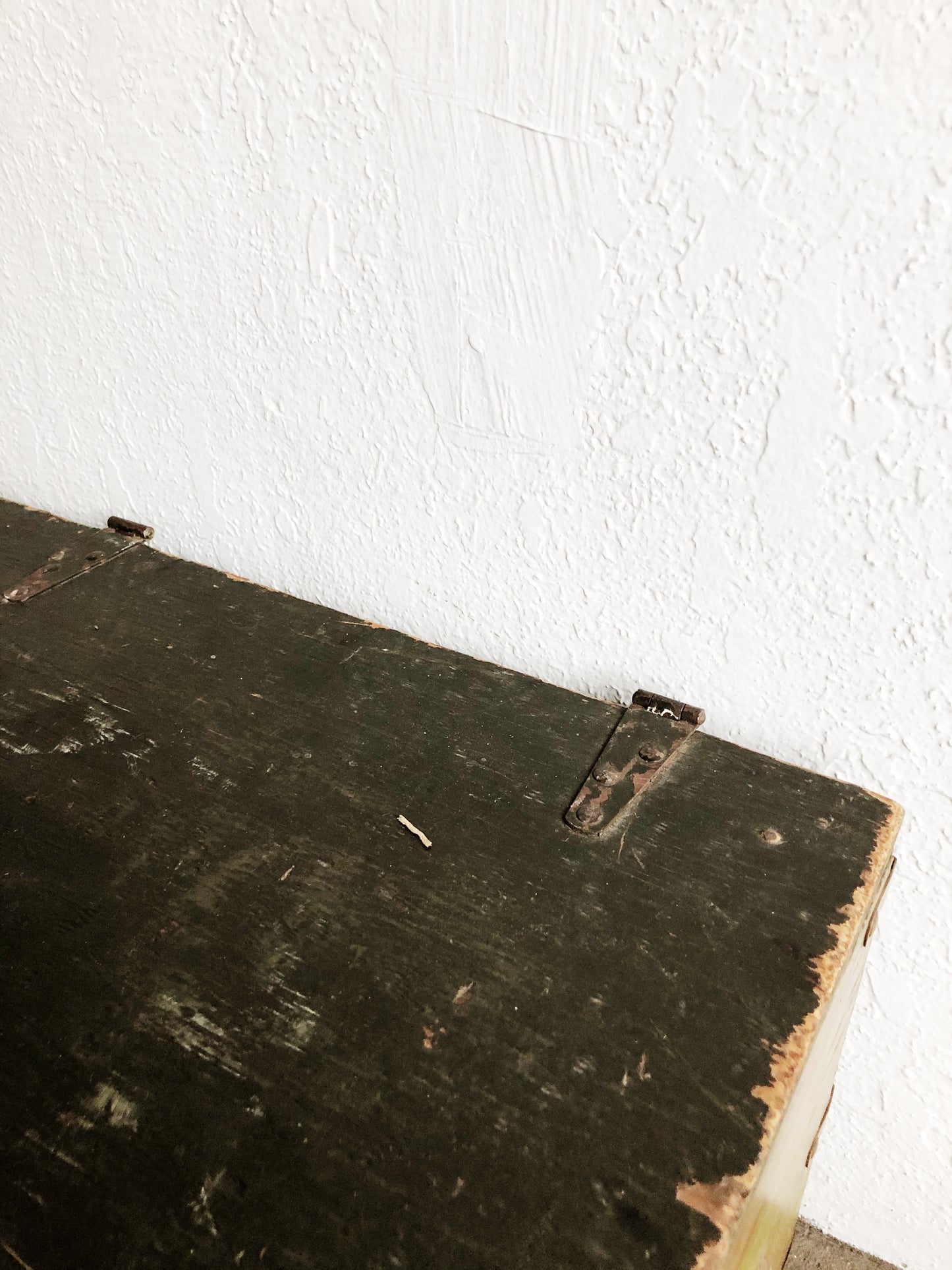 A nice solid industrial wooden trunk. The colors are great with olive green and sienna and a painted soft black top. Industrial hinges. Handles on the sides. Has a ledge inside for adding a shelf if you wanted to
