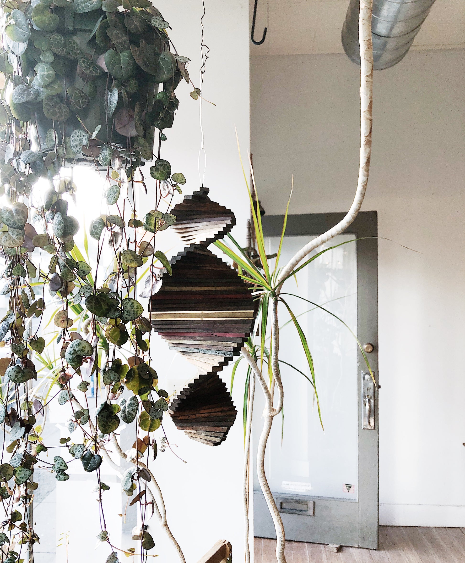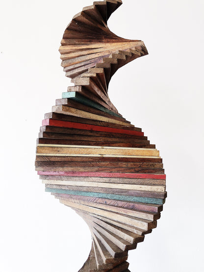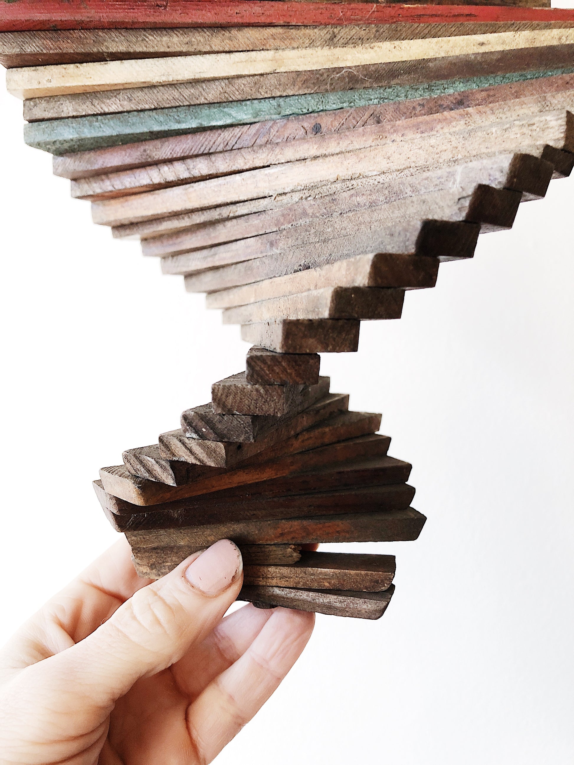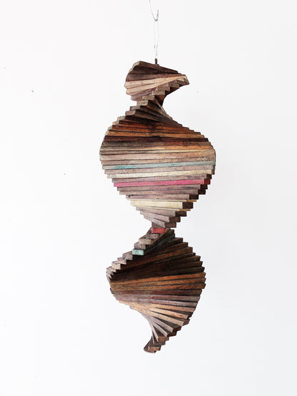 A wooden whirligig with faded colors and thin Lucite inserts. Sold as is with one area of breakage