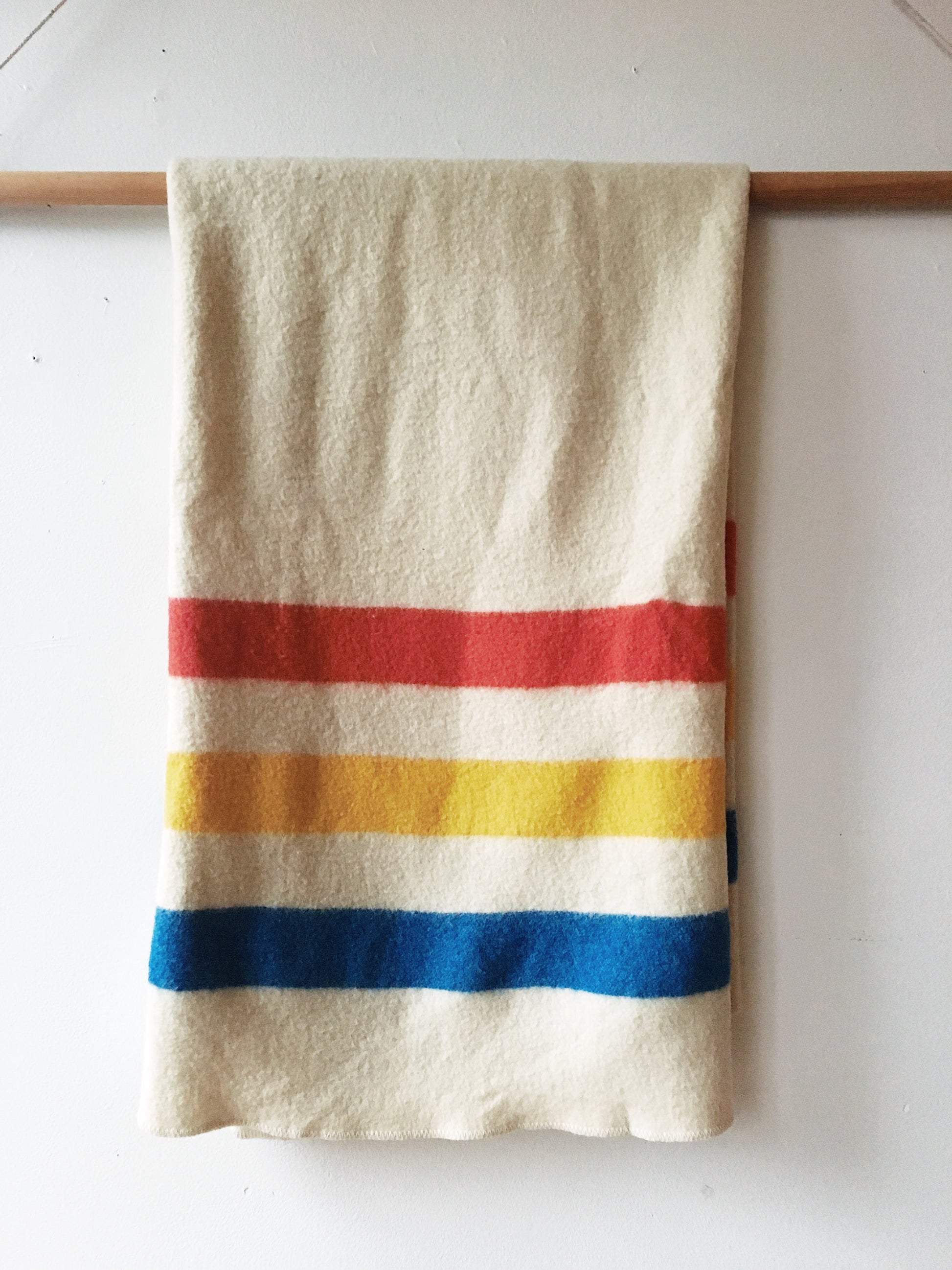 Fantastic vintage wool striped blanket in excellent condition except for one tear close to the seam that could easily be patched or stitched up.