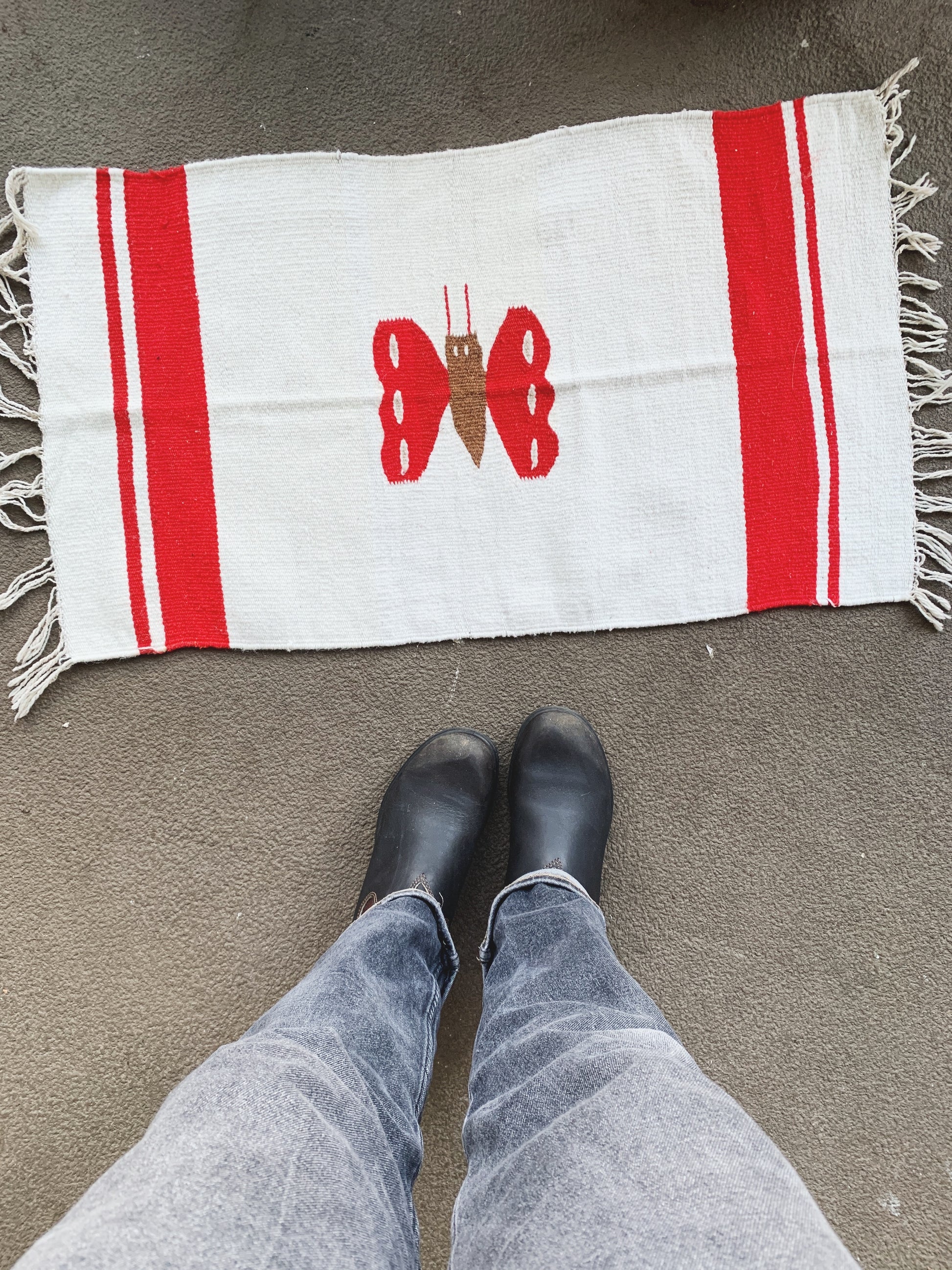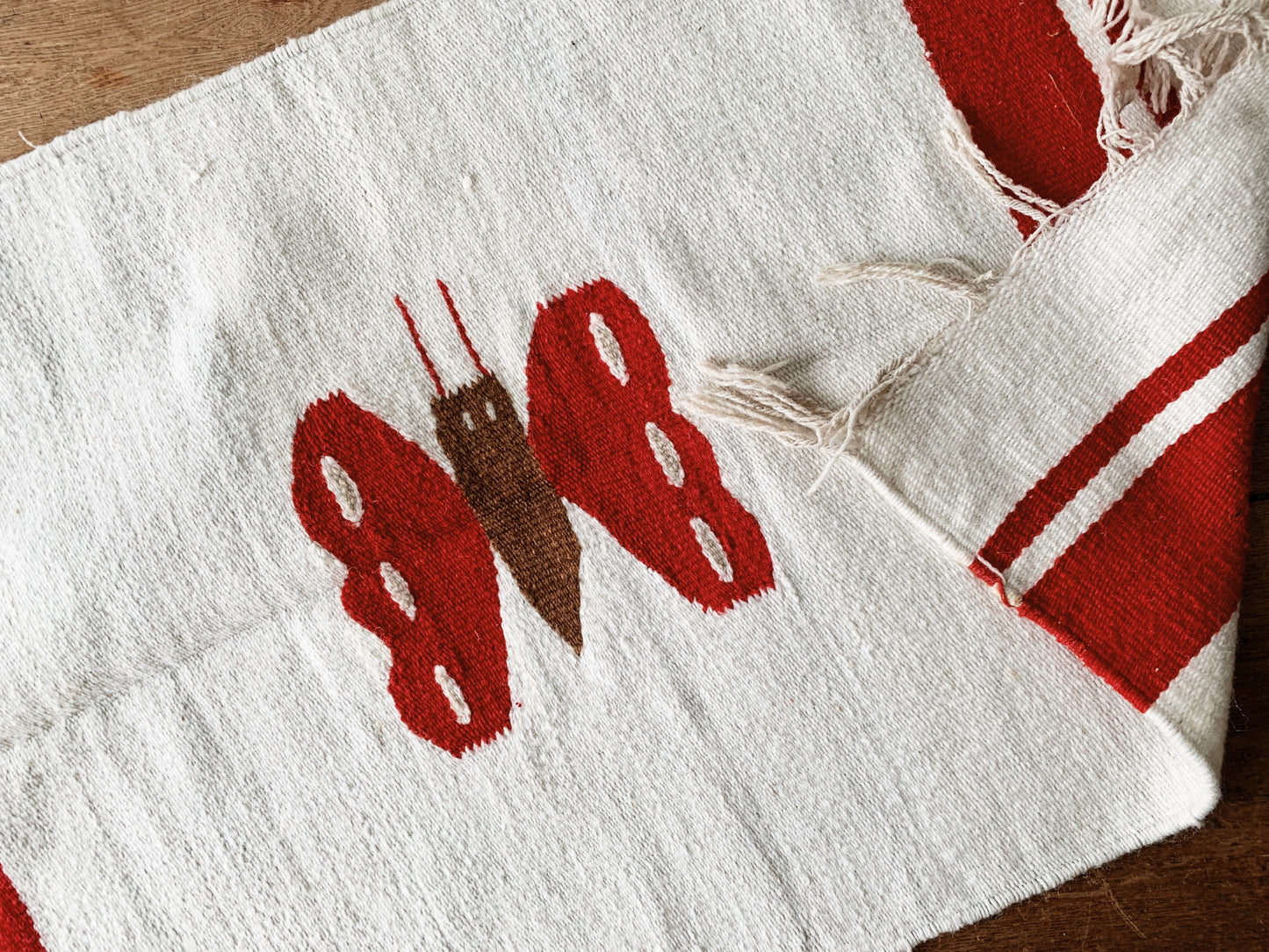 Sweet little butterfly rug or wall hanging. Cherry red, brown and cream in excellent shape. Cute in the bathroom, kitchen or child's room