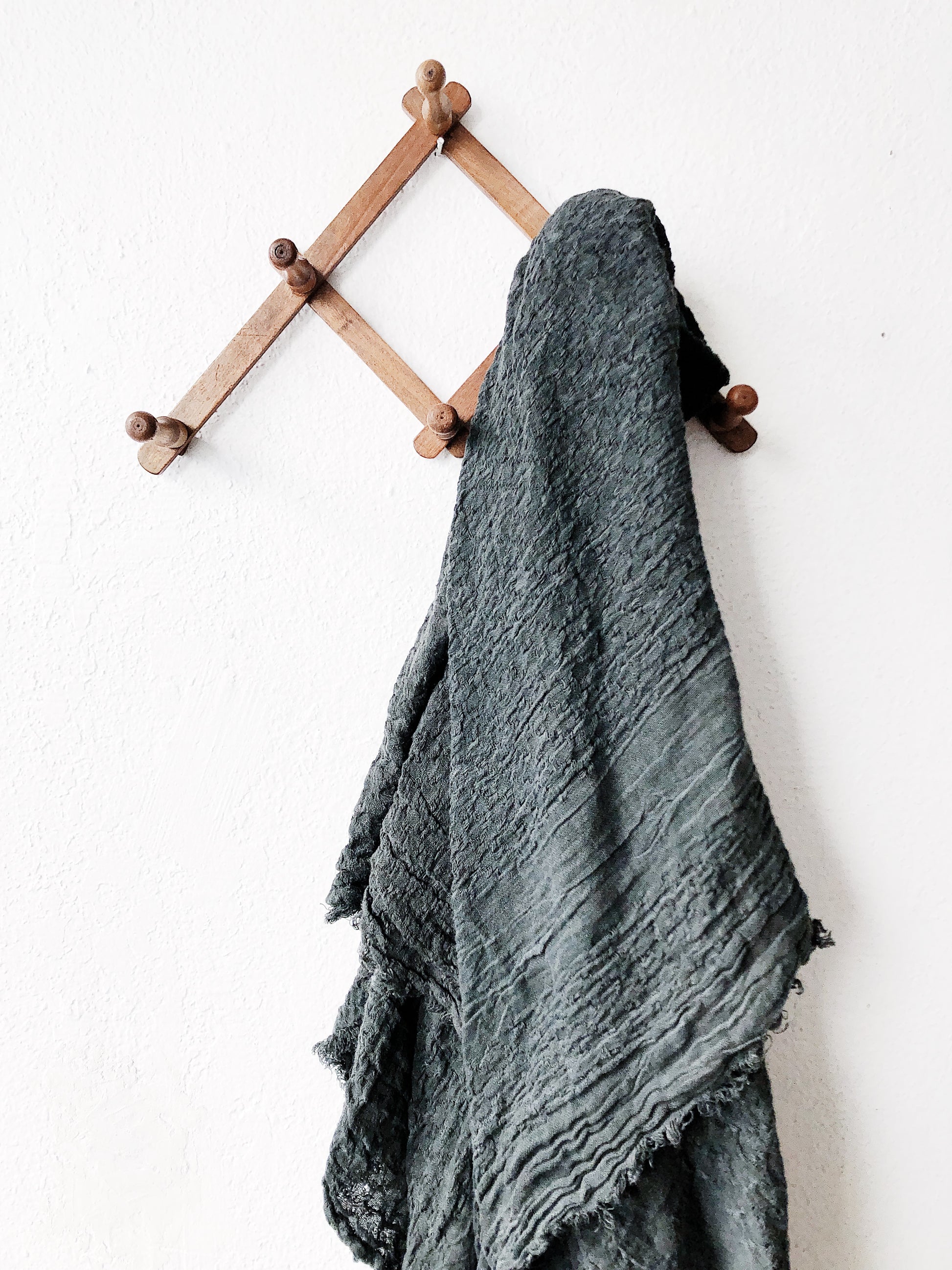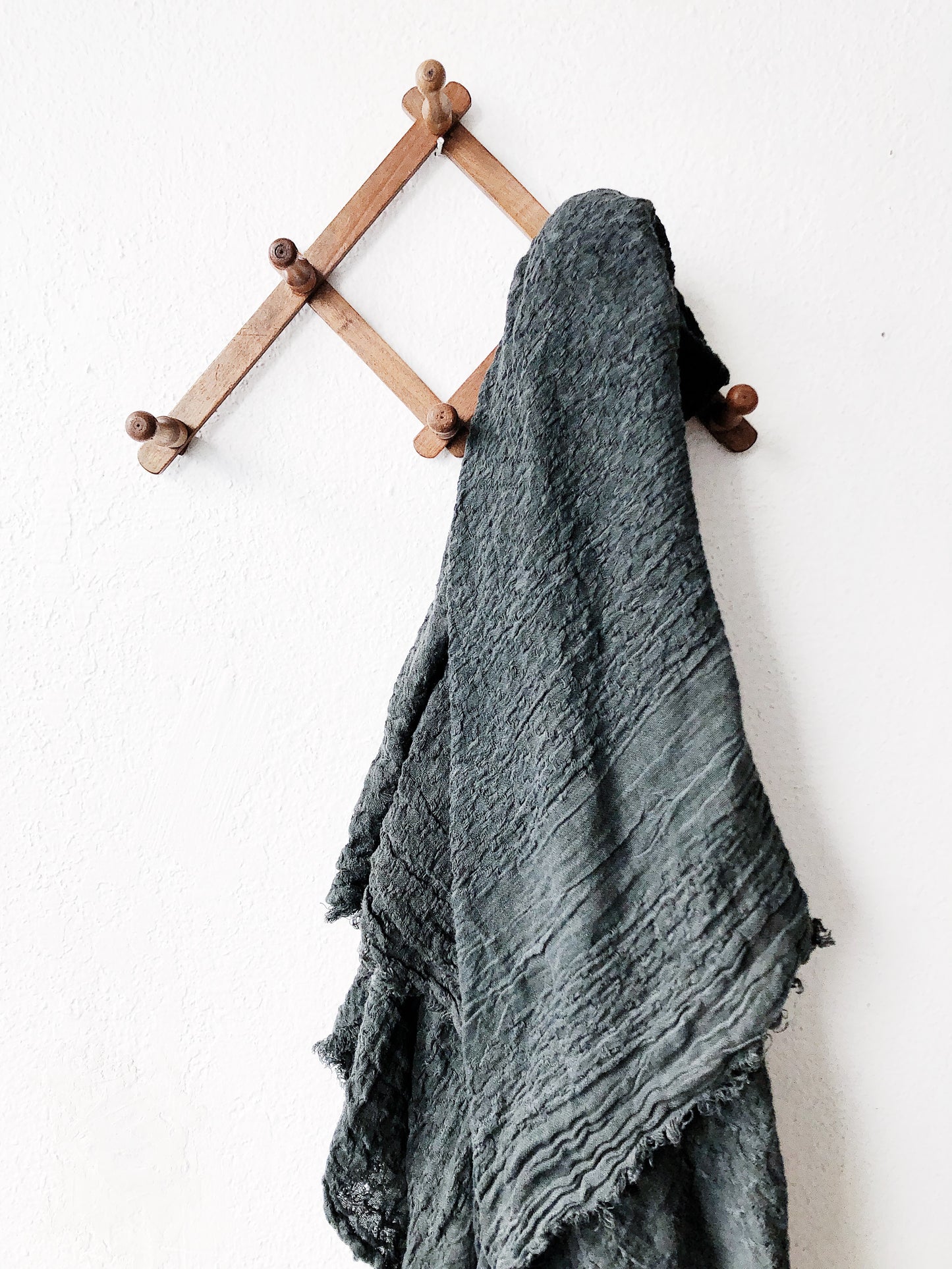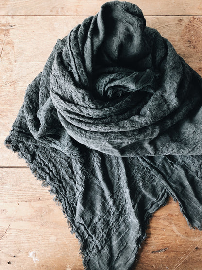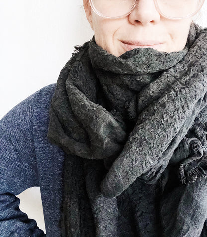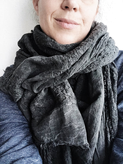 A fine gauzey wool blend scarf from Morocco. Finely woven with tiny fringed ends. Warm yet airy. Charcoal grey