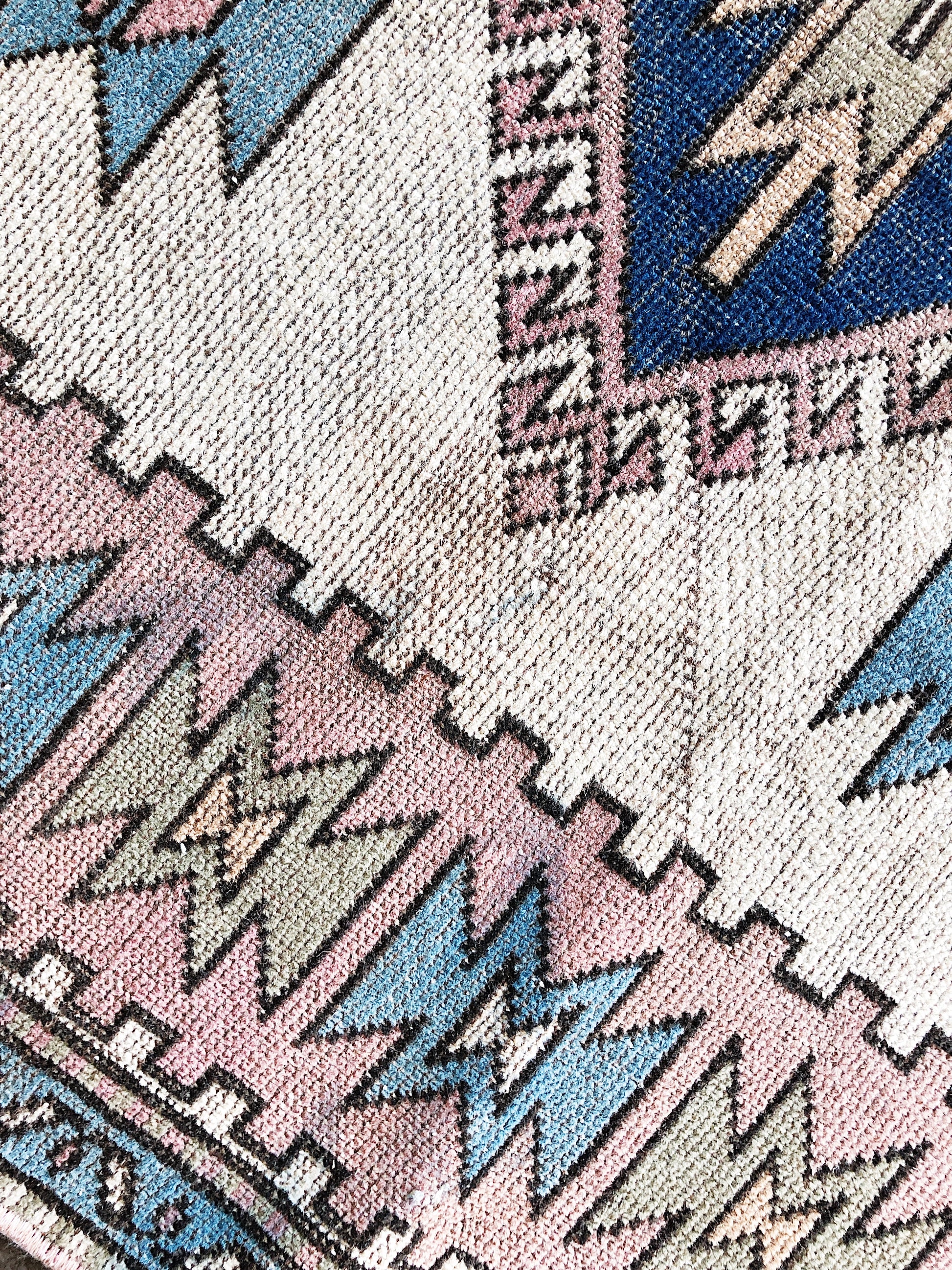 A stunning Turkish wool kilim from Kars. The pale turquoise and clay pink with the indigo is so good. Great larger sized too. A couple of areas of dye bleed but not bad at all