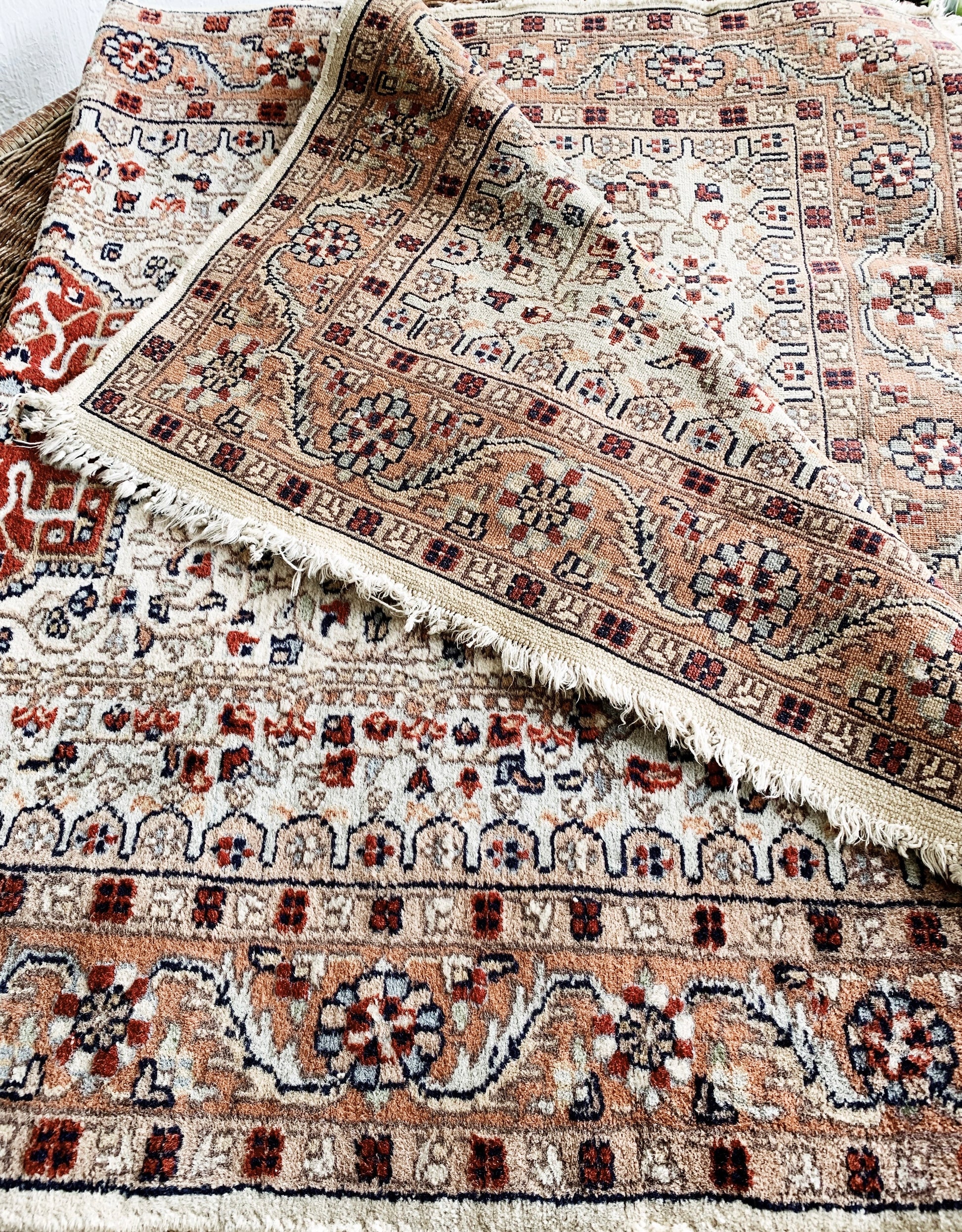 Beautiful vintage velvety soft wool prayer rug in nice condition. Minimal fade, no stains or tears but some age to the side bindings. Typical for the age.