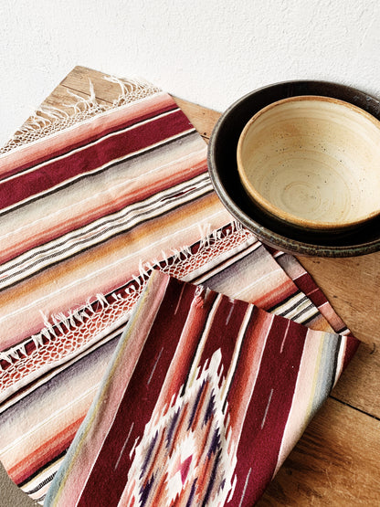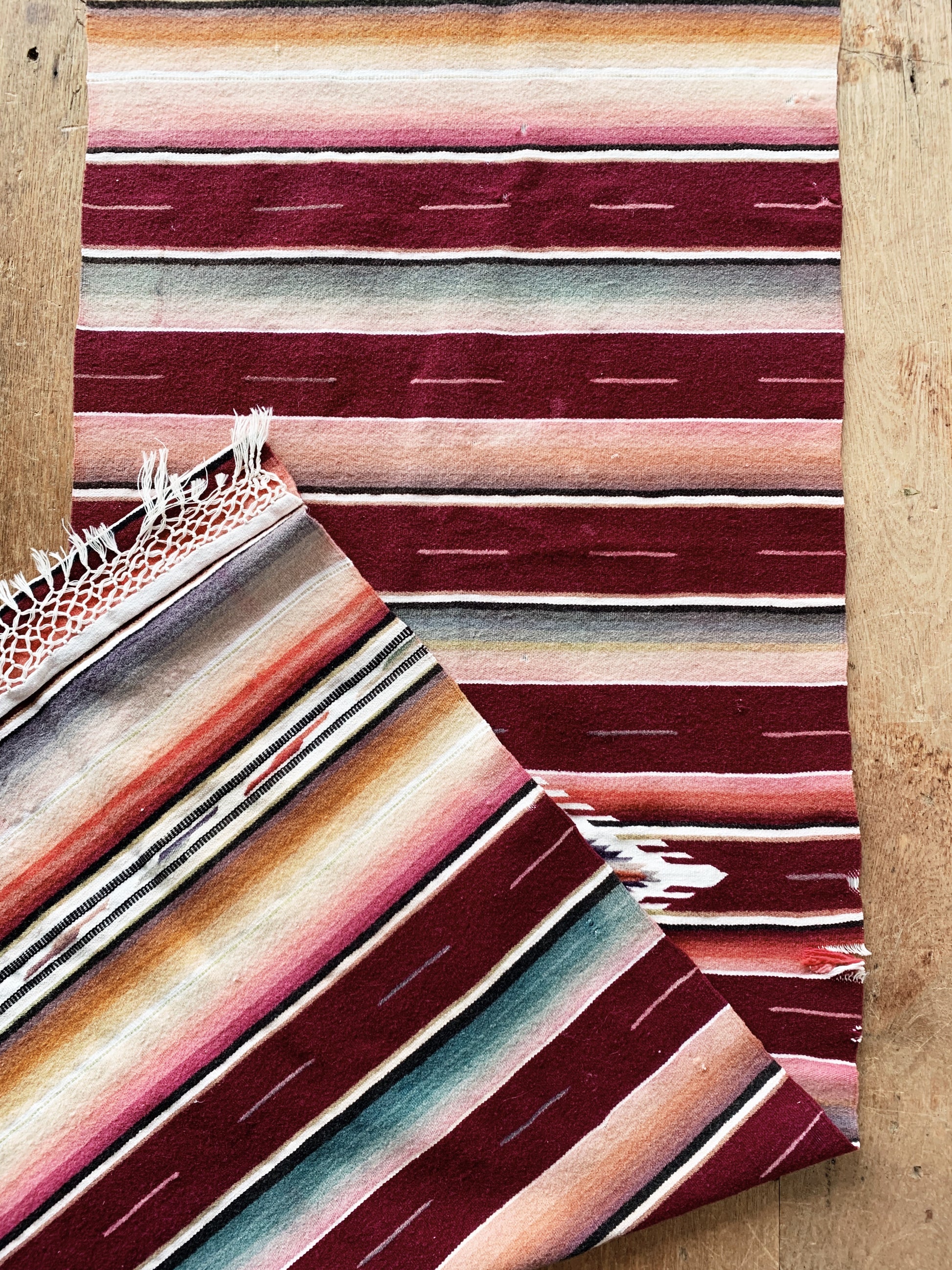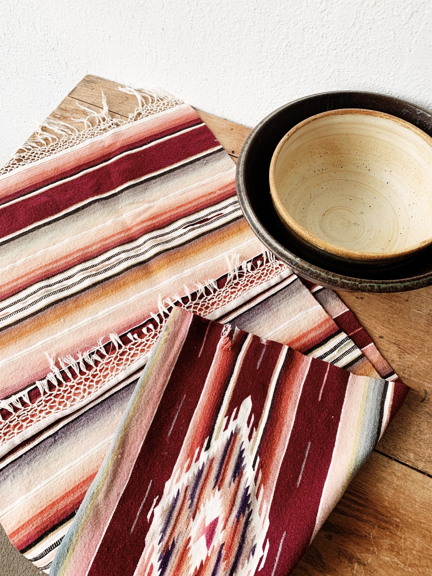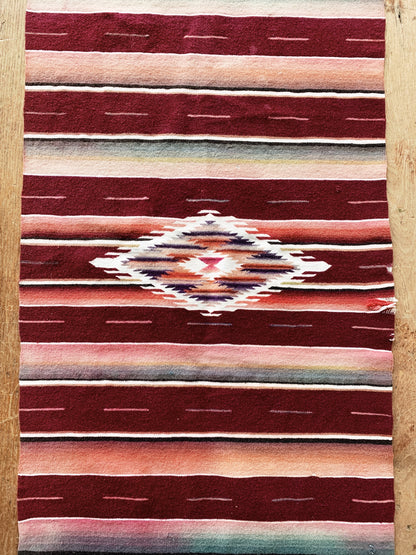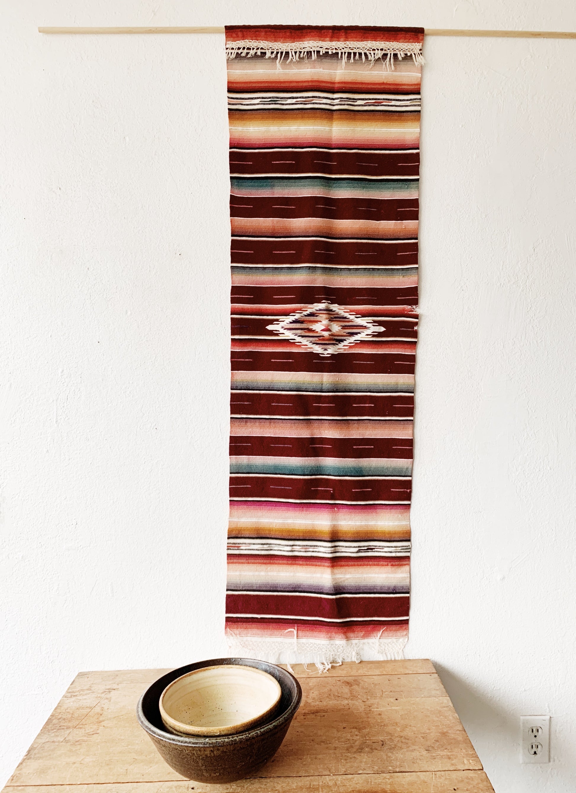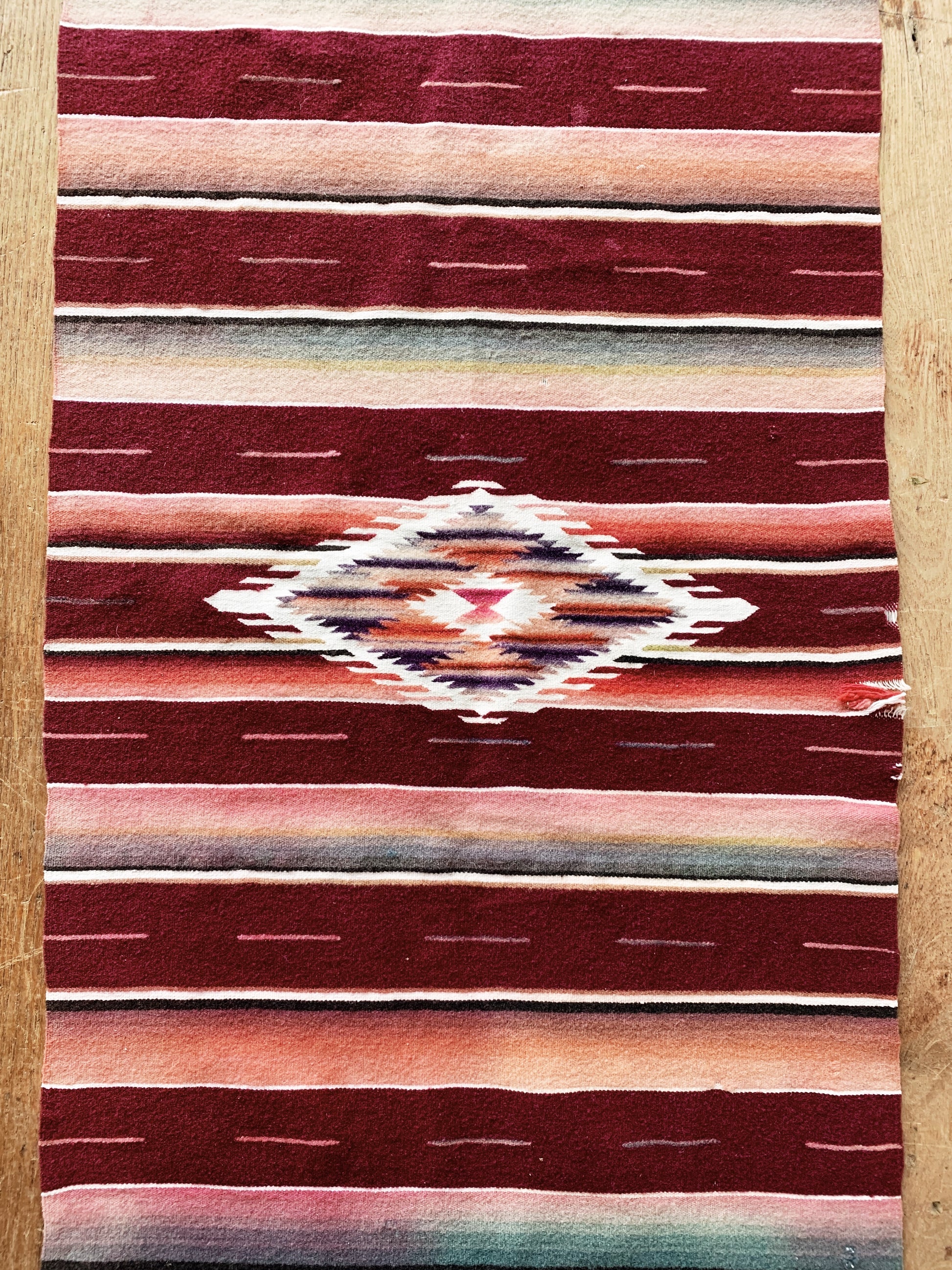 Pretty vintage wool Saltillo runner with rod pocket on one end for hanging if you chose. Cranberry, faded lavender and smoky grey indigo. In nice condition, has one small area of gray along one side which only adds to its charm. See photos.