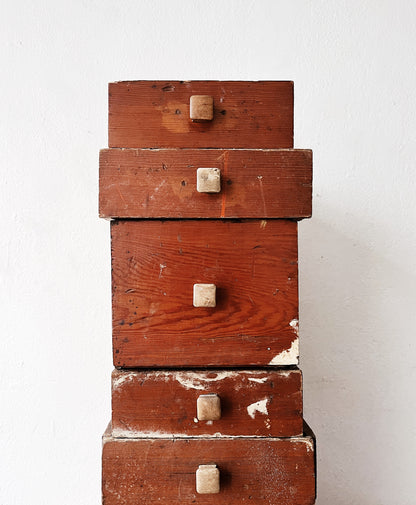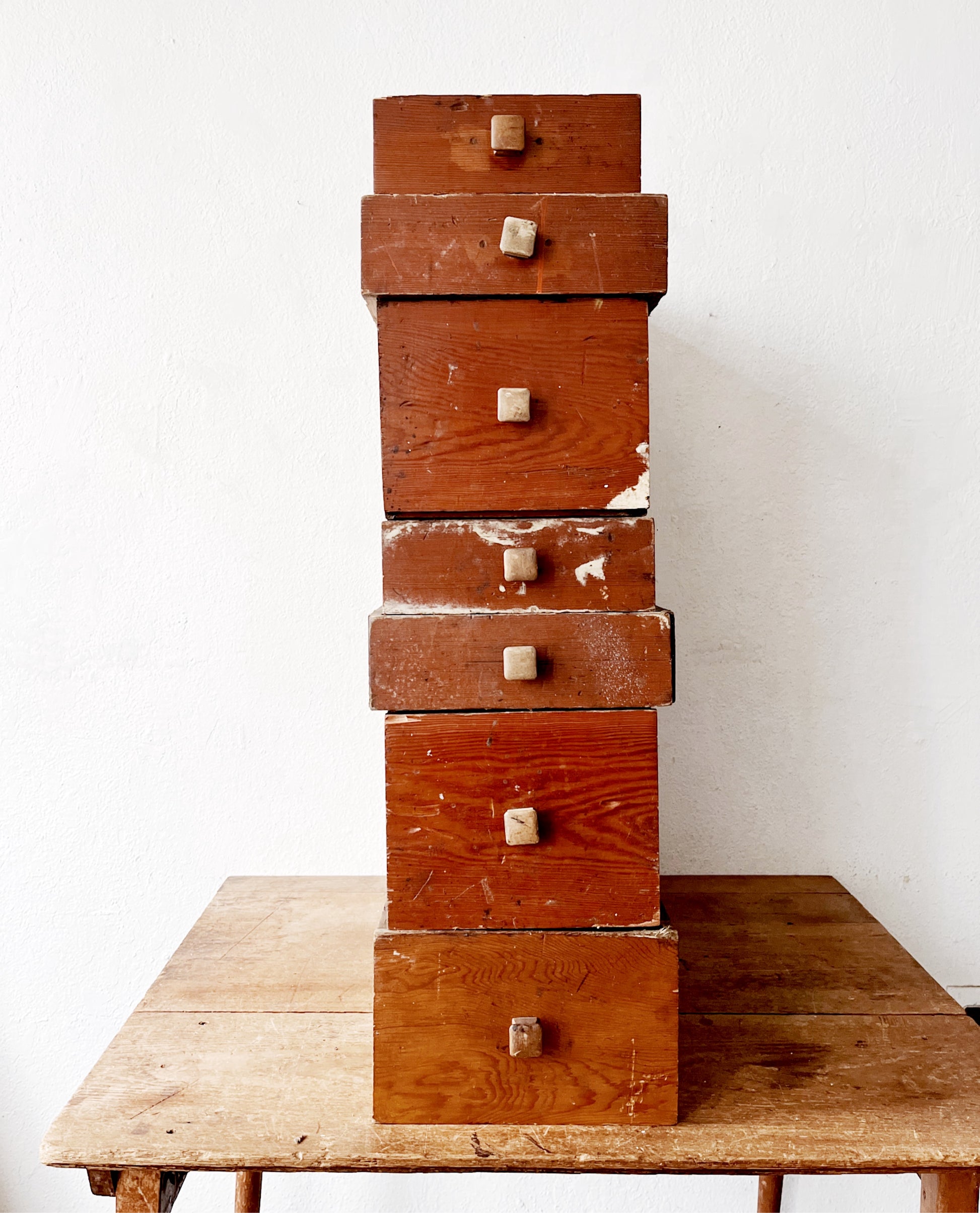 From an old 1950s workbench. A full set of drawers. Handmade. Great little pulls. Some are divided. We like to stack these just as is for a deconstructed look. They would fit under most desks too. Sturdy and selling as found
