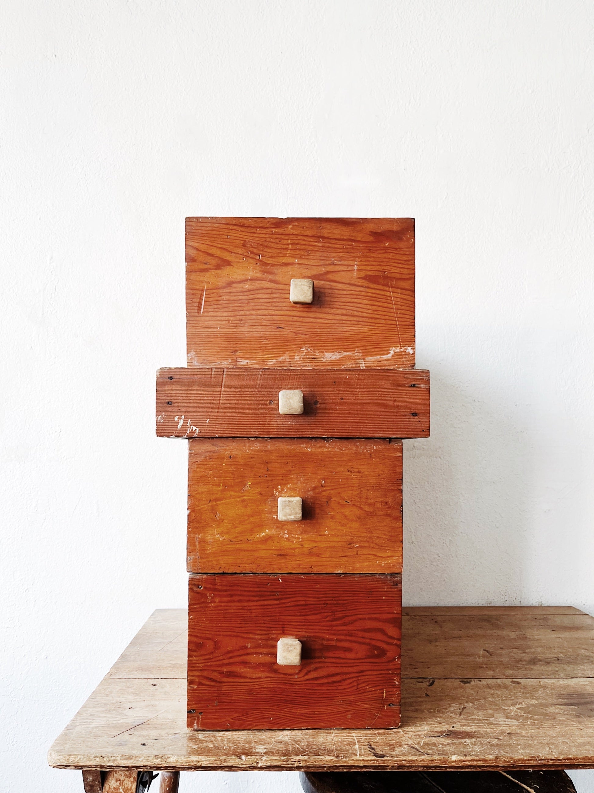 A set of four Fir drawers from an old 1950s workbench. Handmade. Great little pulls. We like to stack these just as is for a deconstructed look. Add some wheels to the bottom. They would fit under most desks too. Sturdy and selling as found