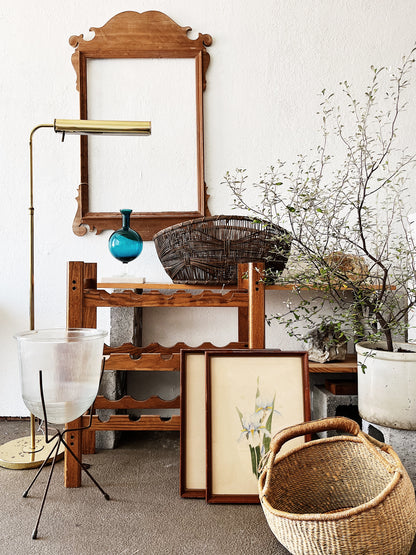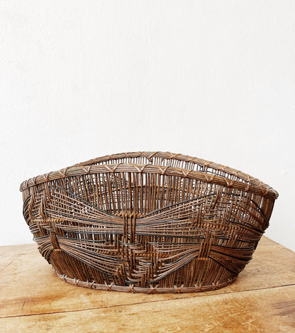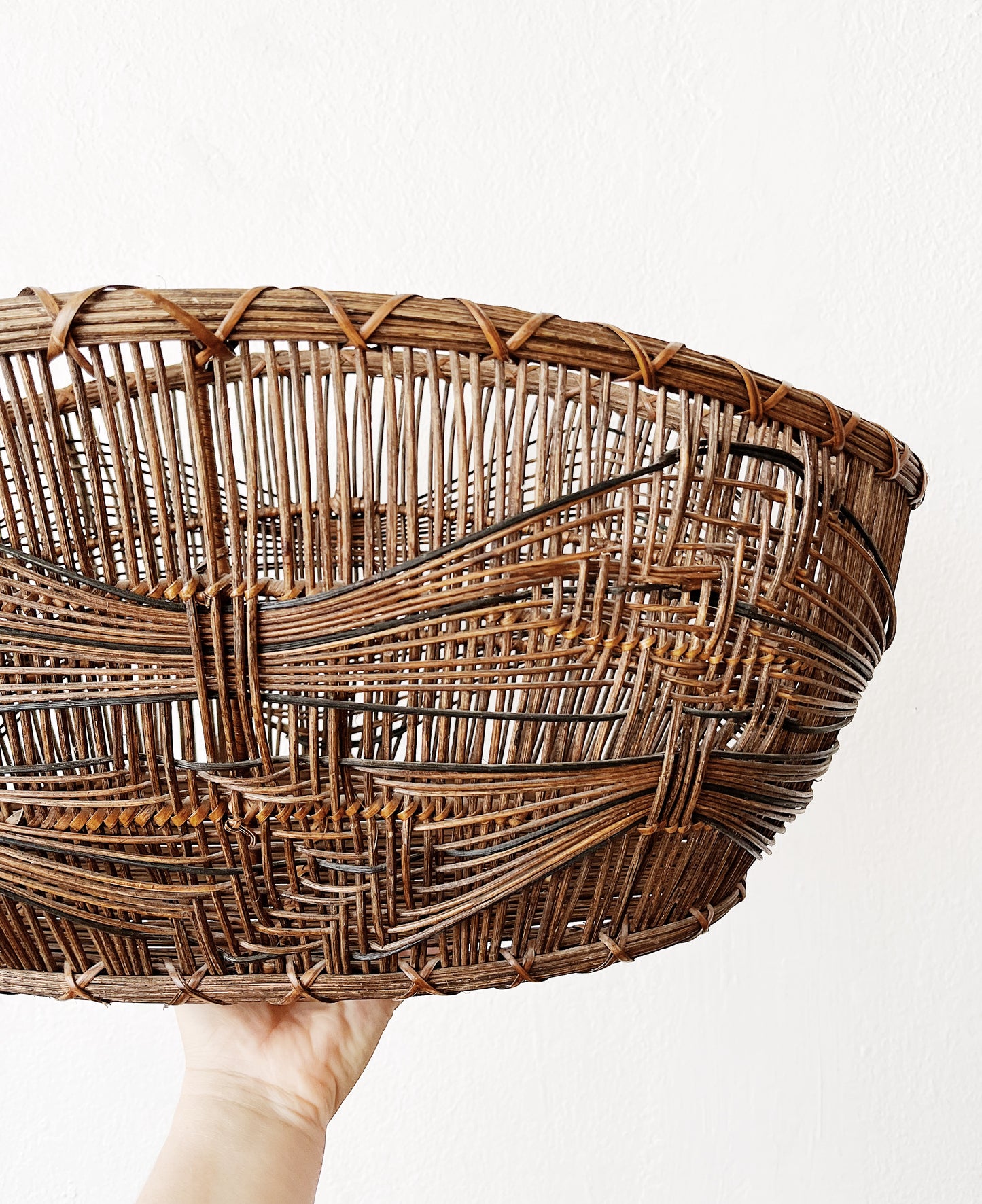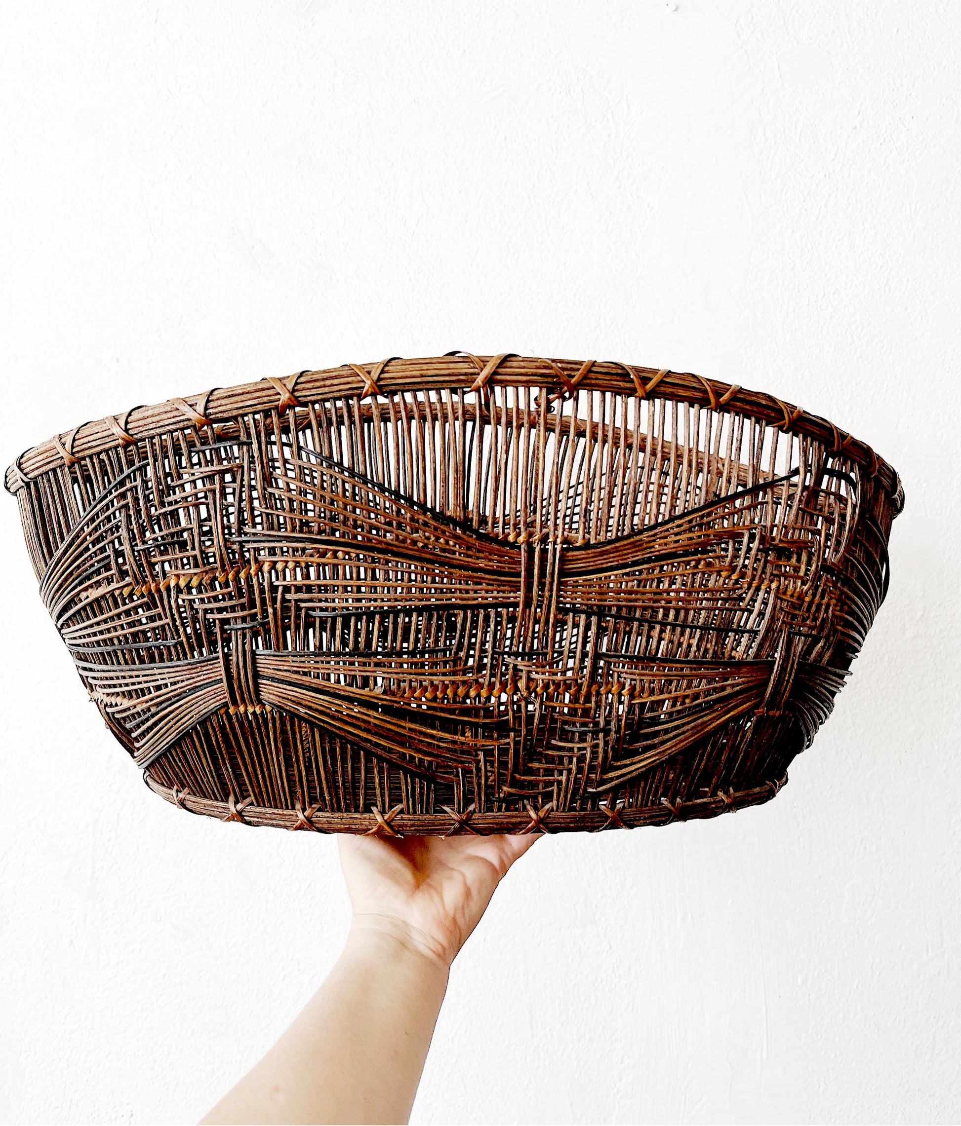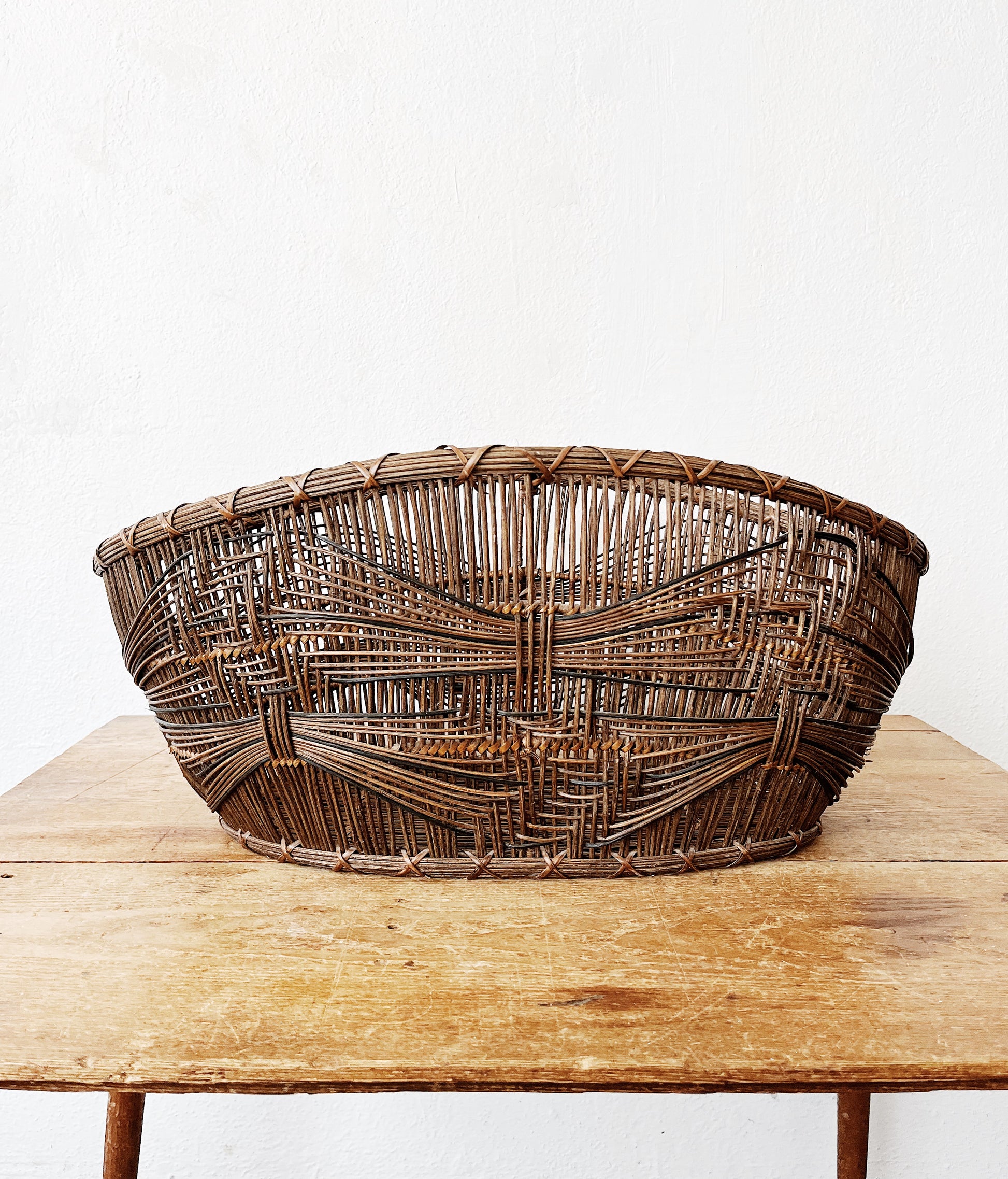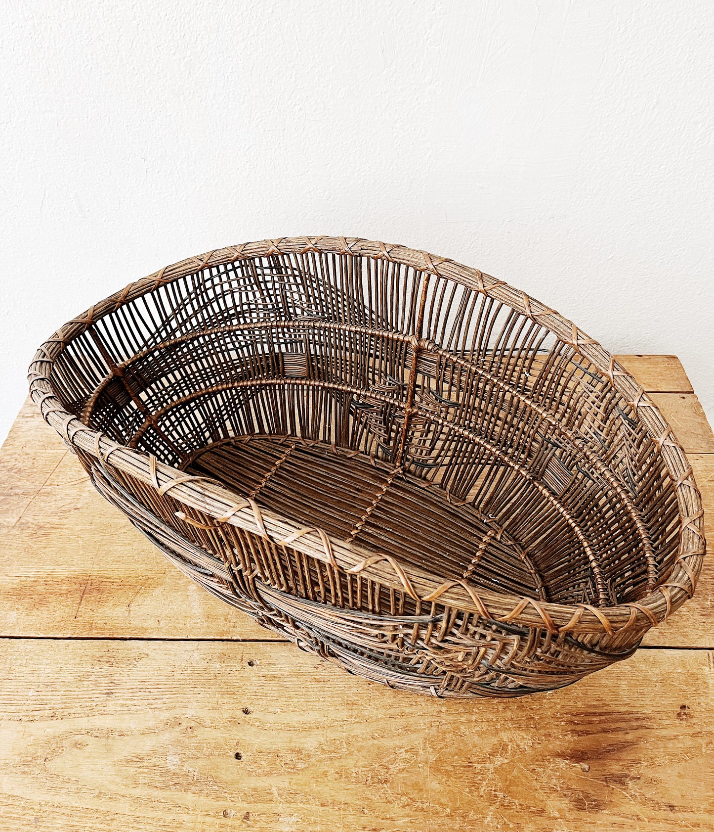 Lovely shape and weaving to this old basket. General storage for sure but the shape lends itself to holding kindling or small logs too.