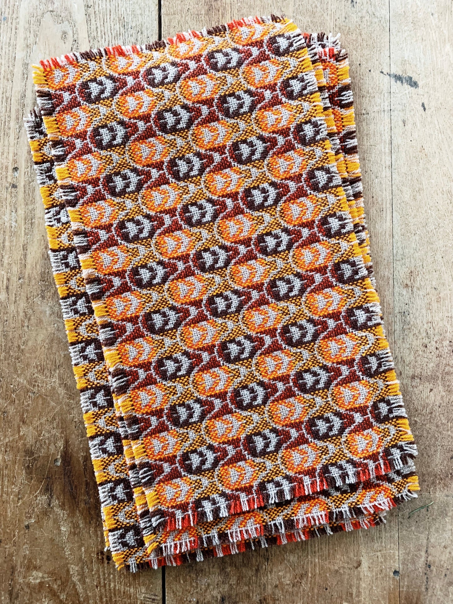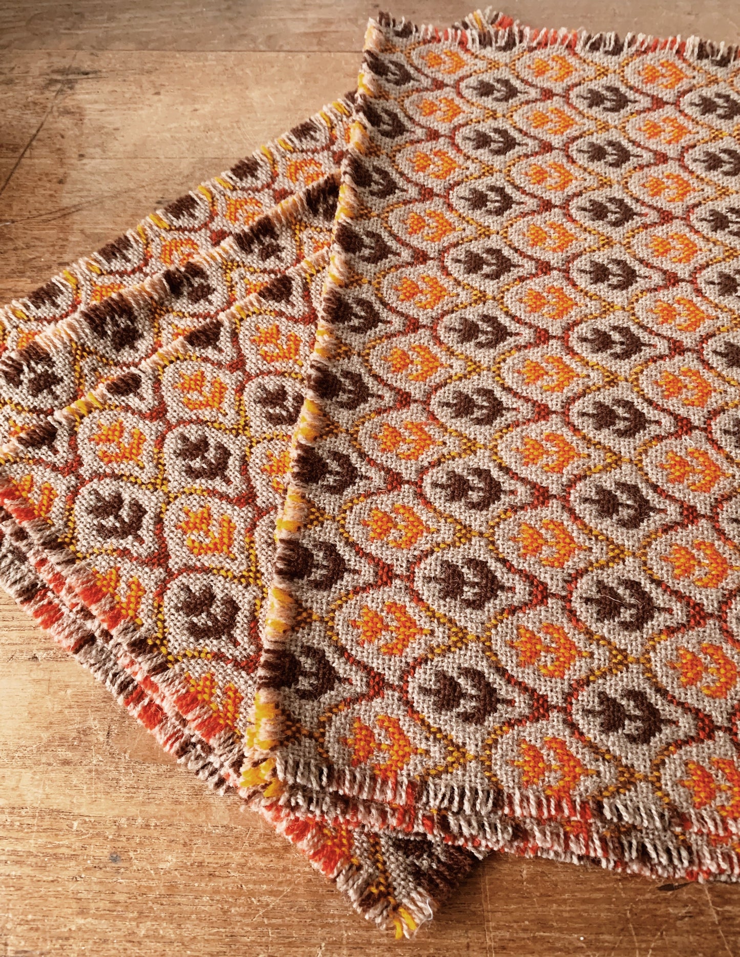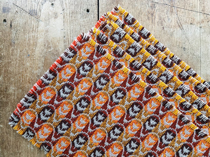 Lovely set of woven placemats with abstract Danish tulip patterning. Pretty warm colors. Excellent condition. Set of six