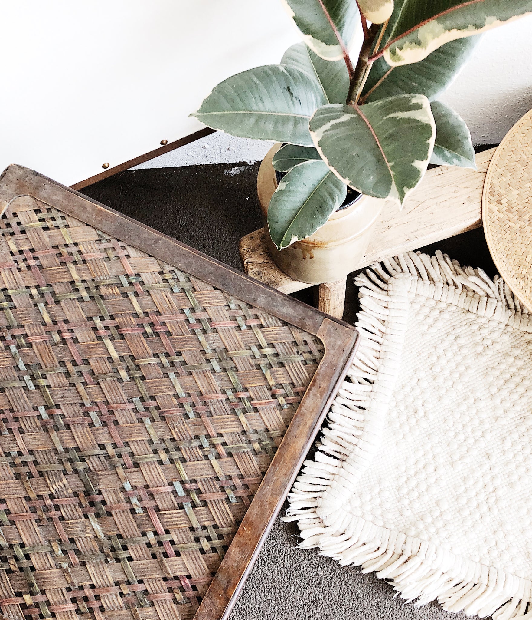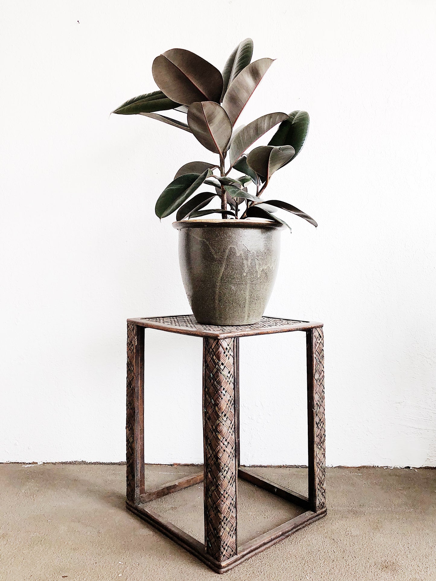 Vintage woven side table with muted coloration to the straw. Wood framed. Cube style legs. Works as a plant stand too