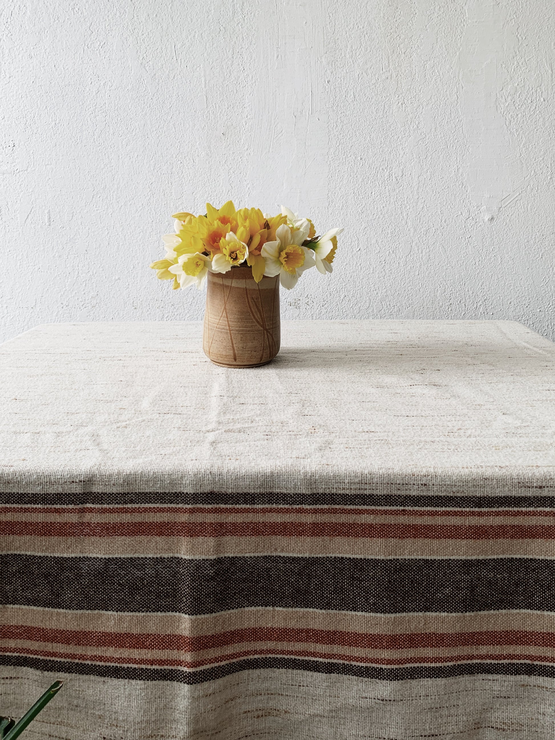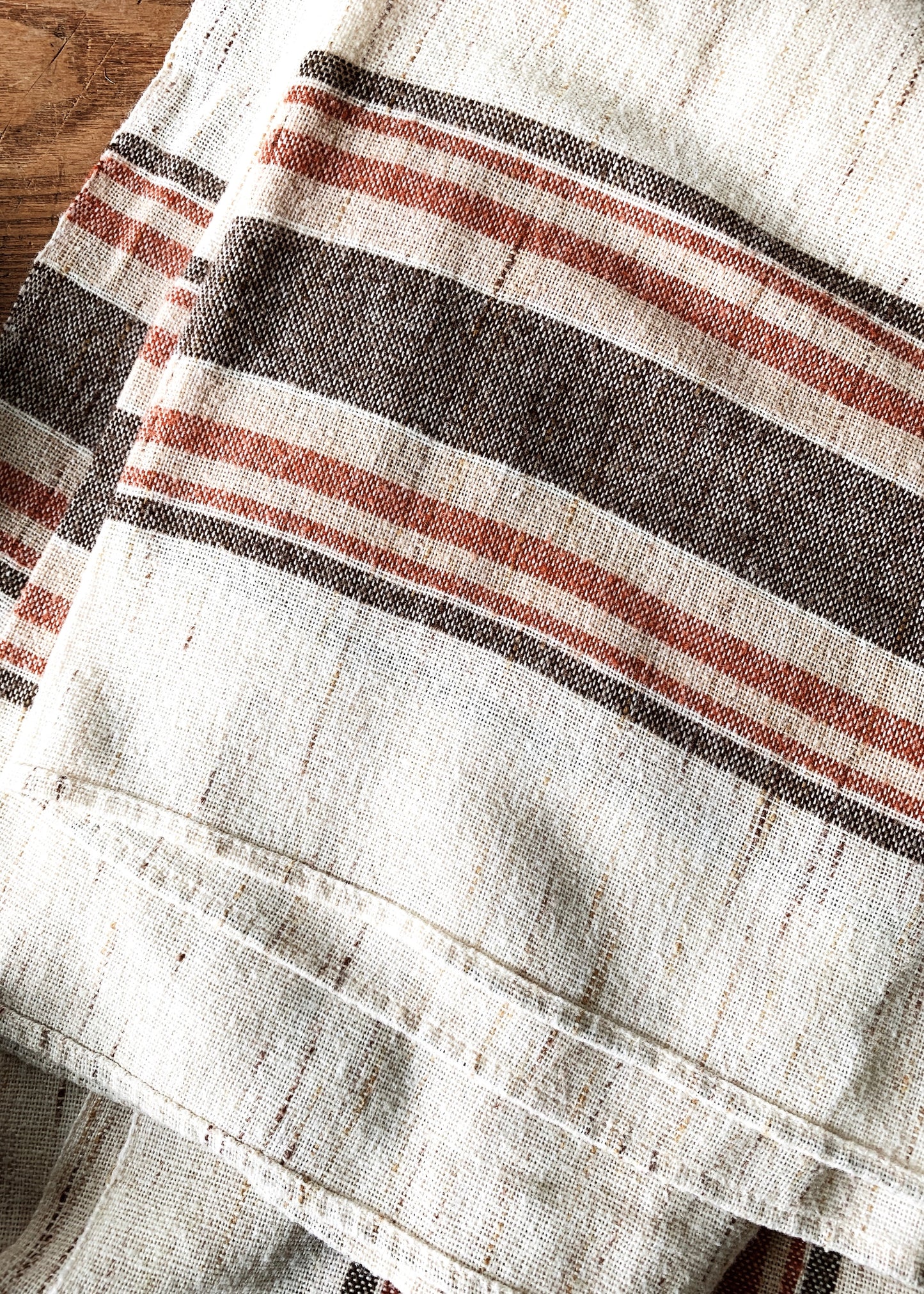 Nice vintage woven tablecloth with earthy edge stripes, solid neutral base. Good size at 50x69”.