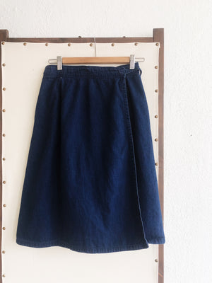 Vintage LL Bean denim wrap skirt with pockets! Super soft indigo denim. Nice drape and flattering with the front yoke. A line in shape