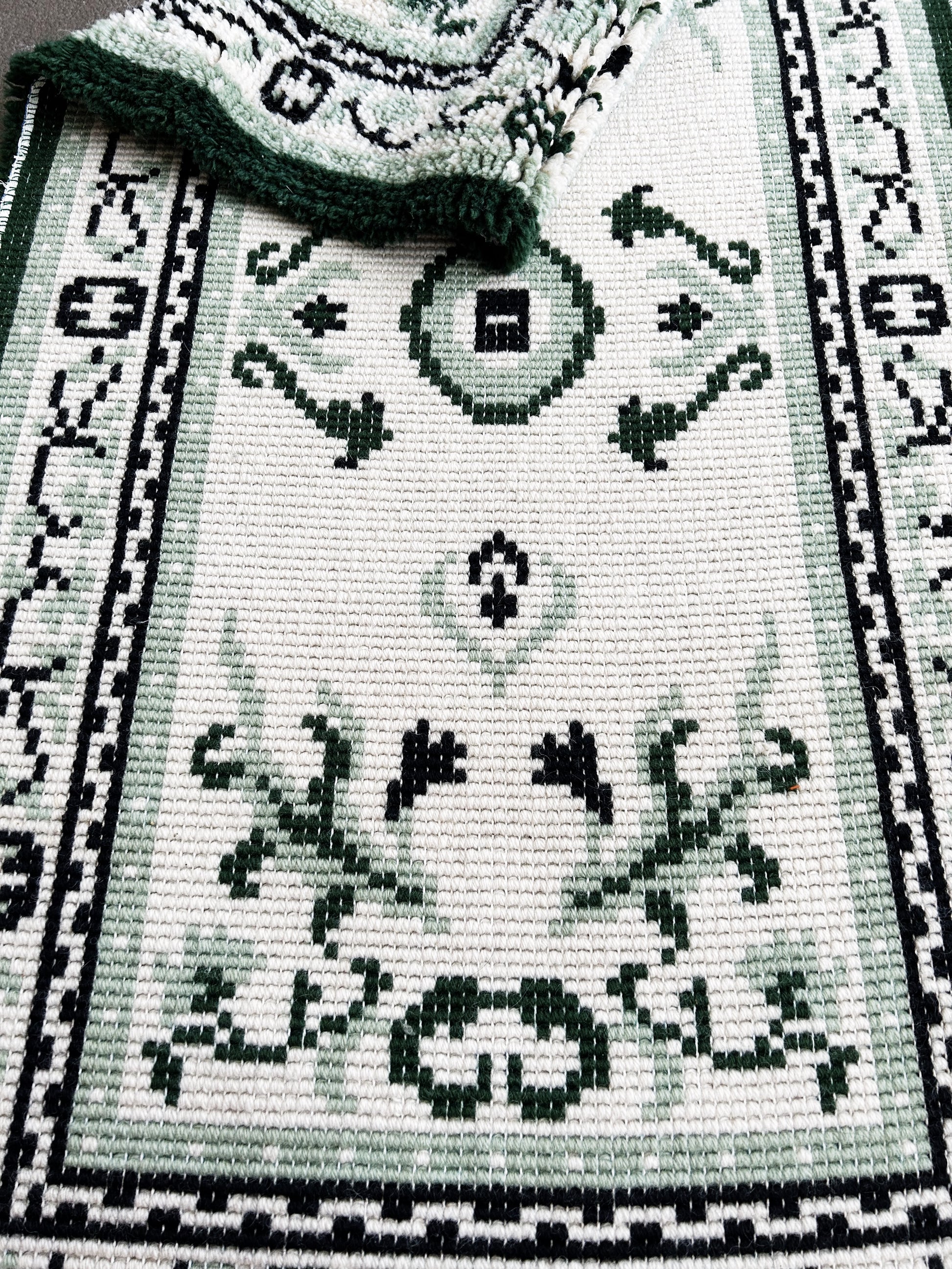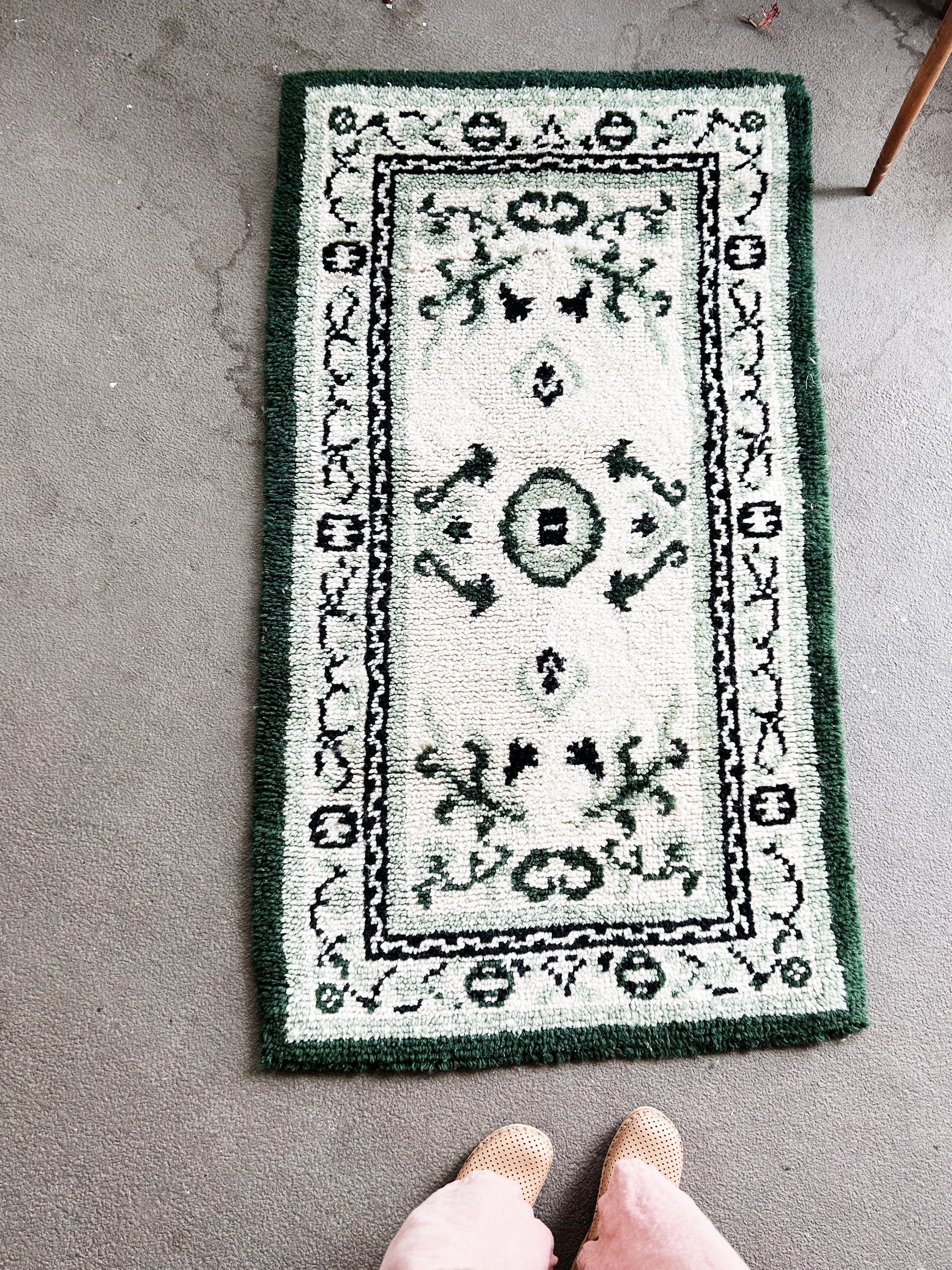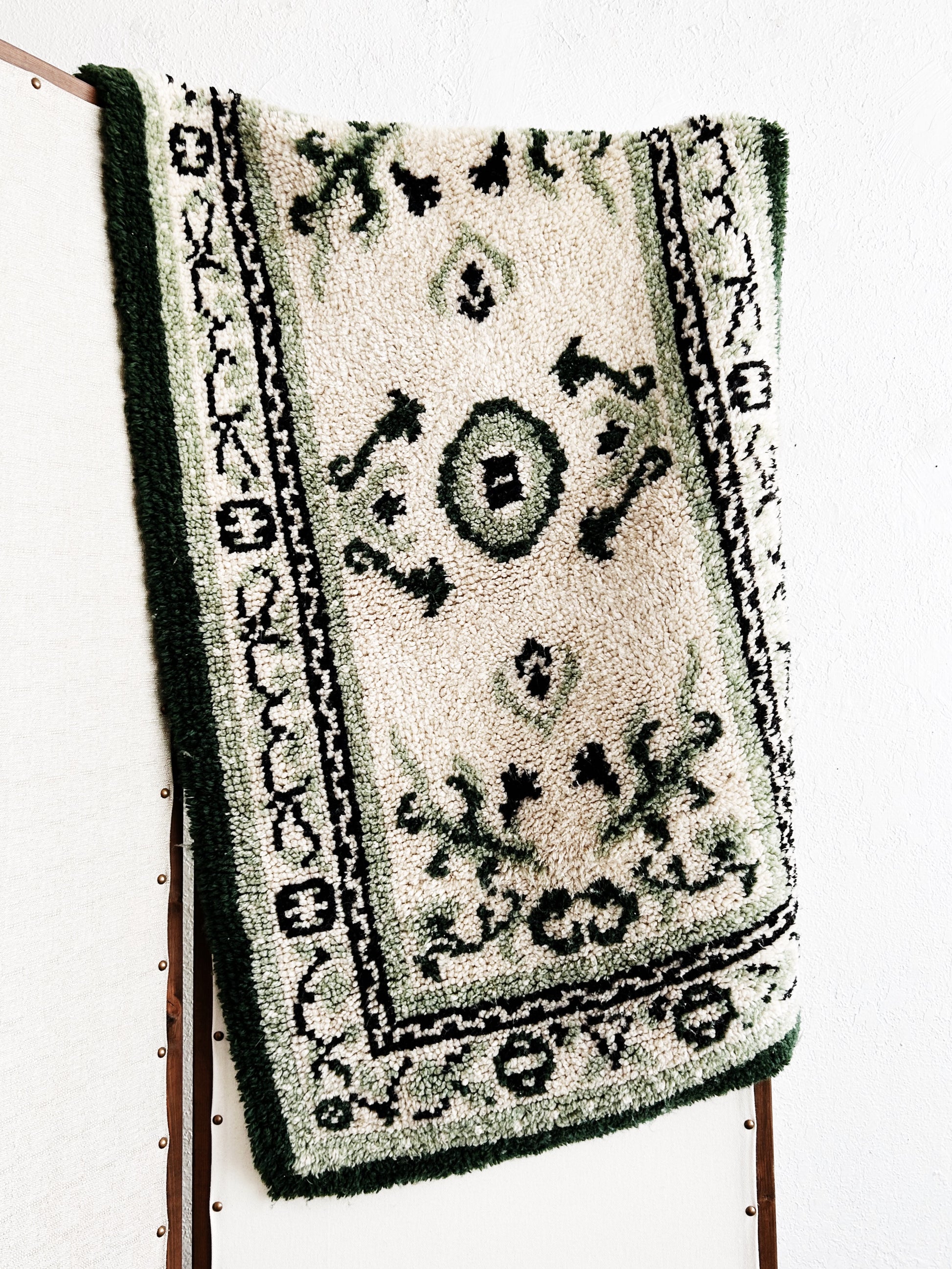 Vintage (1982) handmade Shillcraft latch rug. Love the greens! Dark forest green and lighter sage, on cream background. Plush, well done and in nice shape. A great size for side or end of the bed.